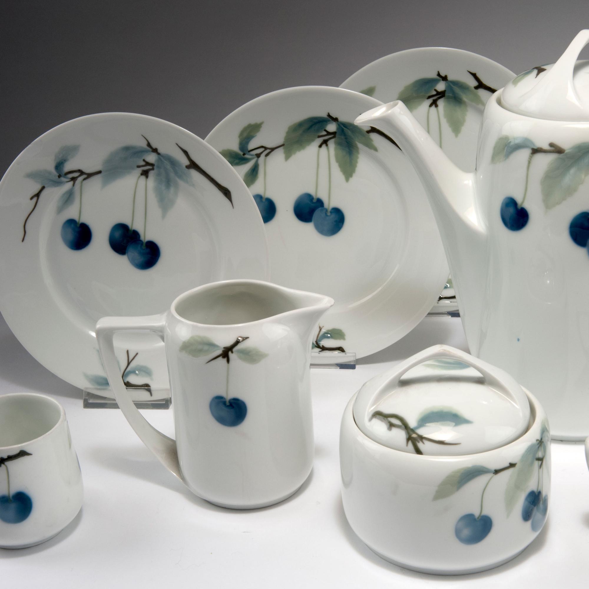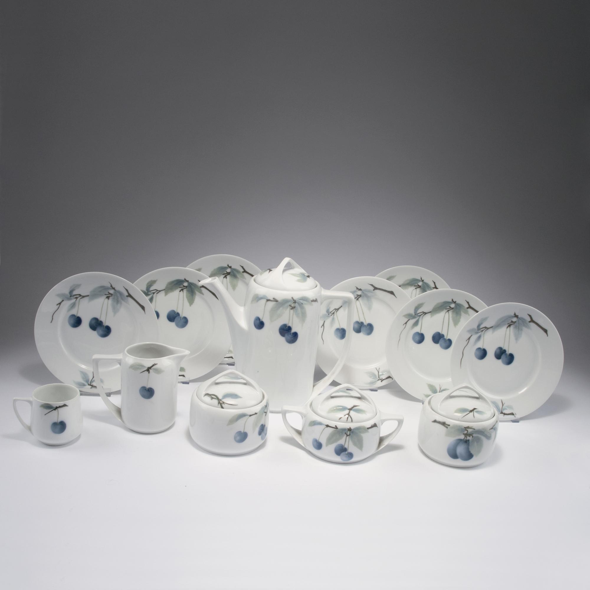 Rosenthal, Selb. 'Donatello' coffee set, c1910. 13 pieces. Coffeepot, H. 24.5 cm; creamer, H. 12 cm; sugar bowl, H. 10 cm; two preserve vessels, H. 11.2 cm; cup, H. 7 cm; 7 dessert plates, D. 19.5 cm. Designed by Hans Günter Reinstein (form) and Julius Vilhelm Guldbrandsen (décor). Made in the 1910s. Porcelain, white, glazed, reliefed pattern 'Pâte sur pâte', cherry branches with fruit and leaves, blue and green underglaze. Marked: Maker's marks (grün, unter Glasur).