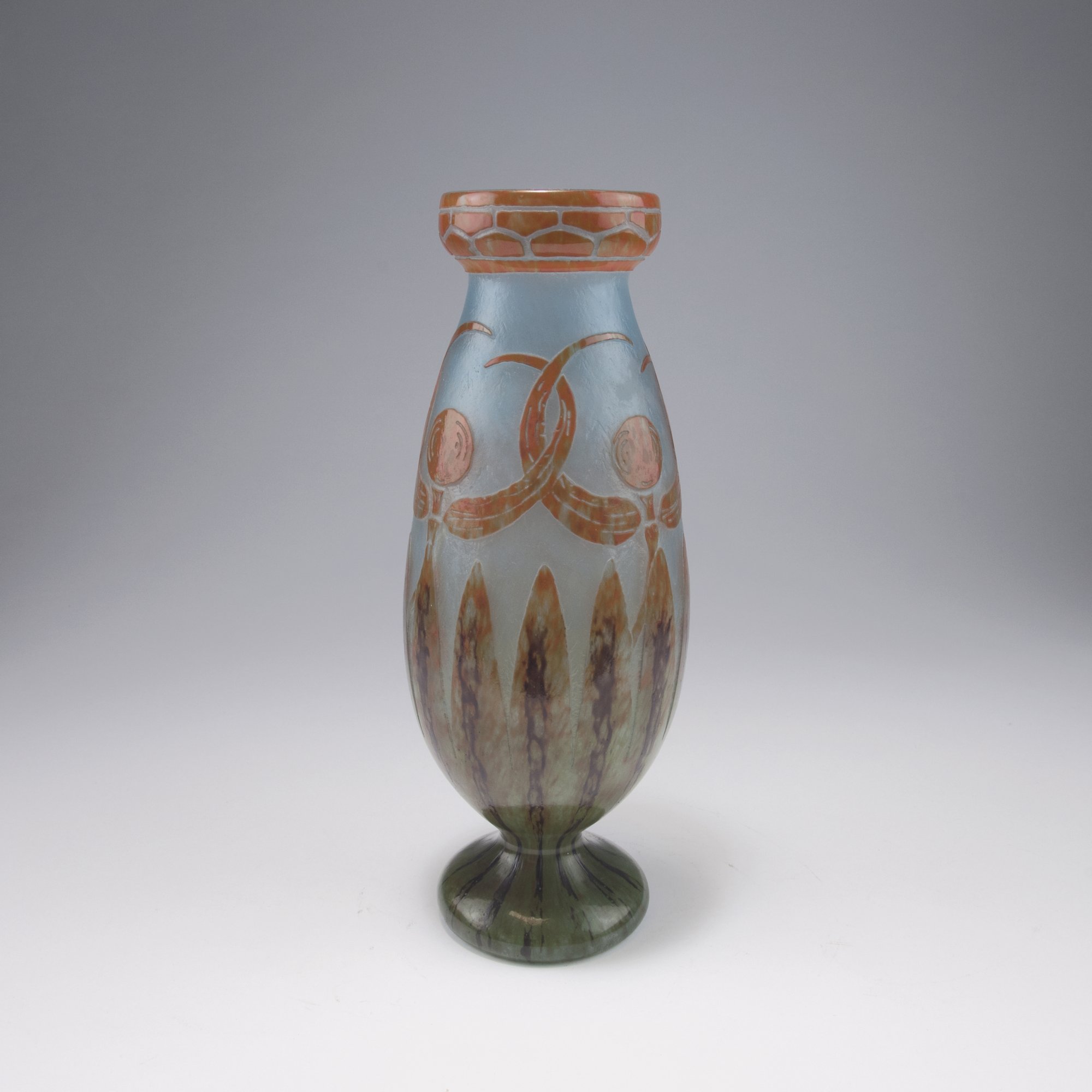 Schneider, Epinay-sur-Seine. 'Libellules' vase, 1919-21. H. 32 cm. Cased glass, clear, blue powder inclusions. Green, orange and purple powder fusions. Multiply etched pattern with stylized dragonflies. Signed: Tricolore thread for Le Verre Français.