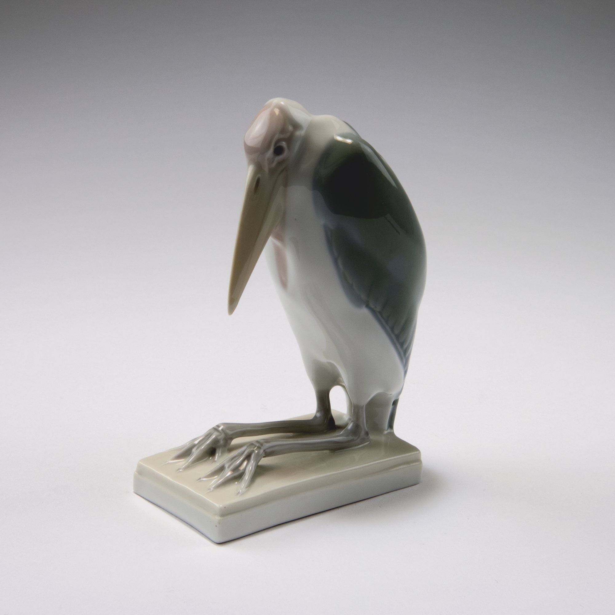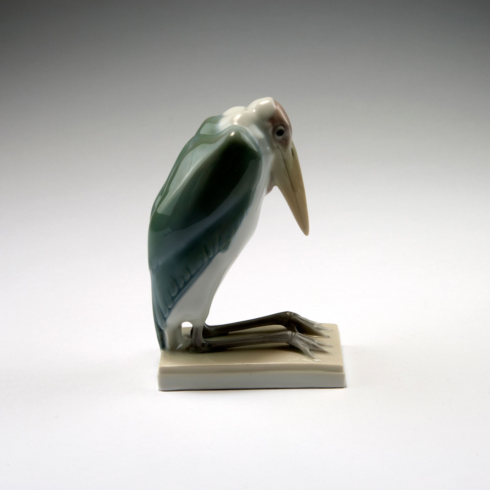 Heubach, Lichte. Sitting marabout, c1910. H. 13.8 cm. Designed by Sigismund Wernekinck. Porcelain, white, glazed, underglaze, grey, pink and beige. Base marked: SW. Bottom: Maker's mark.