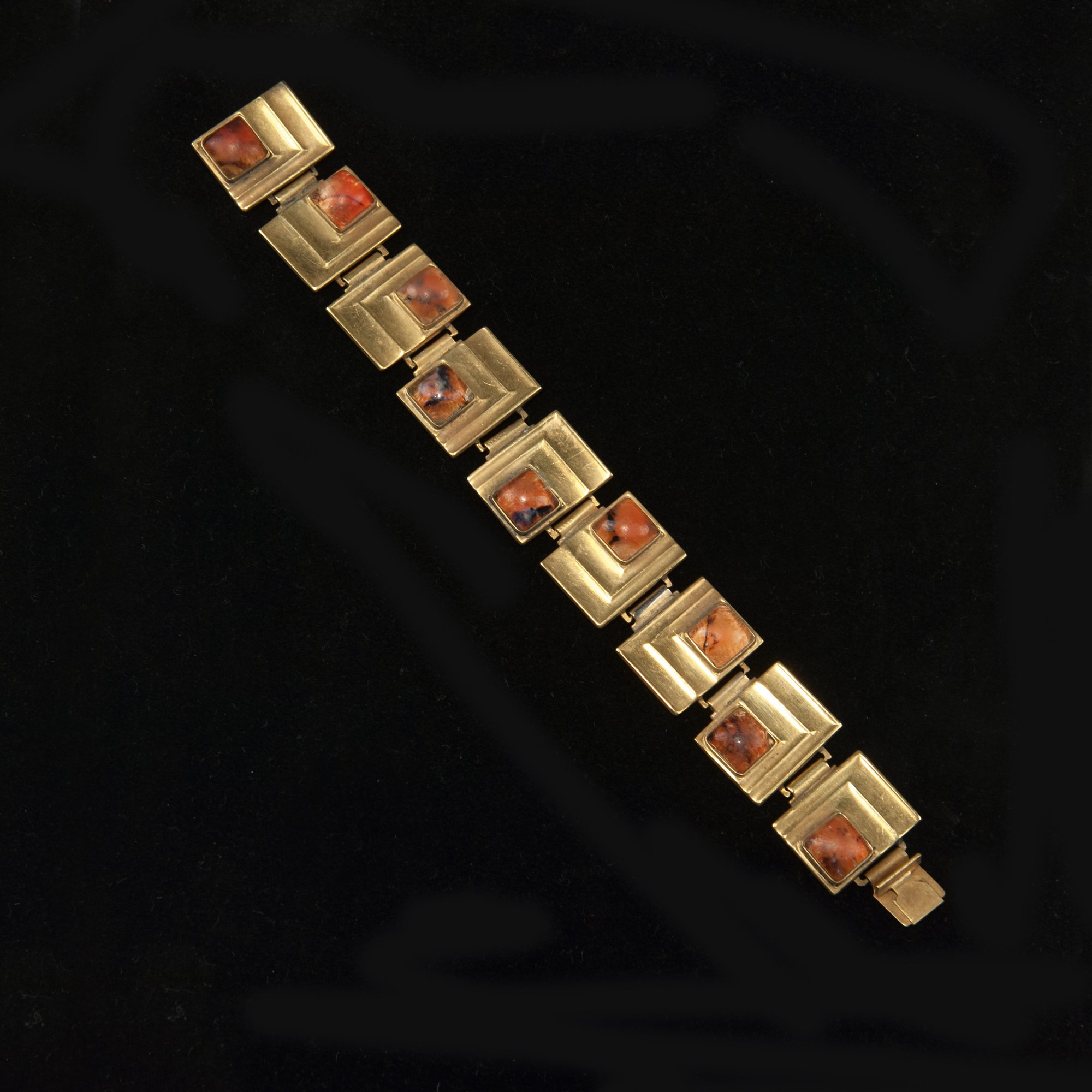 WMF, Geislingen. 'Ikora' bracelet, c1930. L. 18 cm. Gilded metal, glass cabochons, pink and amber with oxide inclusions. Unsigned.