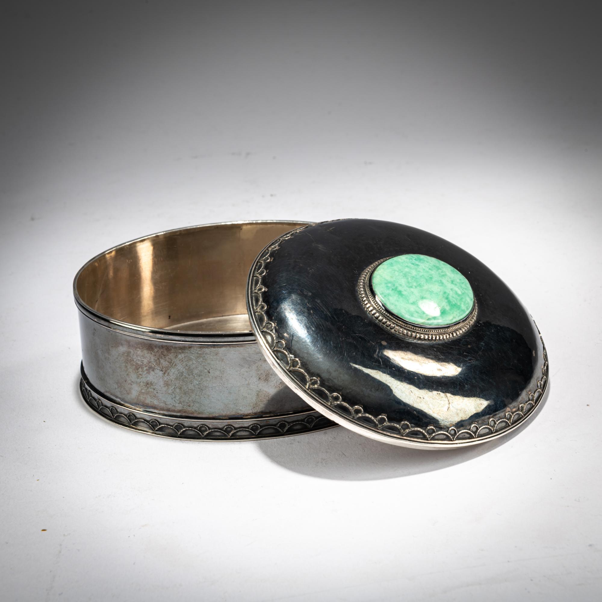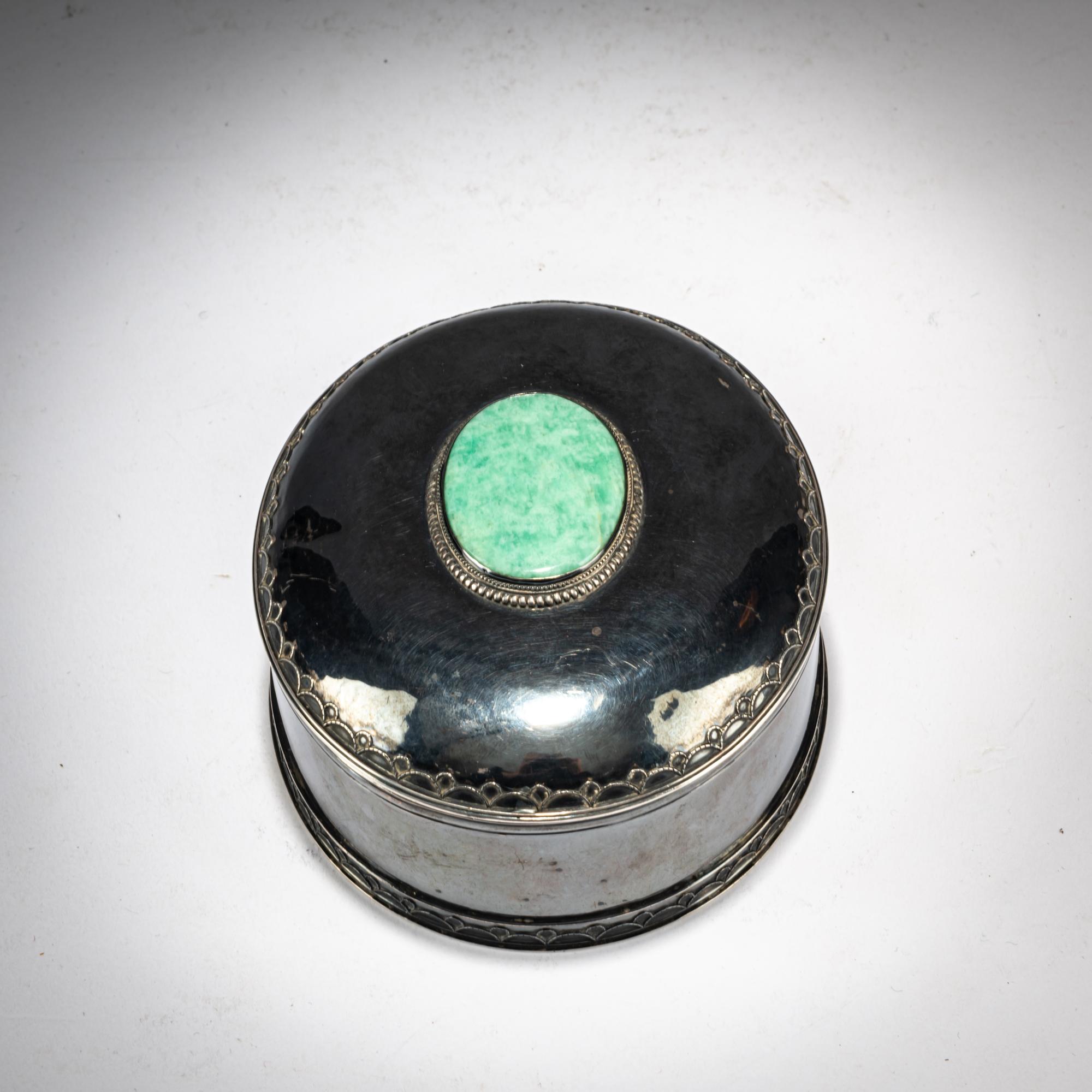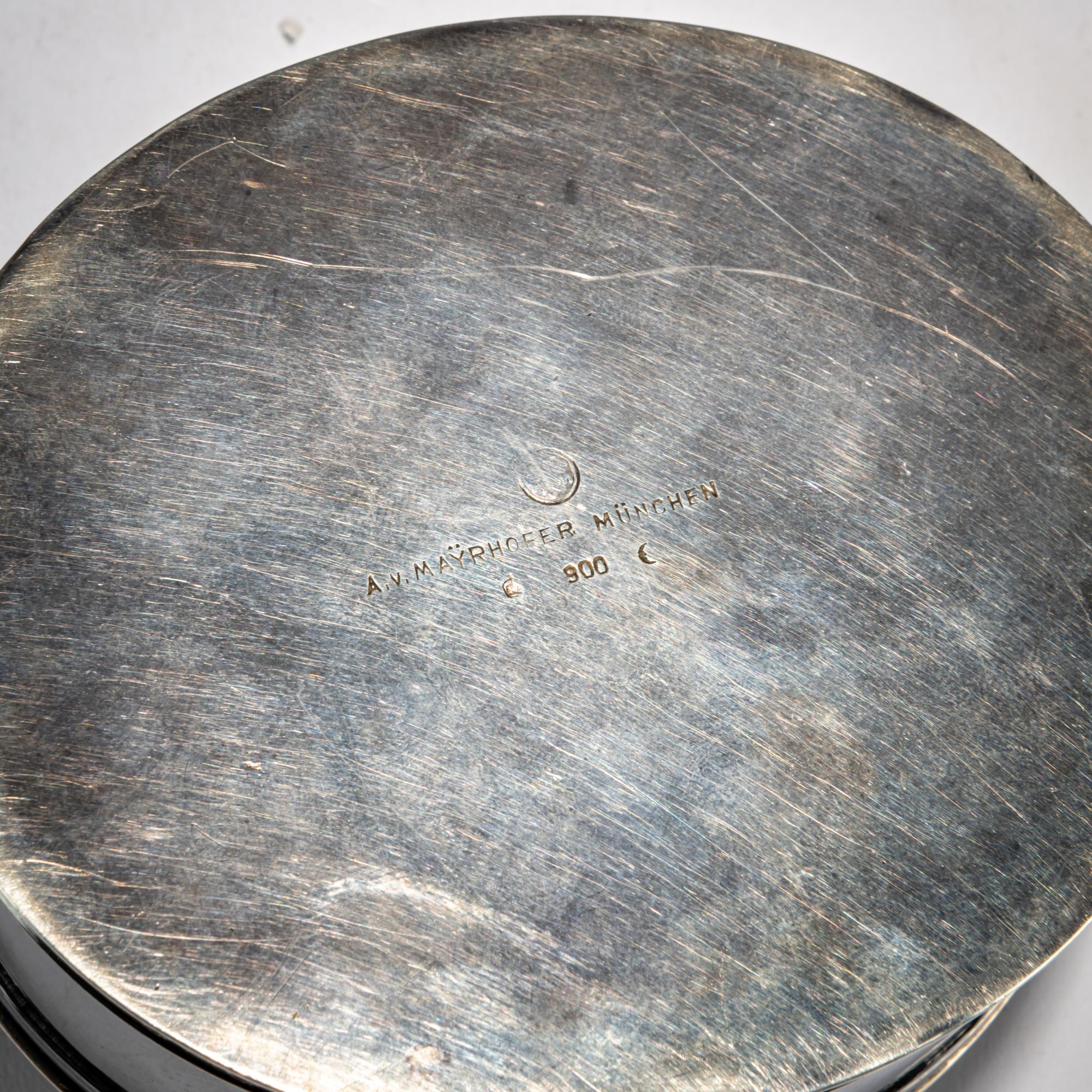 900 silver, jade. 202.53 grams. 5.8 x 10.5 x 9.2 cm. Stamped: Workshop signet, A. v. MAYRHOFER MUNICH, 900 German hallmarks.