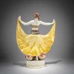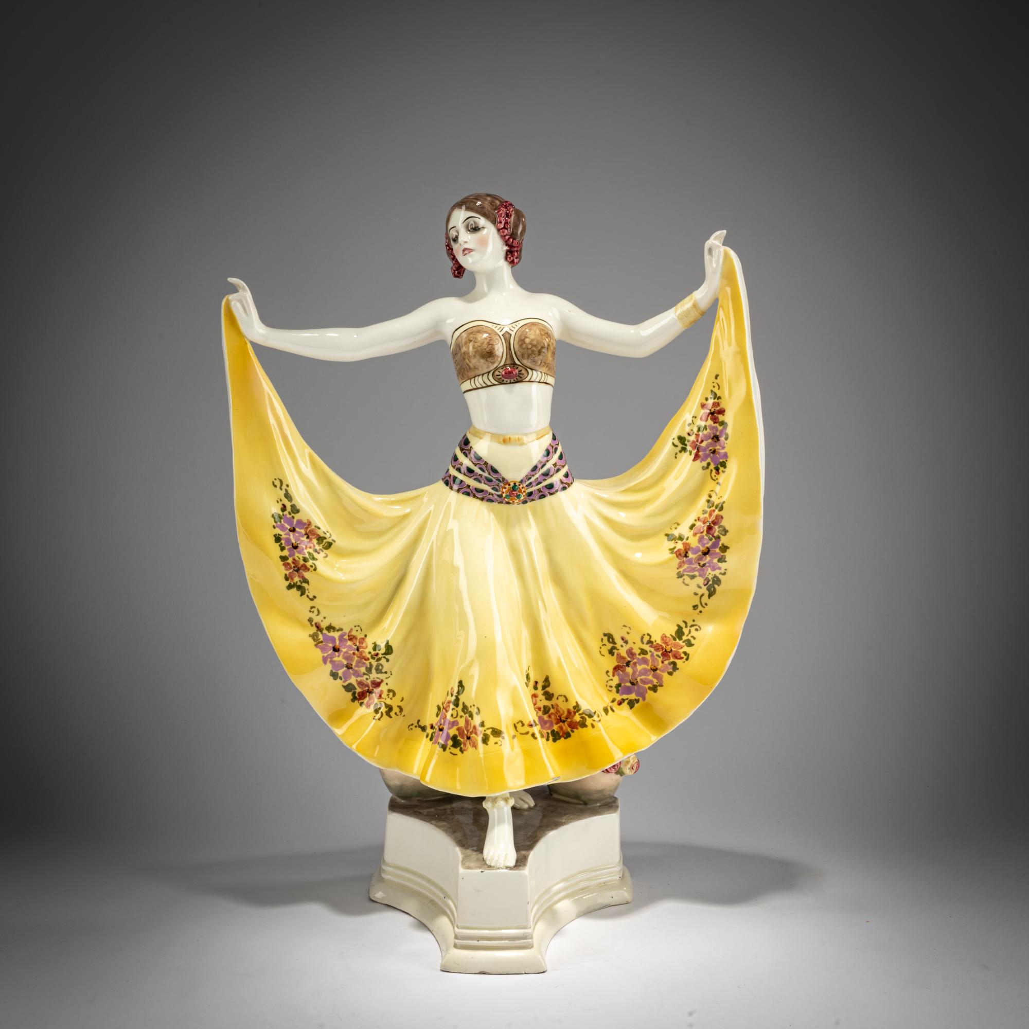 H. 38 cm. Execution: Friedrich Goldscheider, Vienna. Earthenware, polychrome glaze. Base signed: Rosé (embossed). Bottom marked: Goldscheider Wien (black glaze stamp) 4141 451 65 (embossed). F. further handwritten mark (black).
