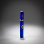 Silver, partially gilt, blue transparent enamel on a guilloché background, numerous diamonds, sapphires, and a garnet. Total weight: 255.72 grams. Execution: Master craftsman August or Väinö Hollming, 1908-16. Stamped inside and outside: Kokoshnik mark 88, workshop signet AH with asterisk, Fabergé in Cyrillic script. The bottom also has an assayer's signet (head, facing right) for smaller objects.