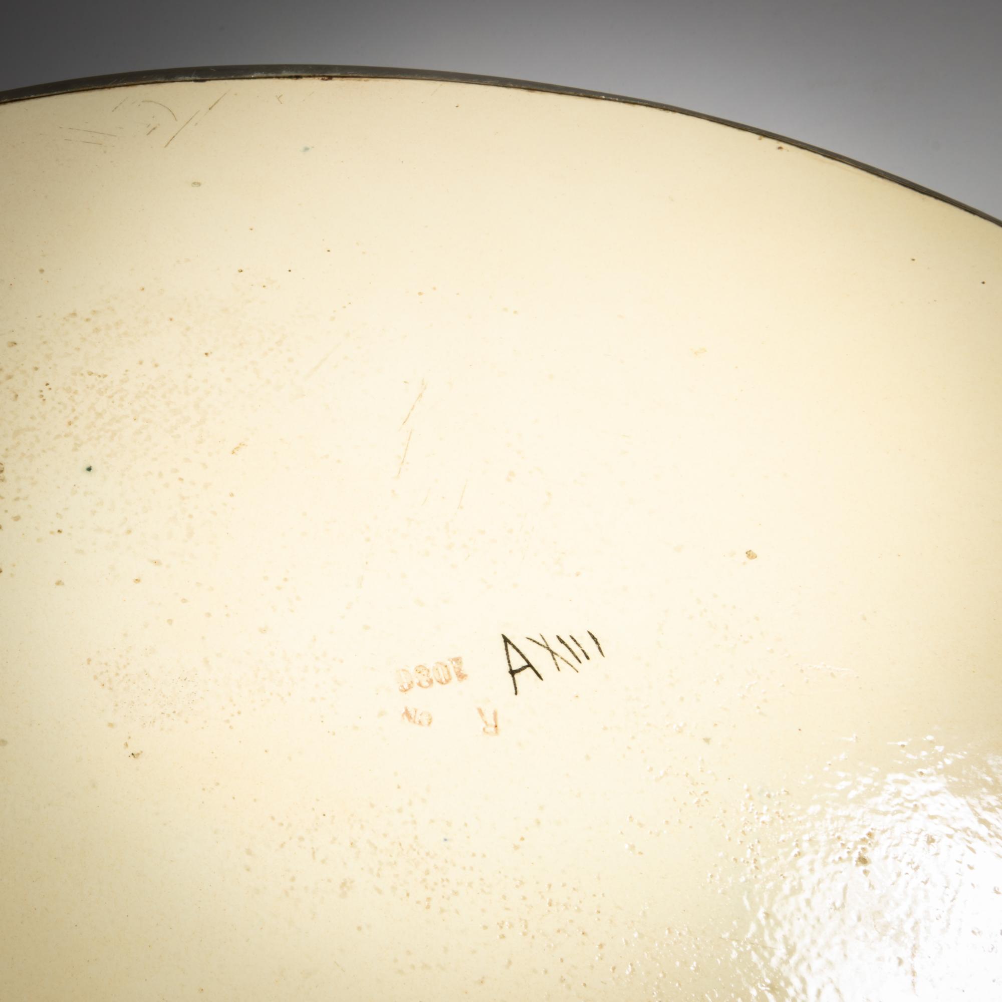 H. 6 cm, 51.5 x 36 cm. Earthenware, thread relief, polychrome glaze. Swan in a pond. Bottom marked: R CN 1086 (stamped), A XIII (black, handwritten). Silver-plated metal mount.