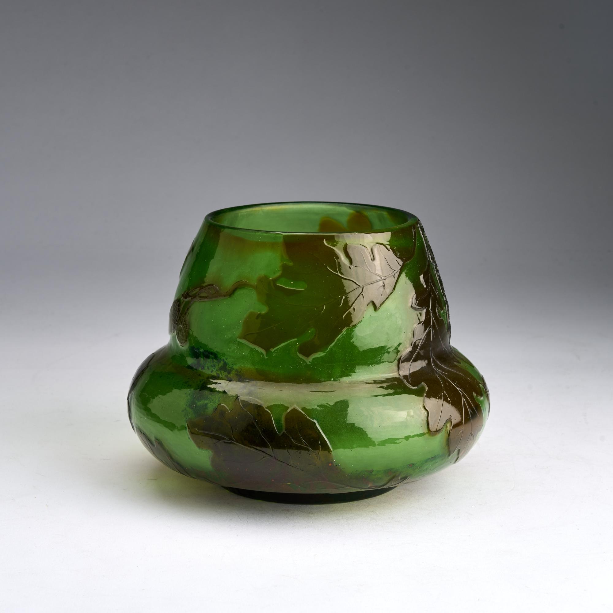 H. 14 cm. Cased glass, bottle green, colorless, and amber; deep blue powder inclusions (salissures intercalaires) between the layers. Etched decoration with oak leaves and fruit, matte-etched interior. Signed: Gallé (raised).