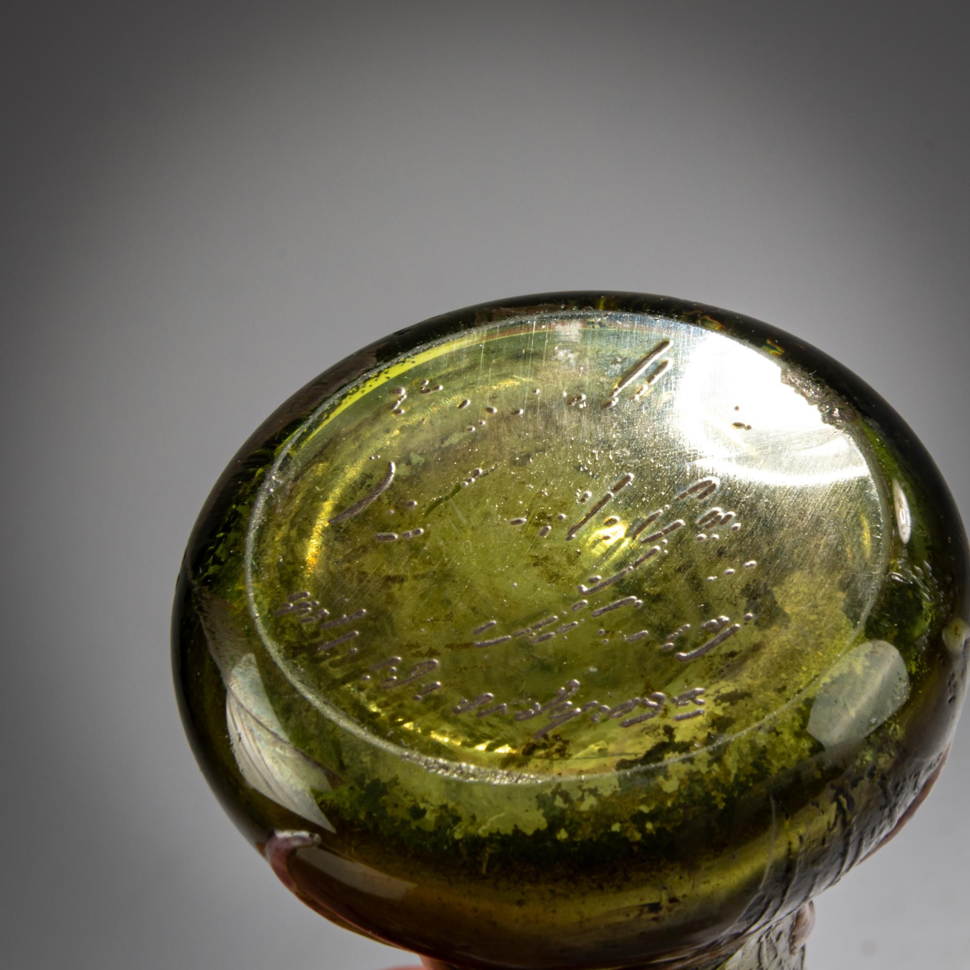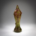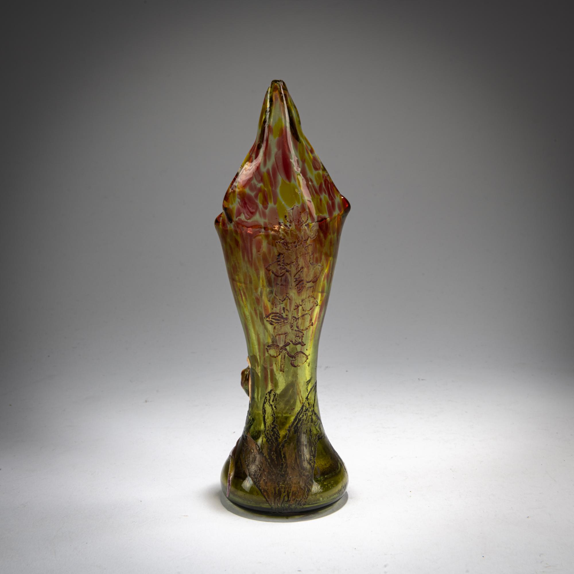 Rolled leaf. H. 15.8 cm. Execution in Meisenthal. Green glass with pink powder inclusions. Etched and enameled decoration with a ragwort (Ophrys apifera), two pistils as applied cabochons, and etched panicles of a common orchid (Orchis), partially violet. Bottom signed: Cristallerie d'E Gallé Nancy model and decor (needle etching).