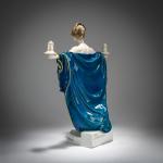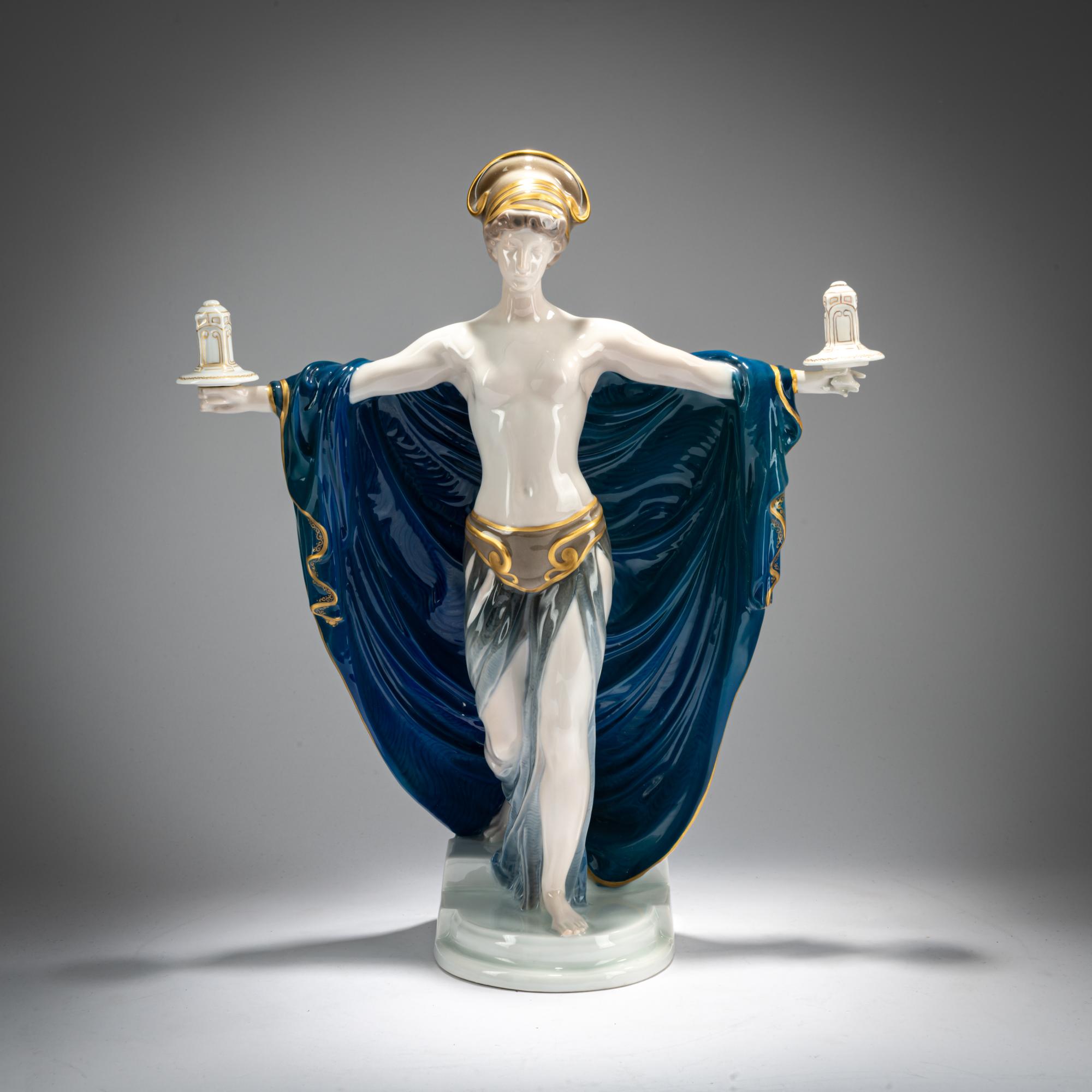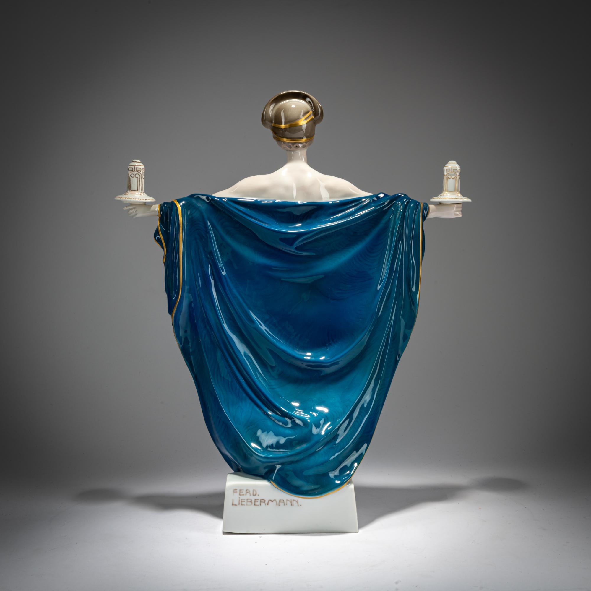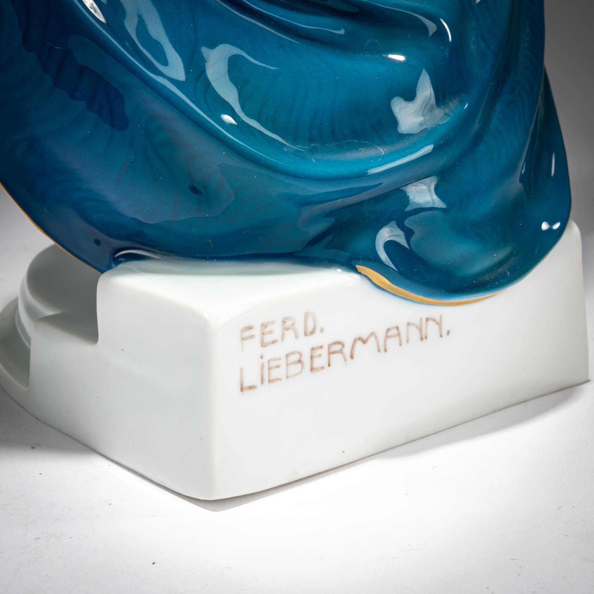 H. 36.5 cm. Execution: Rosenthal, Selb, 1916. White porcelain, glazed, polychrome underglaze with gold. Base signed: FERD. LIEBERMANN (brown). Bottom marked: Diese Modell existiert nur in 200 Exemplaren. Nummer 135, manufacturer's mark, World War I mark 1914-1916 (green stamp), 11 (stamped).