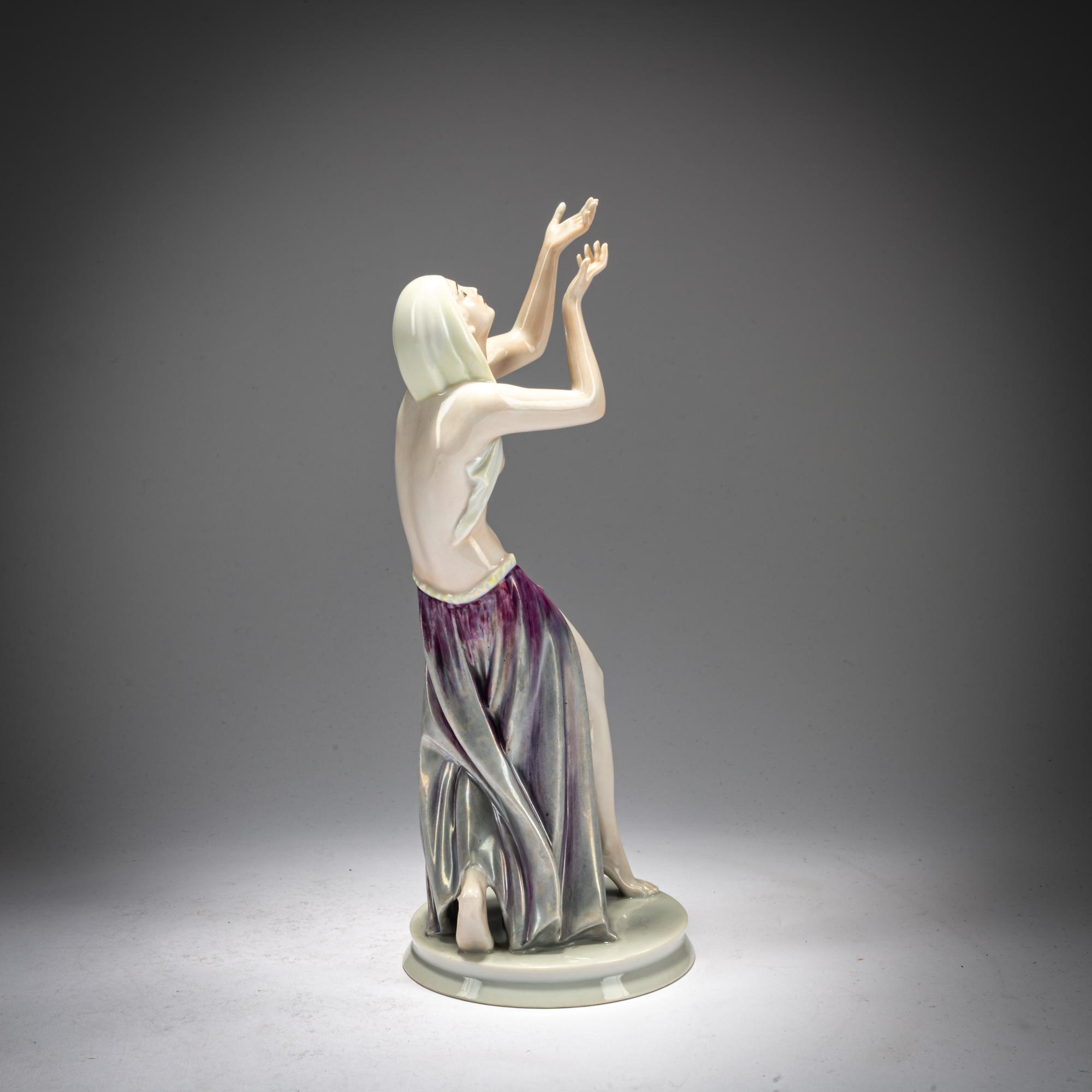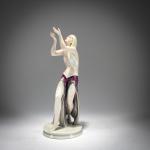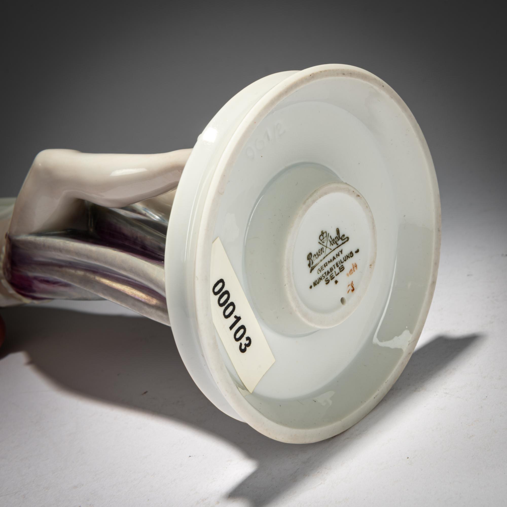H. 24 cm. Execution: Rosenthal, Selb, probably after 1946. White porcelain, glazed, predominantly violet and silver-gray overglaze. Base signed: GO (stamped). Bottom marked: manufacturer's mark (green, underglaze), 961/2 (stamped), 1014 (indistinct), S (brown, handwritten).