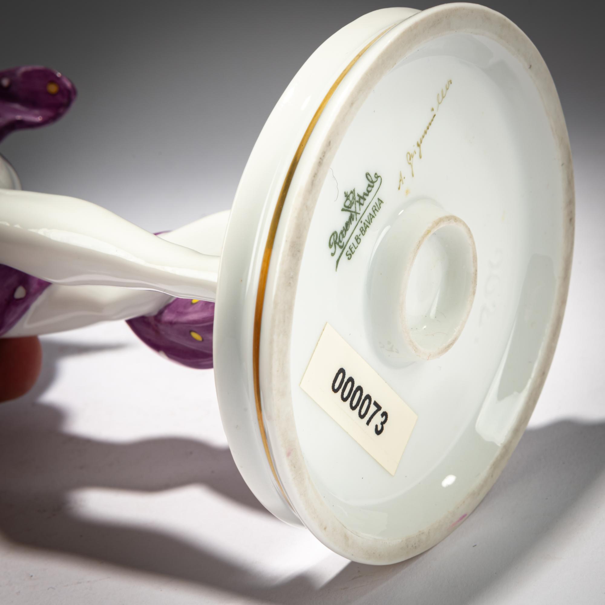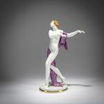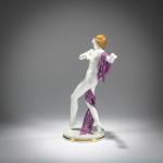 H. 23 cm. Execution: Rosenthal, Selb, 1929. White porcelain, glazed, polychrome overglaze. Base signed: GO (stamped). Bottom marked: manufacturer's mark (green, underglaze), 962 (stamped), A. Geigenmiller (gray, handwritten).