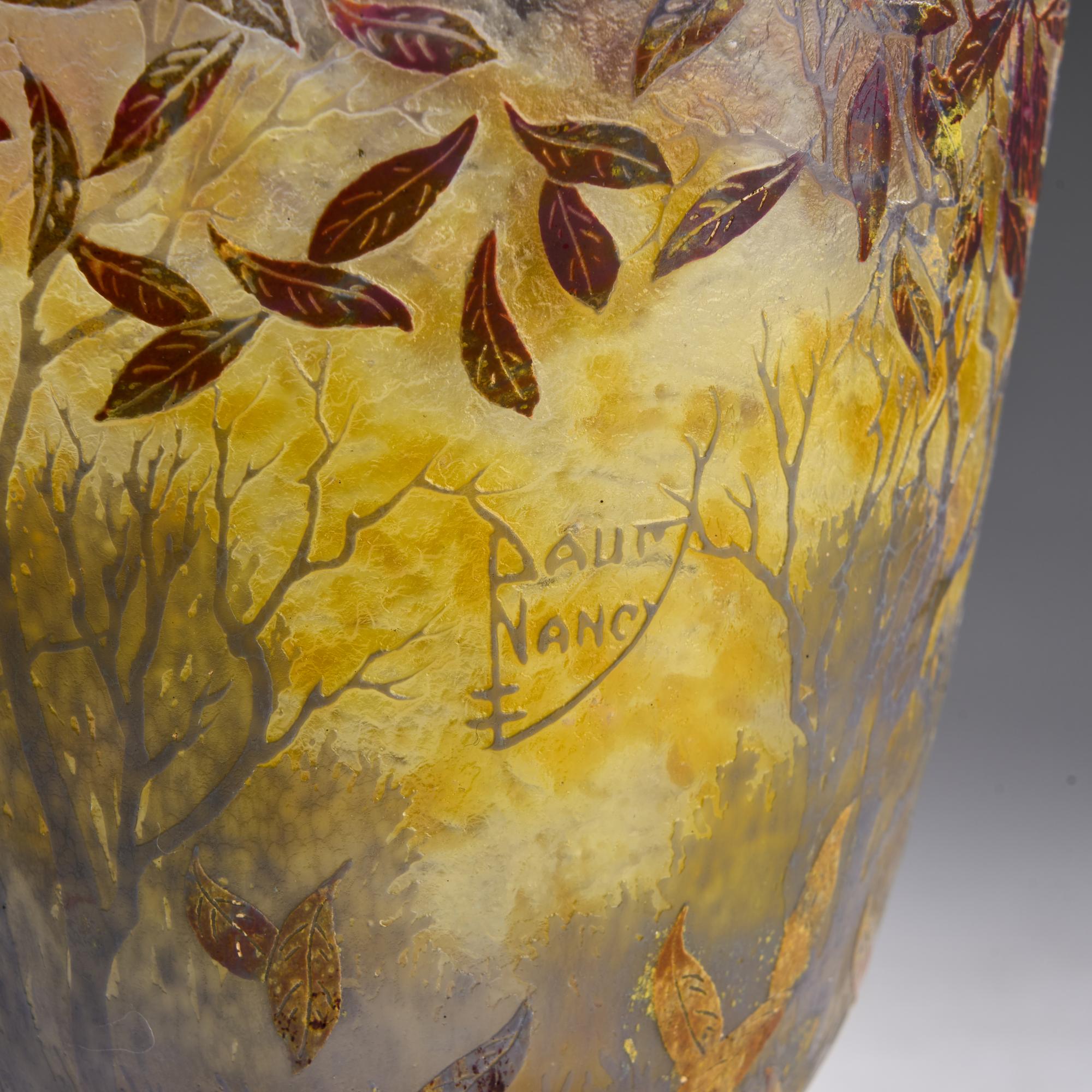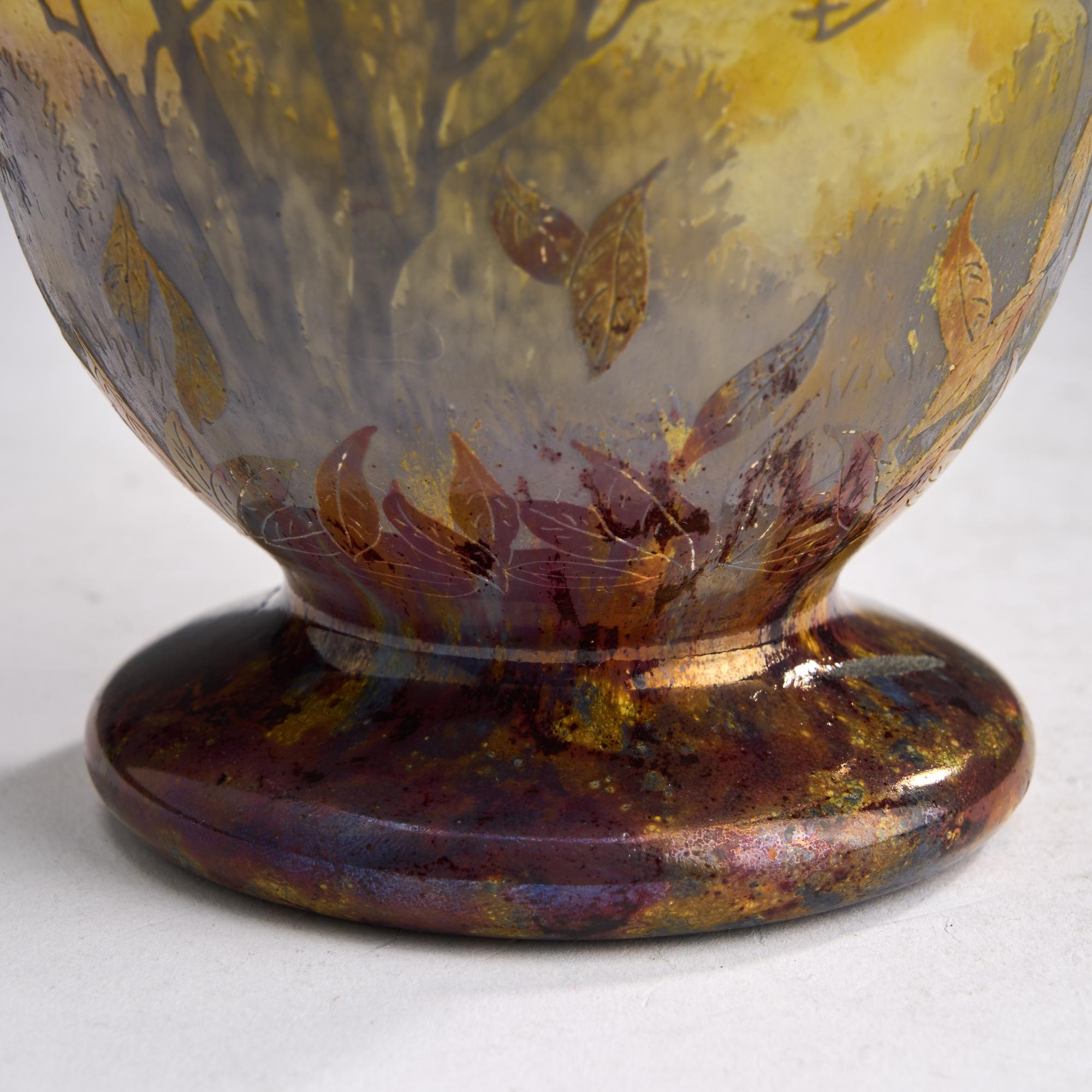 H. 17 cm. Execution: Daum Frères, Nancy. Cased glass, colorless, with greenish-yellow and opal-white powder inclusions, reddish-brown and violet enamel fusions. Etched decoration depicting an autumnal landscape with elms felled by a gust of wind. Signed: DAUM NANCY, Cross of Lorraine (raised).