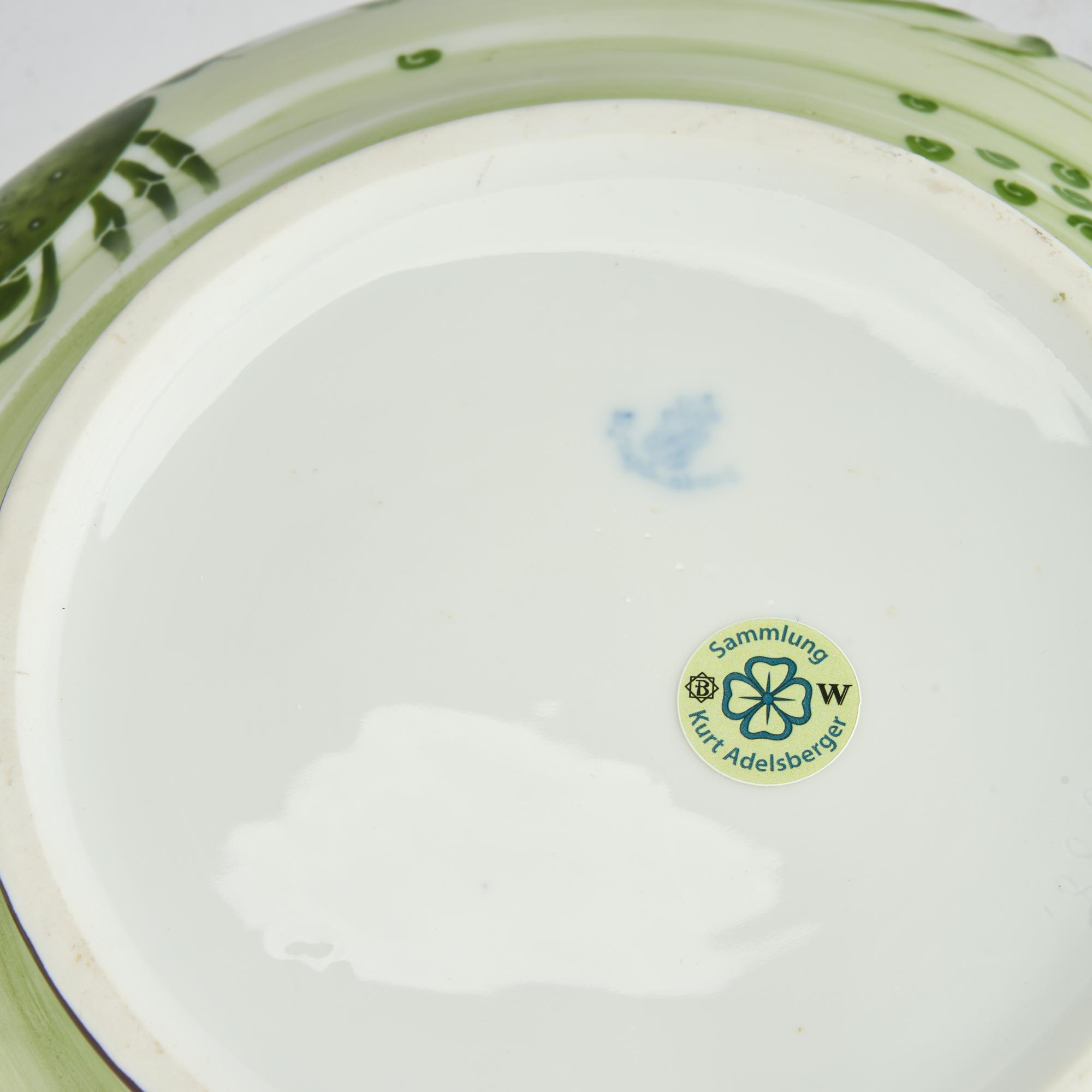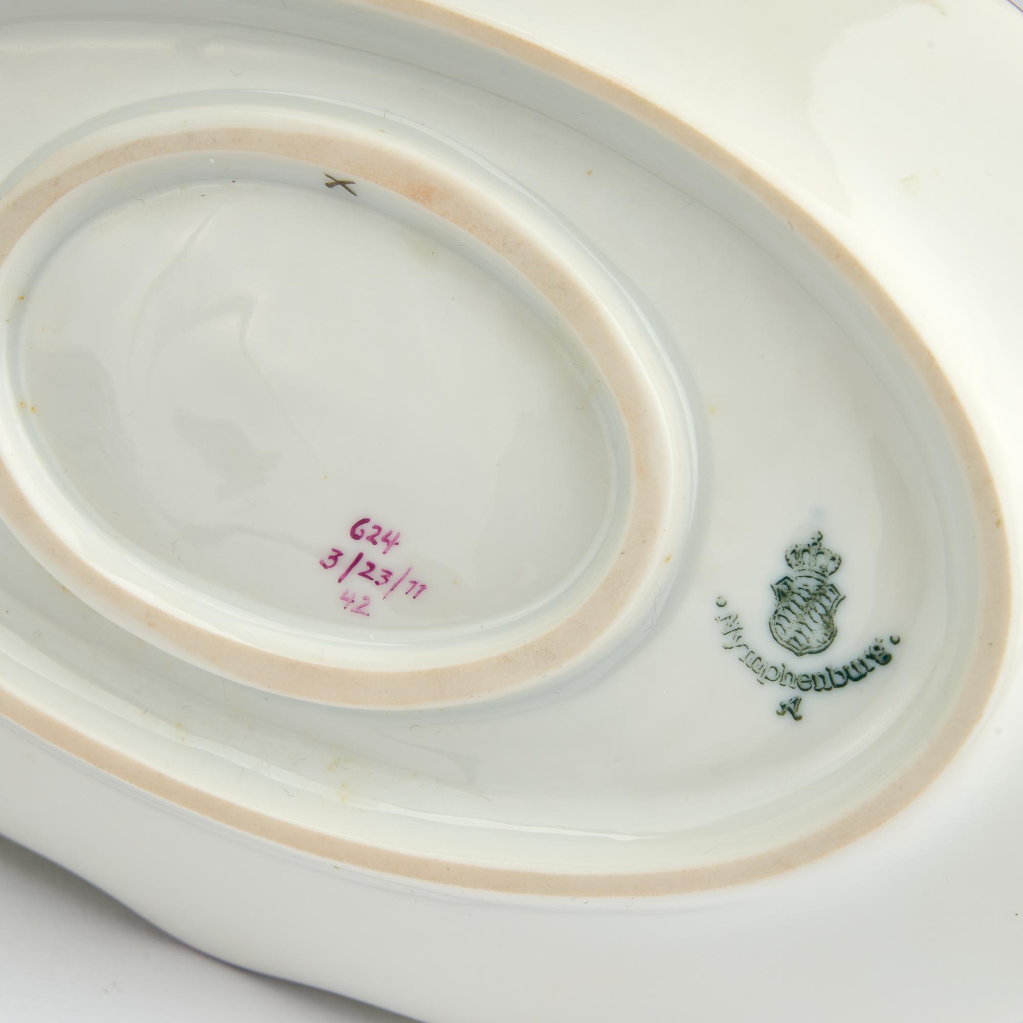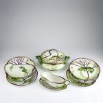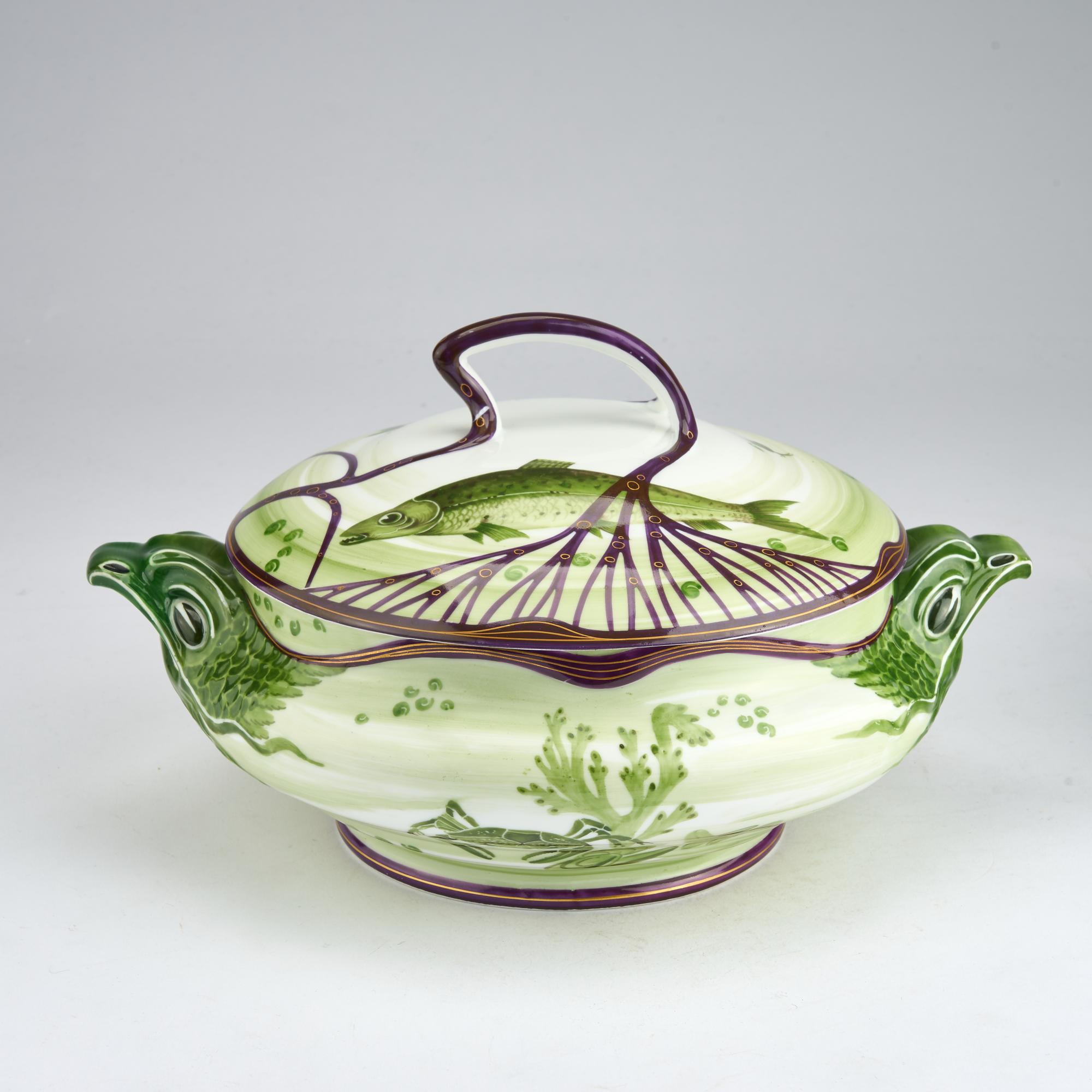 Tureen, sauce boat, and six plates. H. 16 cm, 28.5 x 22 cm; H. 14.8 cm; 27 x 14.5 cm; Ø 23.5 cm. Execution: KPM Nymphenburg. White porcelain, glazed, overglaze in green and violet with gold. Marked: diamond shield, manufacturer's mark (blue, underglaze), and other markings.