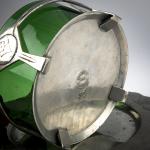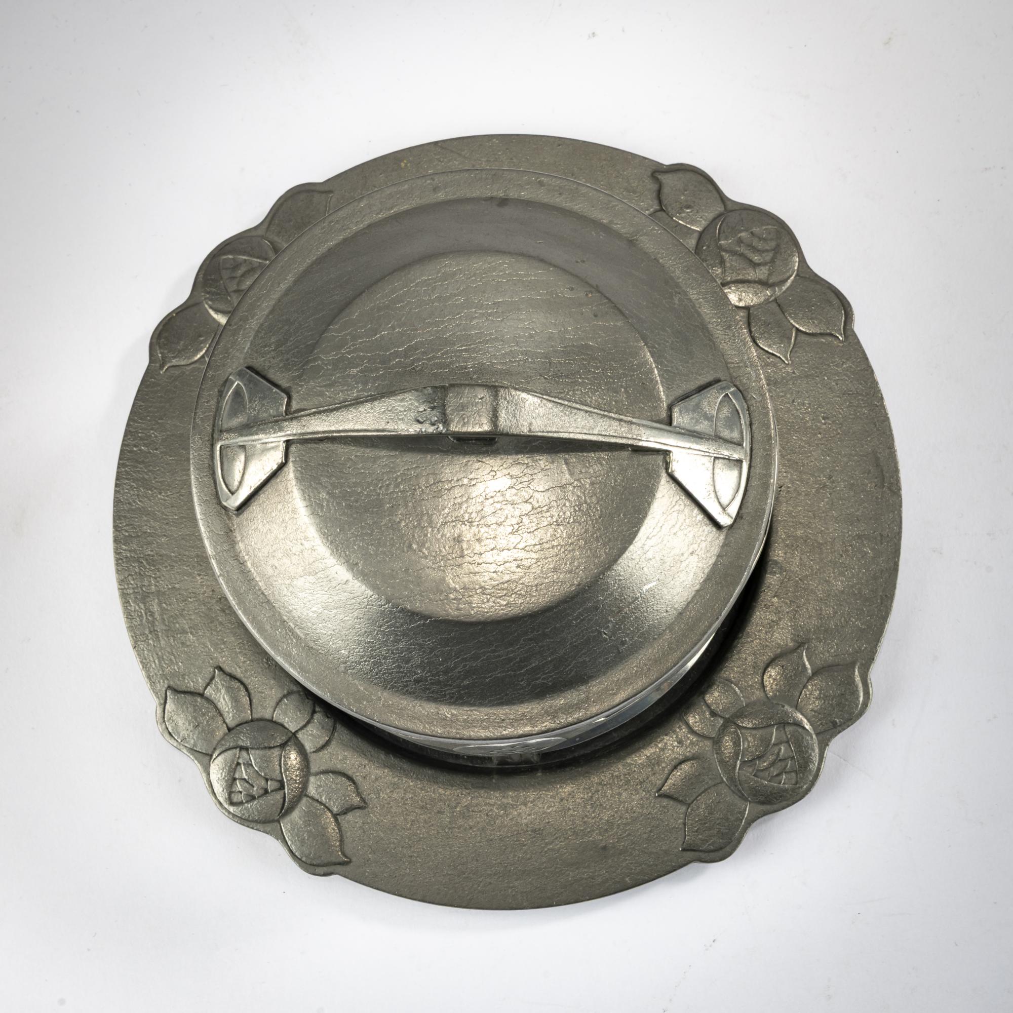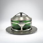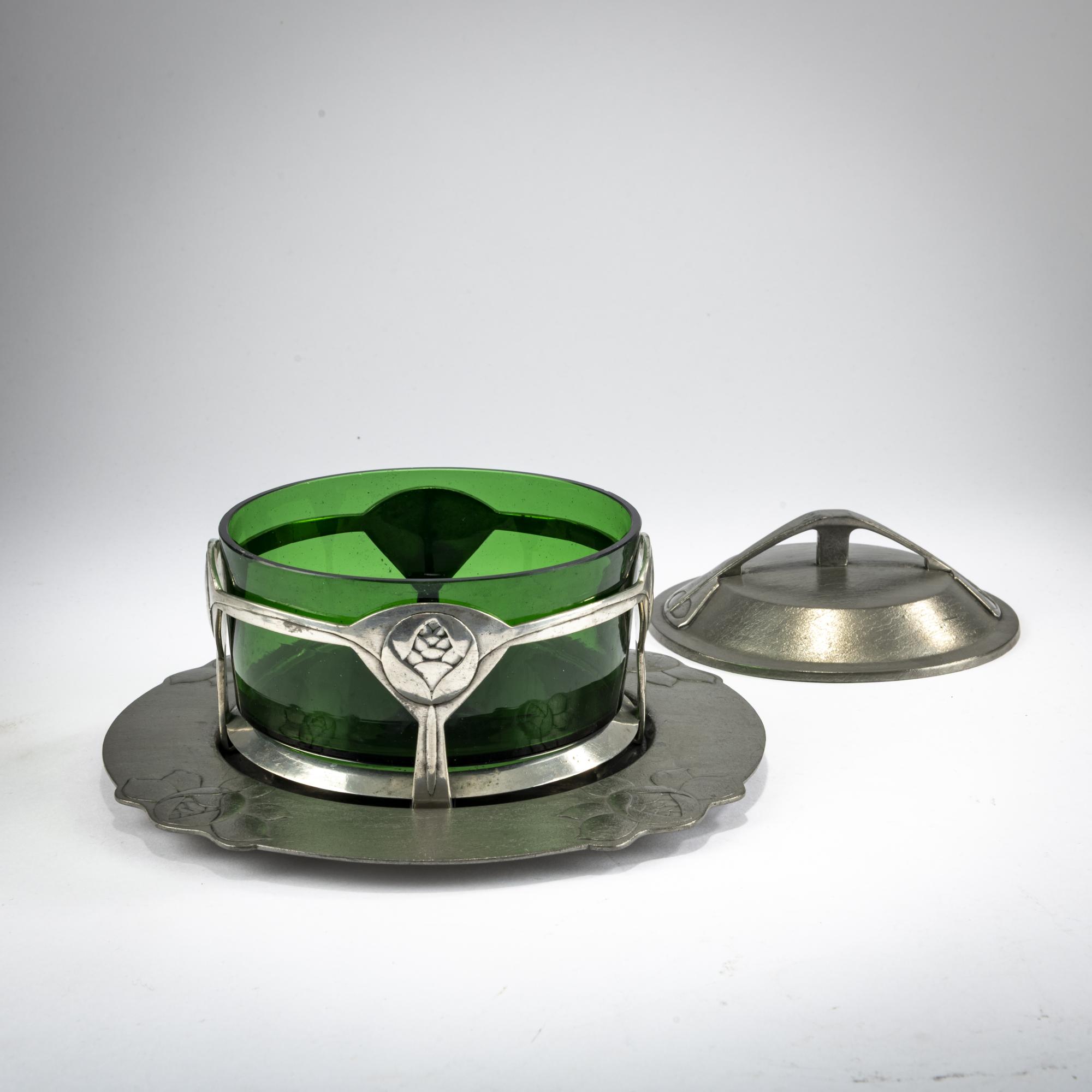 H. 10.5 cm, Ø 13 cm; saucer, Ø 20.5 cm. Execution: Eduard Hueck, Lüdenscheid. Pewter, green glass insert. Bottom marked: EDELZINN 1825 or 1861 E. HUECK, artist's monogram (relief).