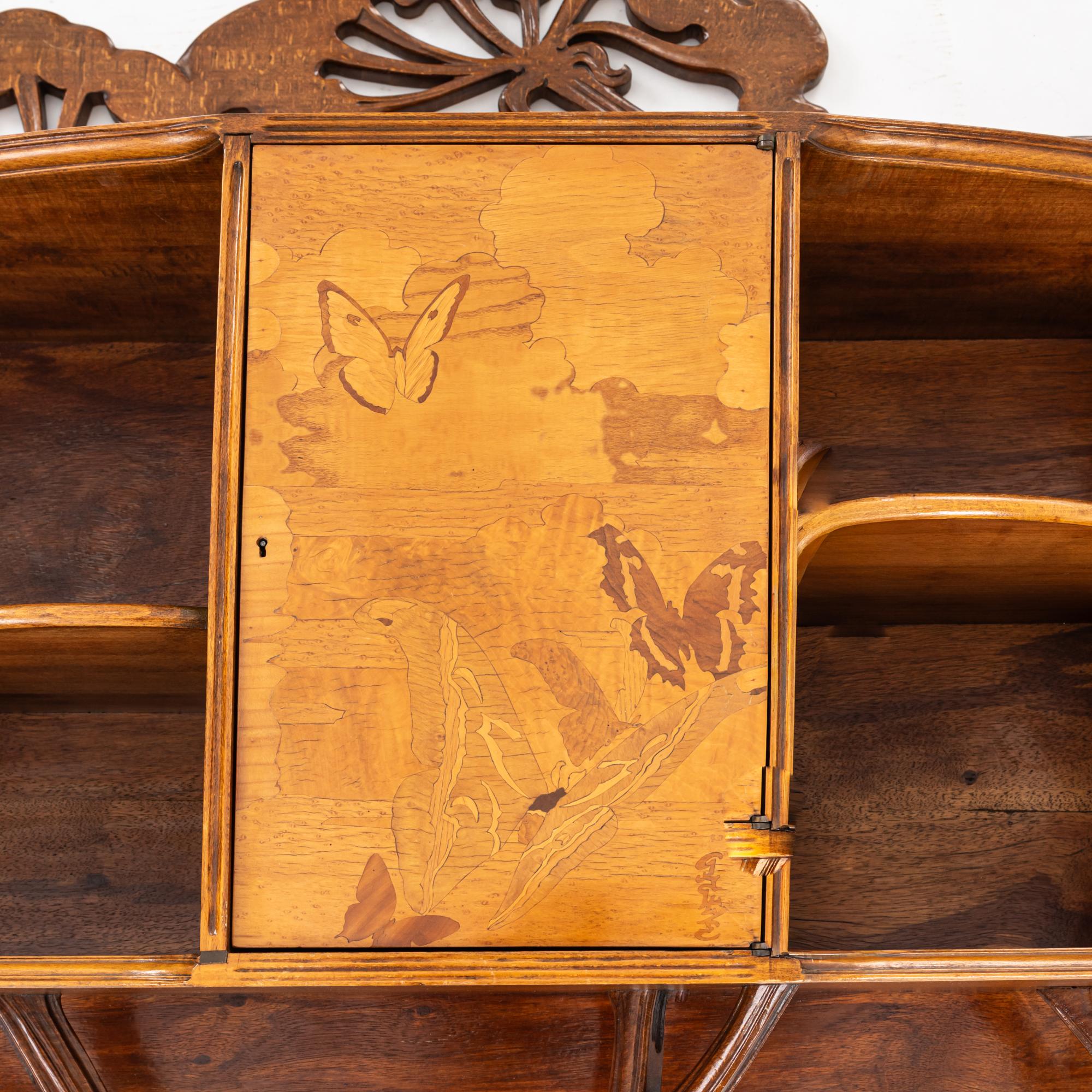 H. 100 cm, 125.5 x 28 cm. Carved walnut, marquetry in various woods. Floral decor with butterflies. Signed: Gallé (inlaid).