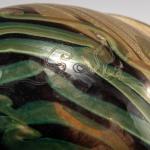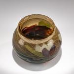 H. 9 cm. Overlaid glass, colorless, with obliquely distorted amber and violet inclusions, fine air bubble inclusions (Patinage). Multicolored marquetry, floral decoration.