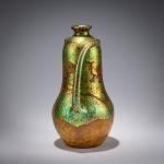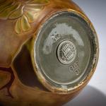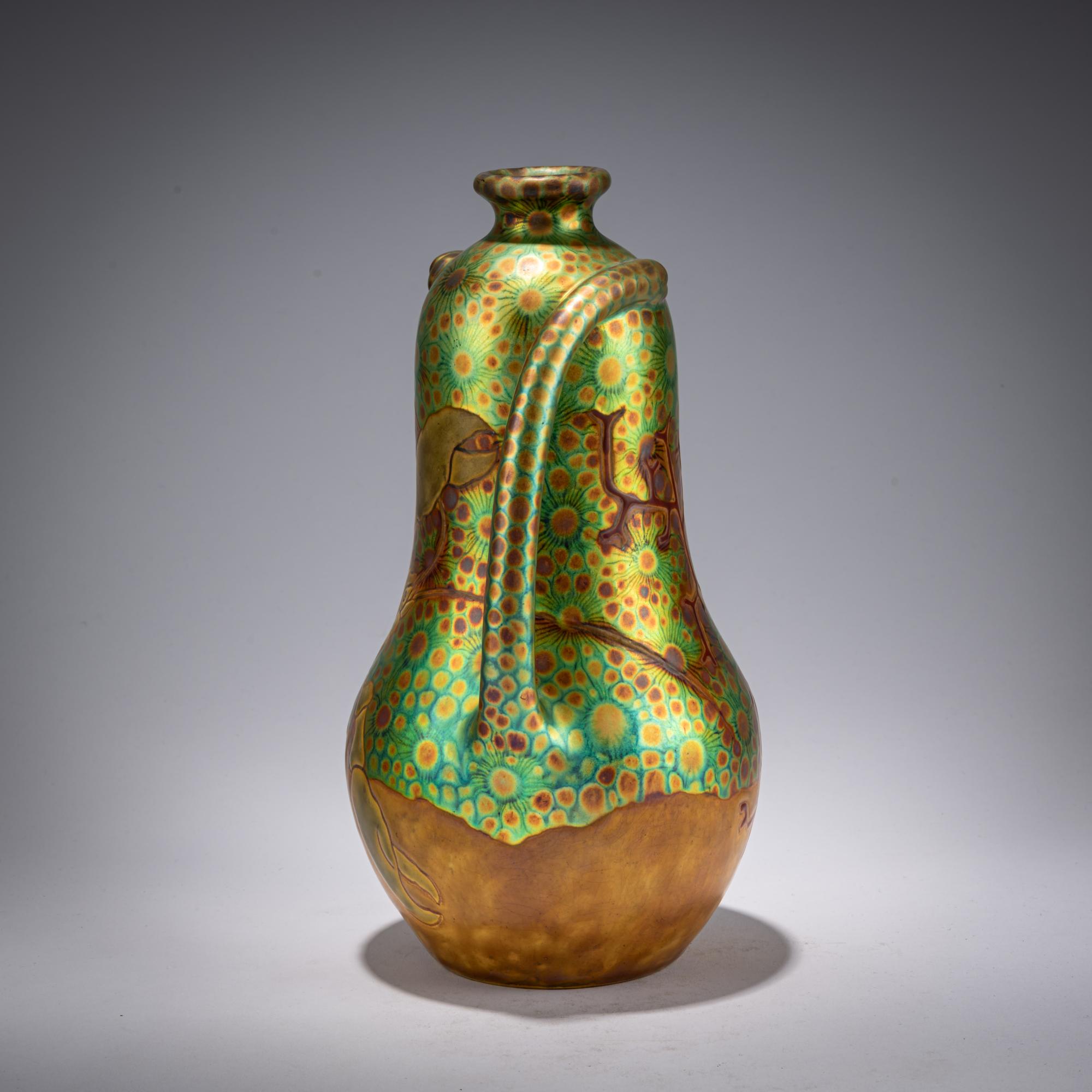 H. 24.5 cm. Execution: Vilmos Zsolnay, Pecs. Earthenware, polychrome eosin glaze. Incised decoration with a lobster on a stylized floral background. Bottom marked: Seal mark ZSOLNAY PECS, M 6177 23 (embossed).