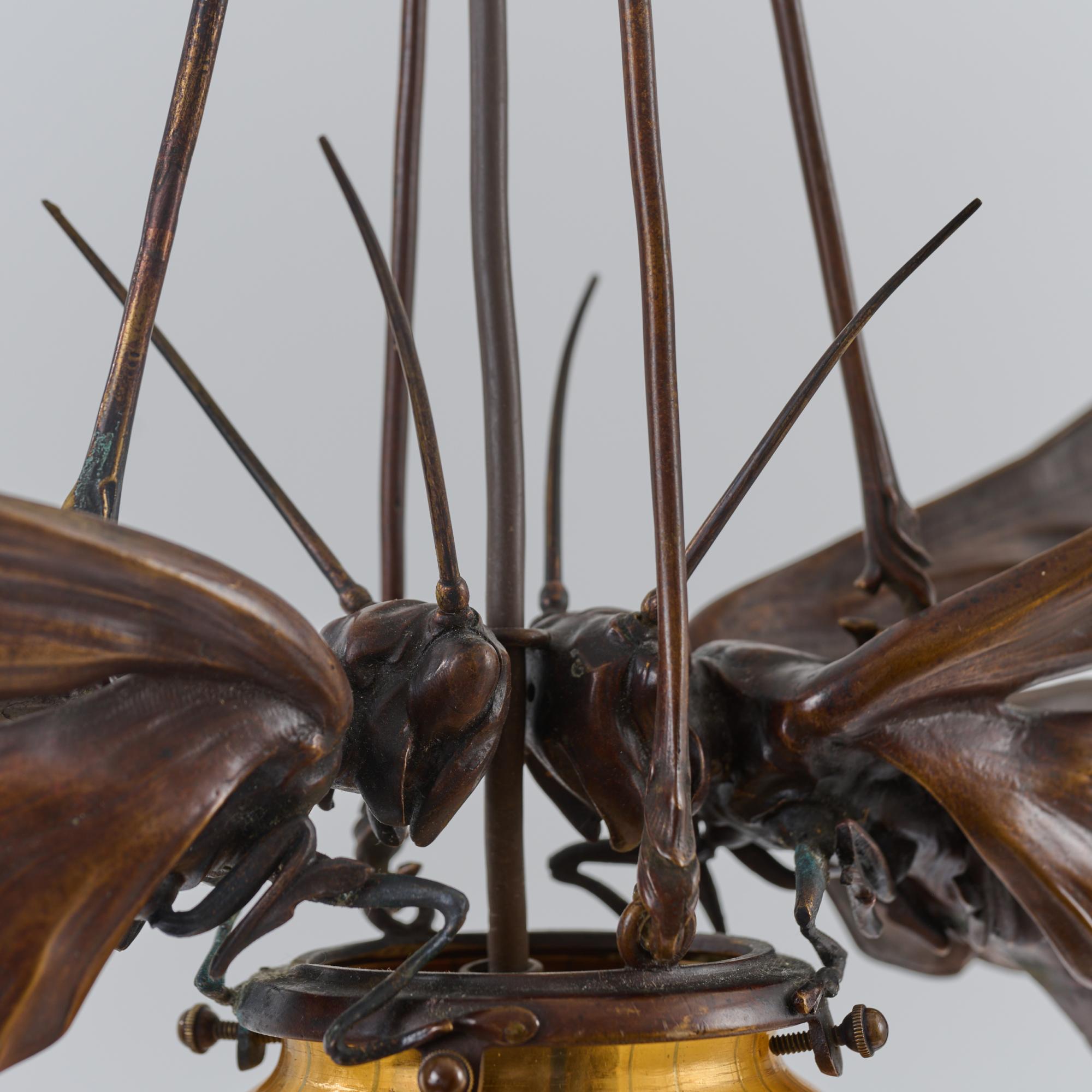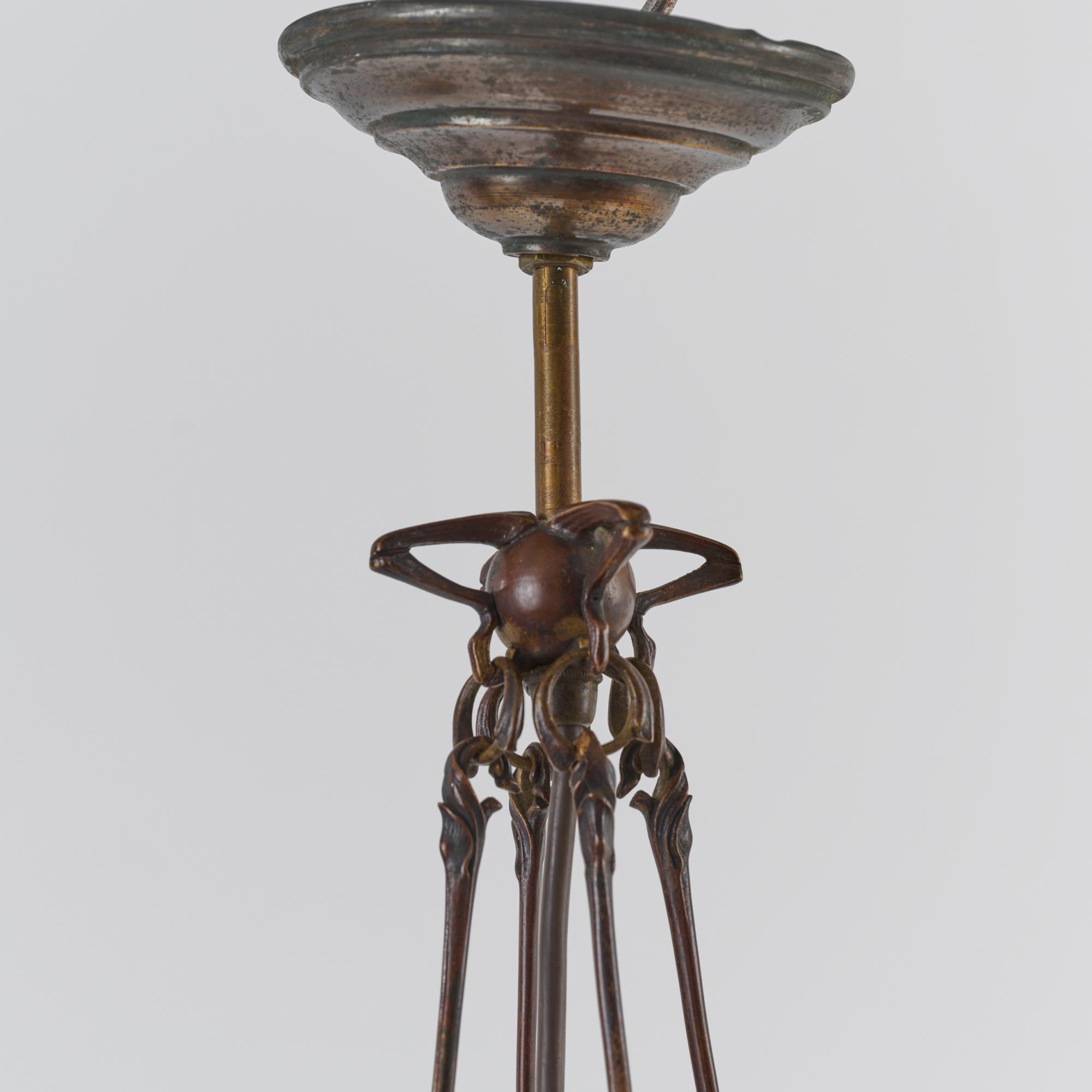 H. 69 cm. W. 58.5 cm. Bronze, dark patina. Shade made of orange glass with fused blue stripes and spots, strongly matte gold and pearlescent luster.