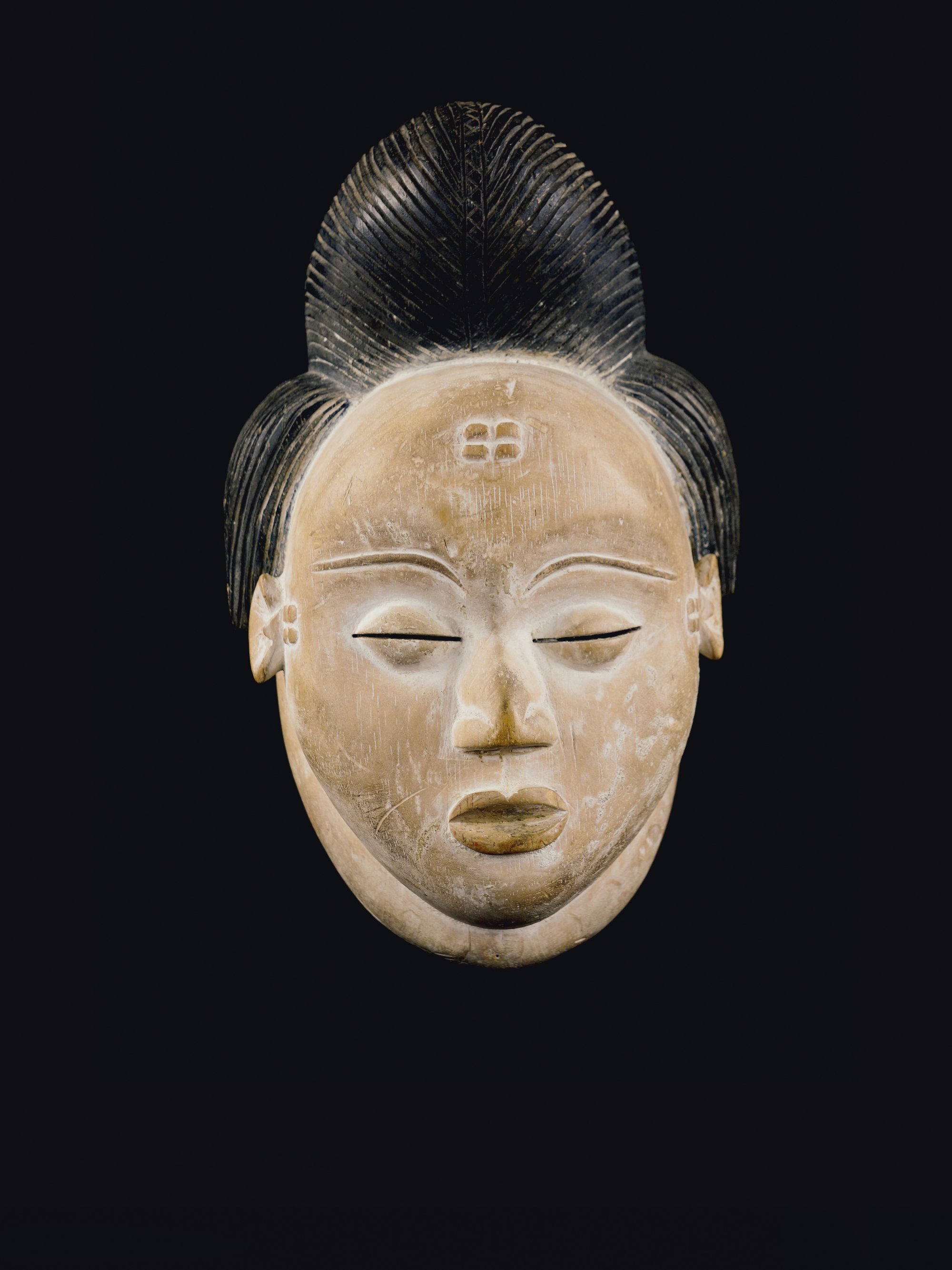 White mask of a dead woman's ghost. High, black-dyed coiffure. Scarification marks on the forehead and temples. Two holes at the edges of the mask.