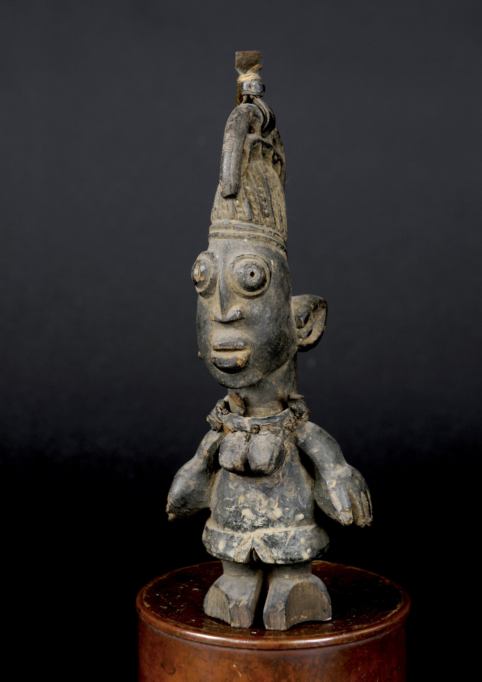 Wood, leather strings. Residue from clay on body and coiffure. Dark patina from smoke.