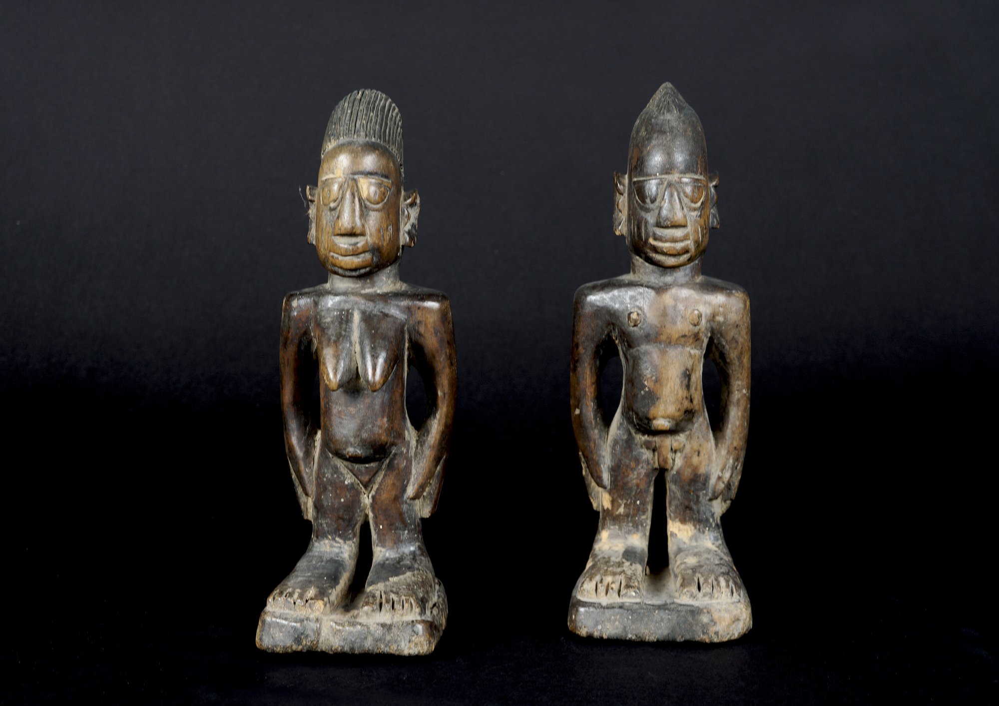 Standing on quadratic pedestals, differing hair styles, scarification marks on cheeks.