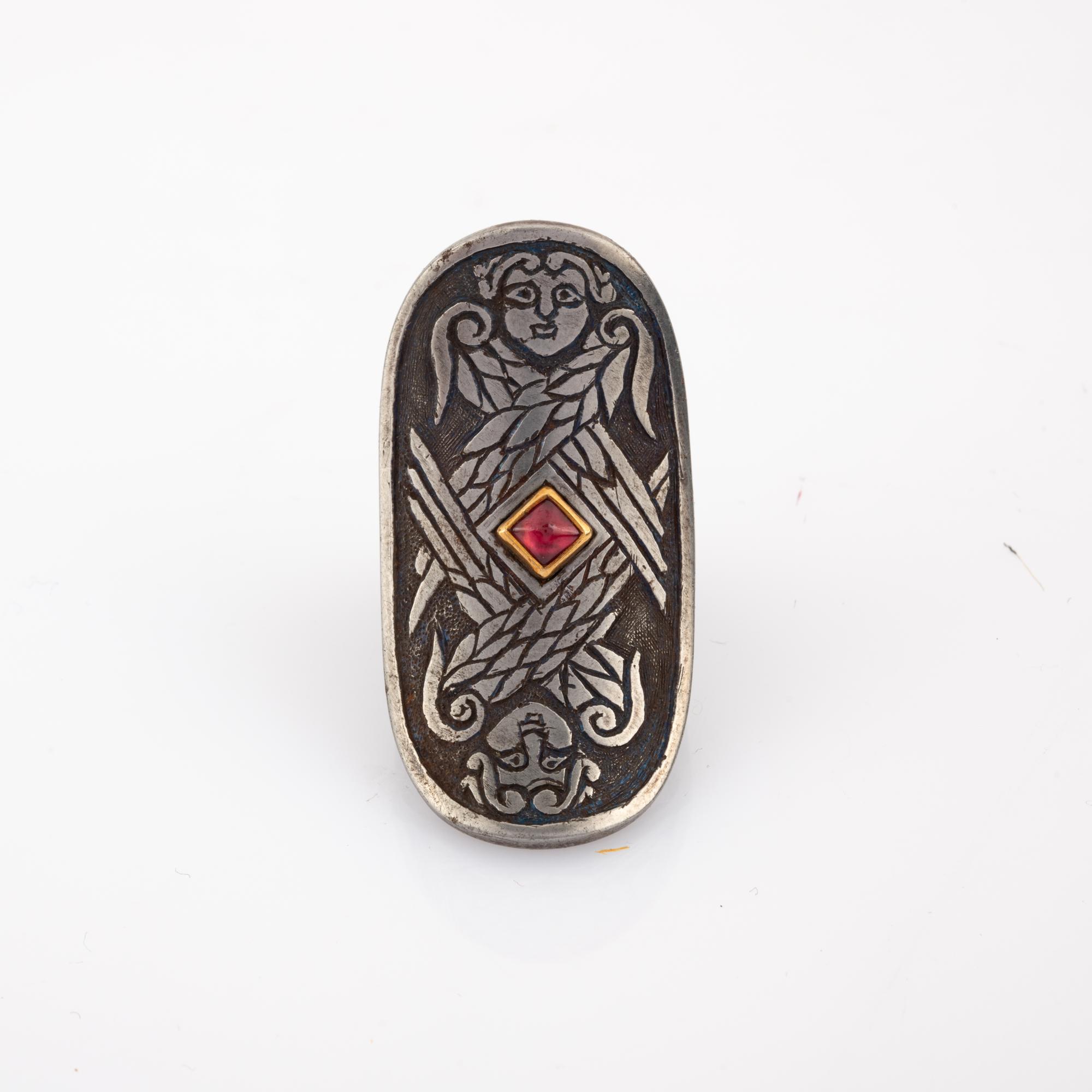 Steel, engraved, yellow gold, ruby.