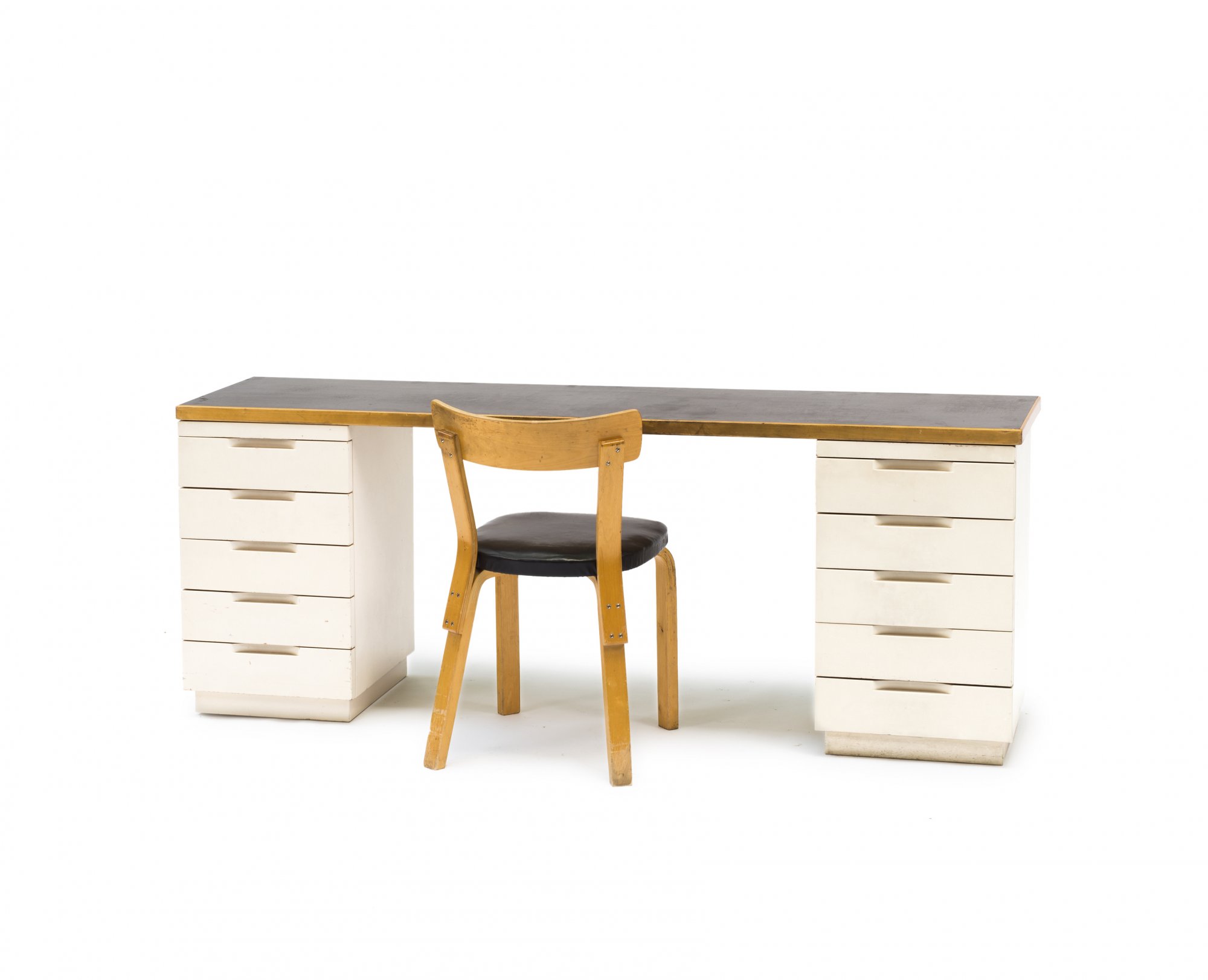 Alvar Aalto; Aino Aalto. Writing desk with two containers and '69' chair, c1938/c1934. H. 69 x 175 x 45 cm; H. 74 x 43 x 48 cm. Made by Artek, Helsinki. Wooden construction, painted white, birch, birch plywood, black leather, black formica. One container marked: Artek.