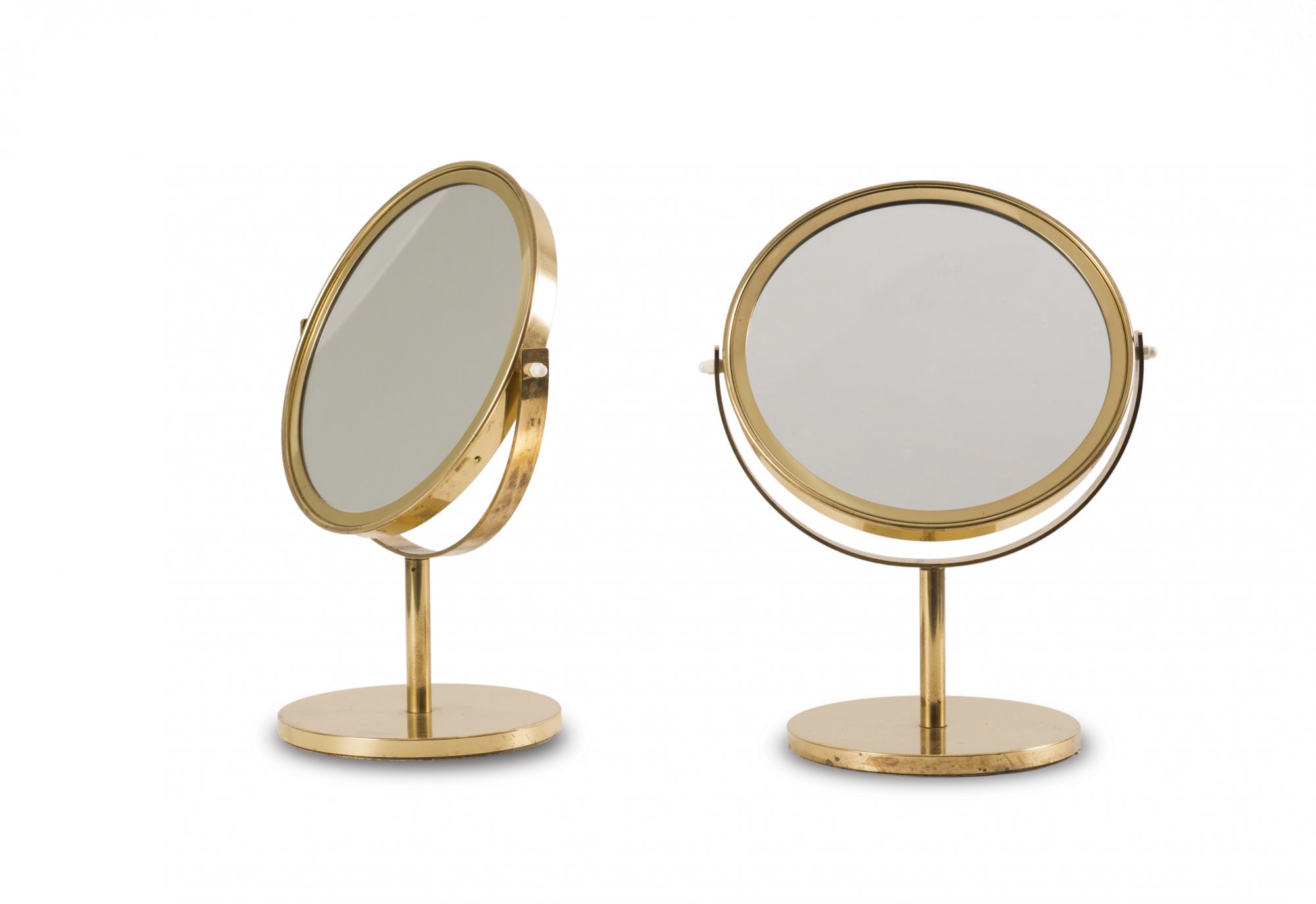 Hans Agne Jakobsson. Pair of table mirrors, 1960s. H. 136 cm; H. 37 cm; D. 27.5 cm. Made by Hans Agne Jakobsson, Markaryd. Tubular brass, sheet brass, cast iron. Marked: Maker's label with designer's data.