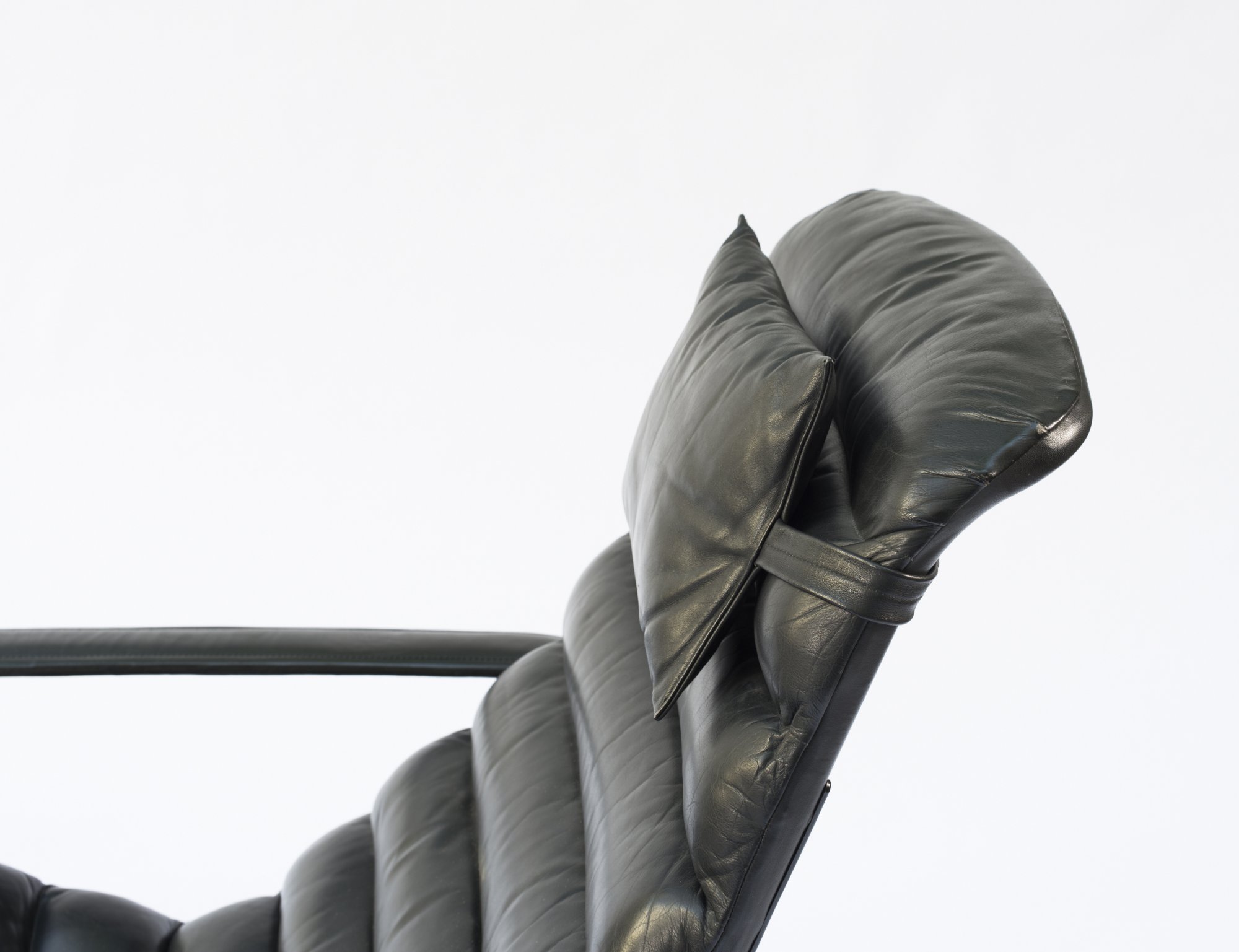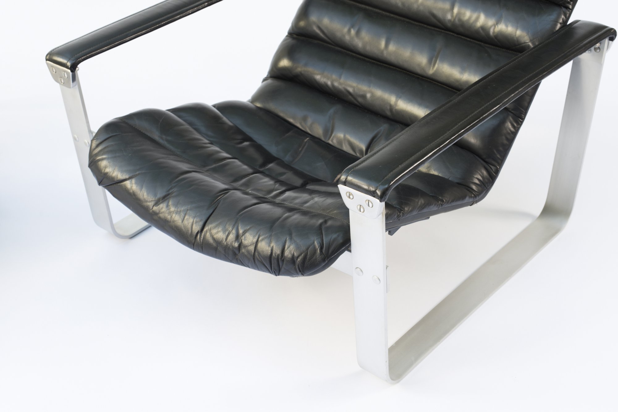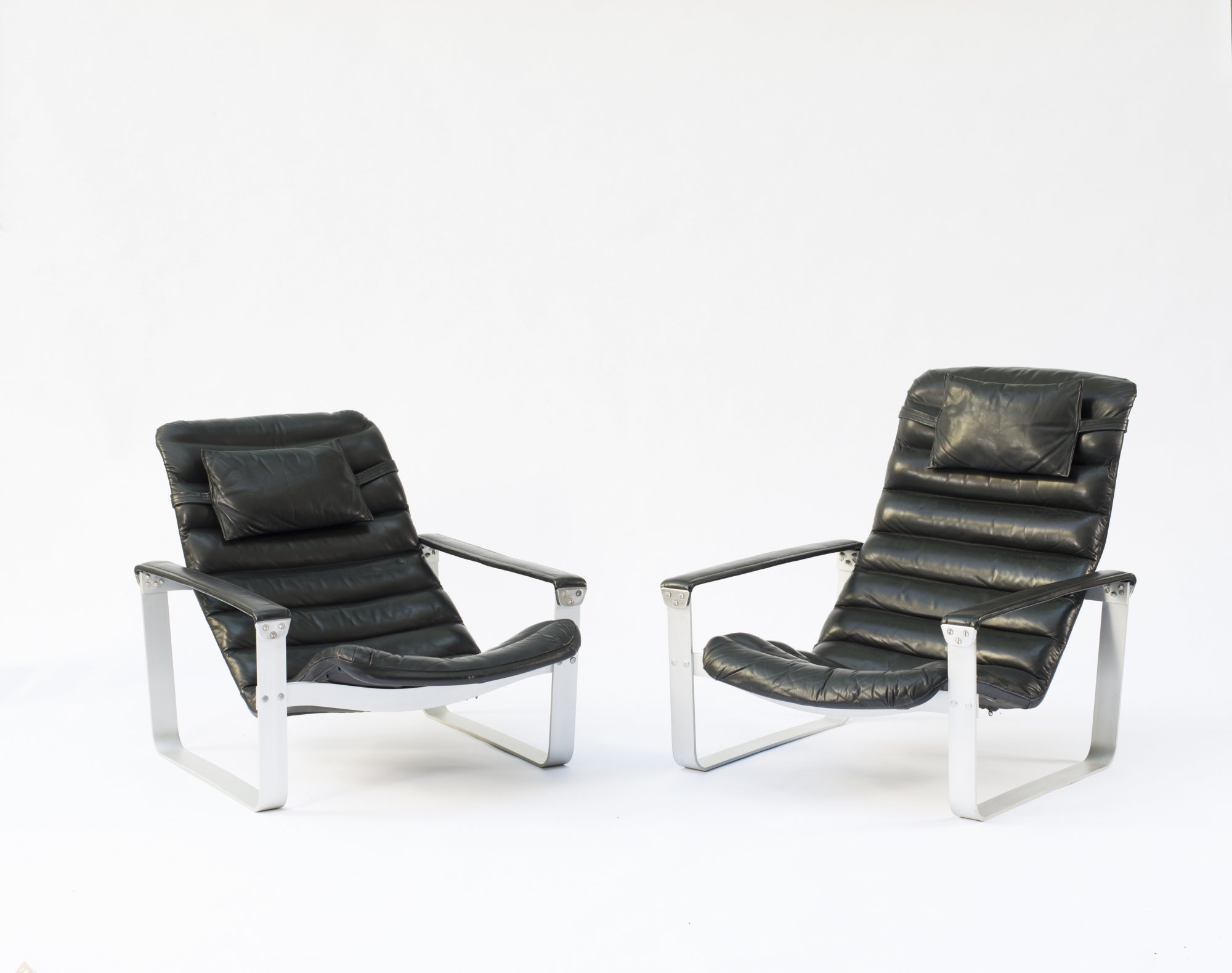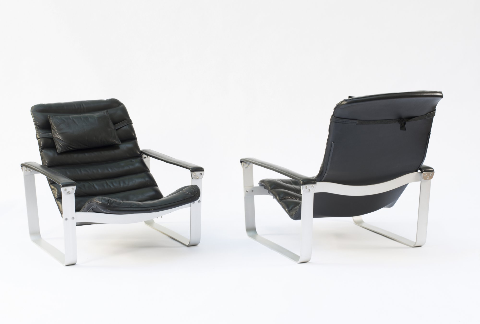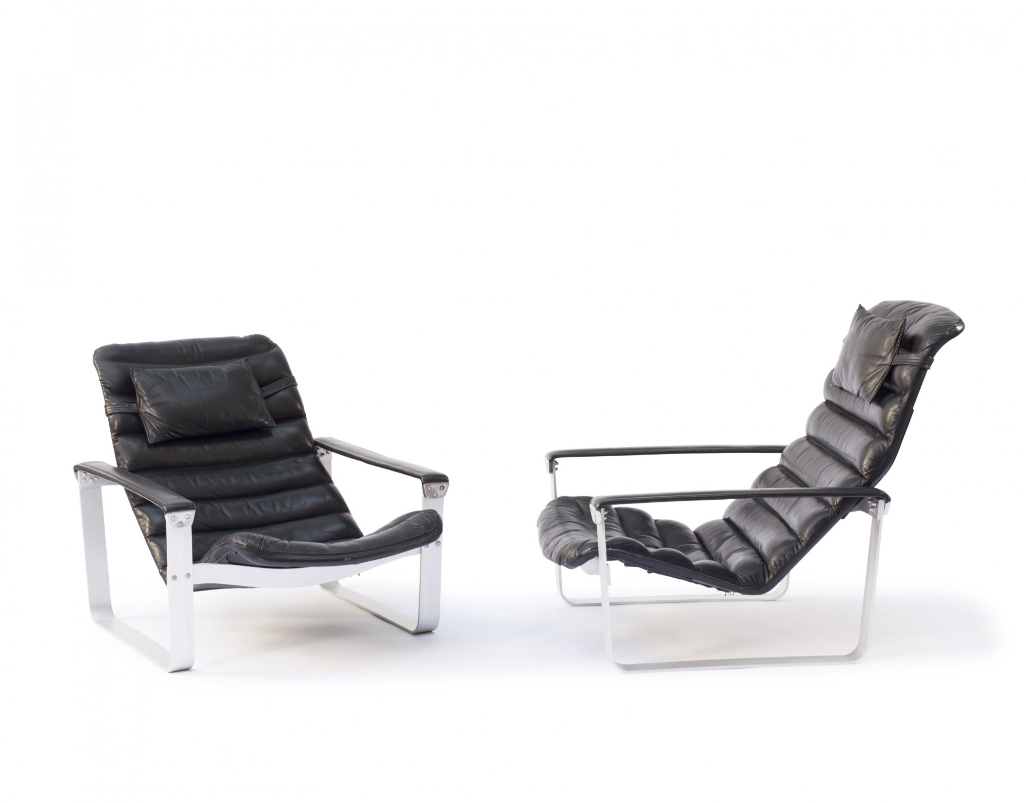 Ilmari Lapallainen. Two ' Metal Pullka' armchairs, c1967/68. H. 80 x 76 x 110 cm. Made by Asko Oy, Helsinki. Aluminium, black leather. Marked: Maker's label ASKO EXPORT.