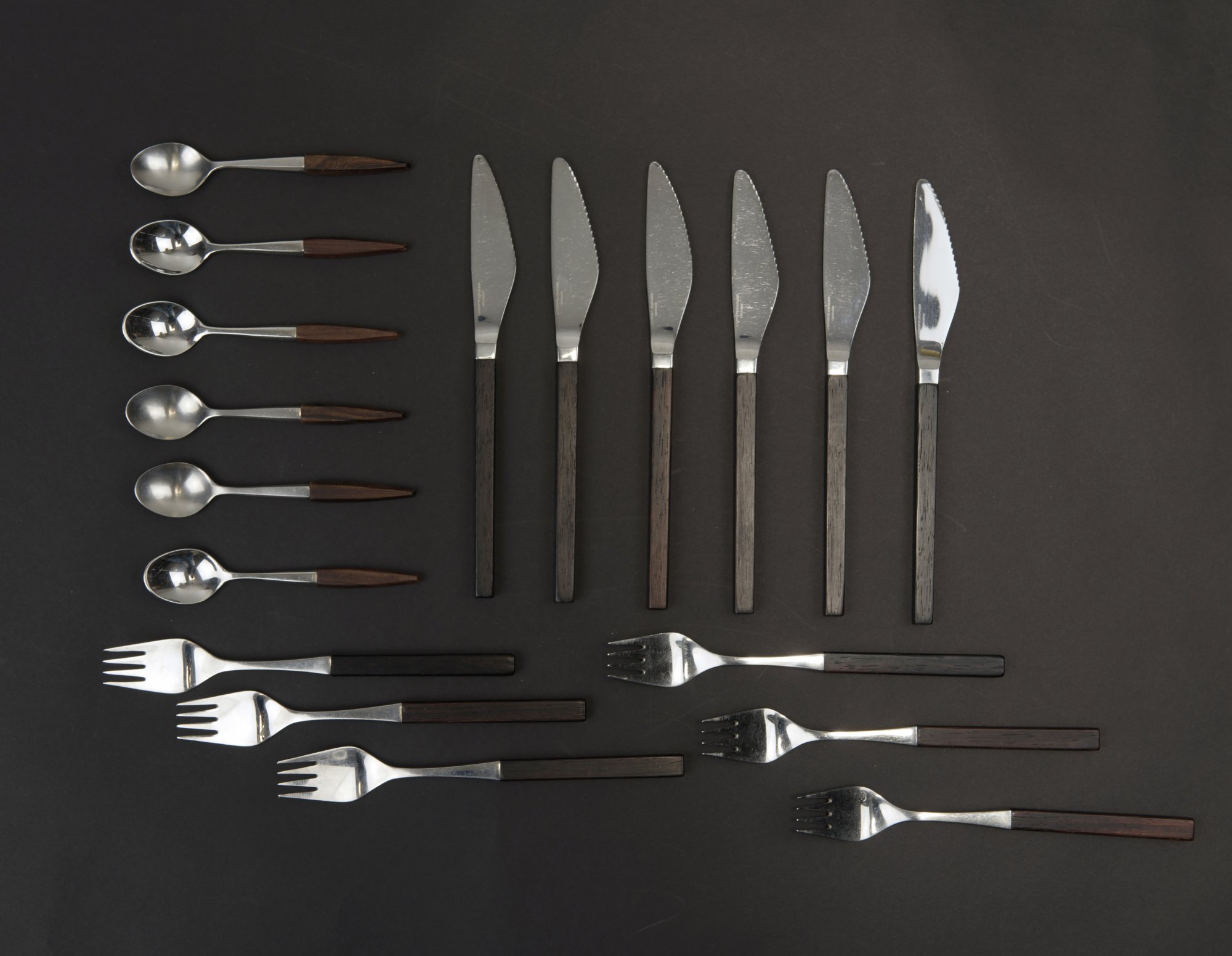 Tias Eckhoff. 'Opus' flatware, 1958. 6 soup spoons: L. 18.5 cm; 23 forks: L. 16,7-18.9 cm; 23 knives: L. 19-21.2 cm; 12 teaspoons: L. 13 cm; 4 mocha spoons: L. 11.8 cm.