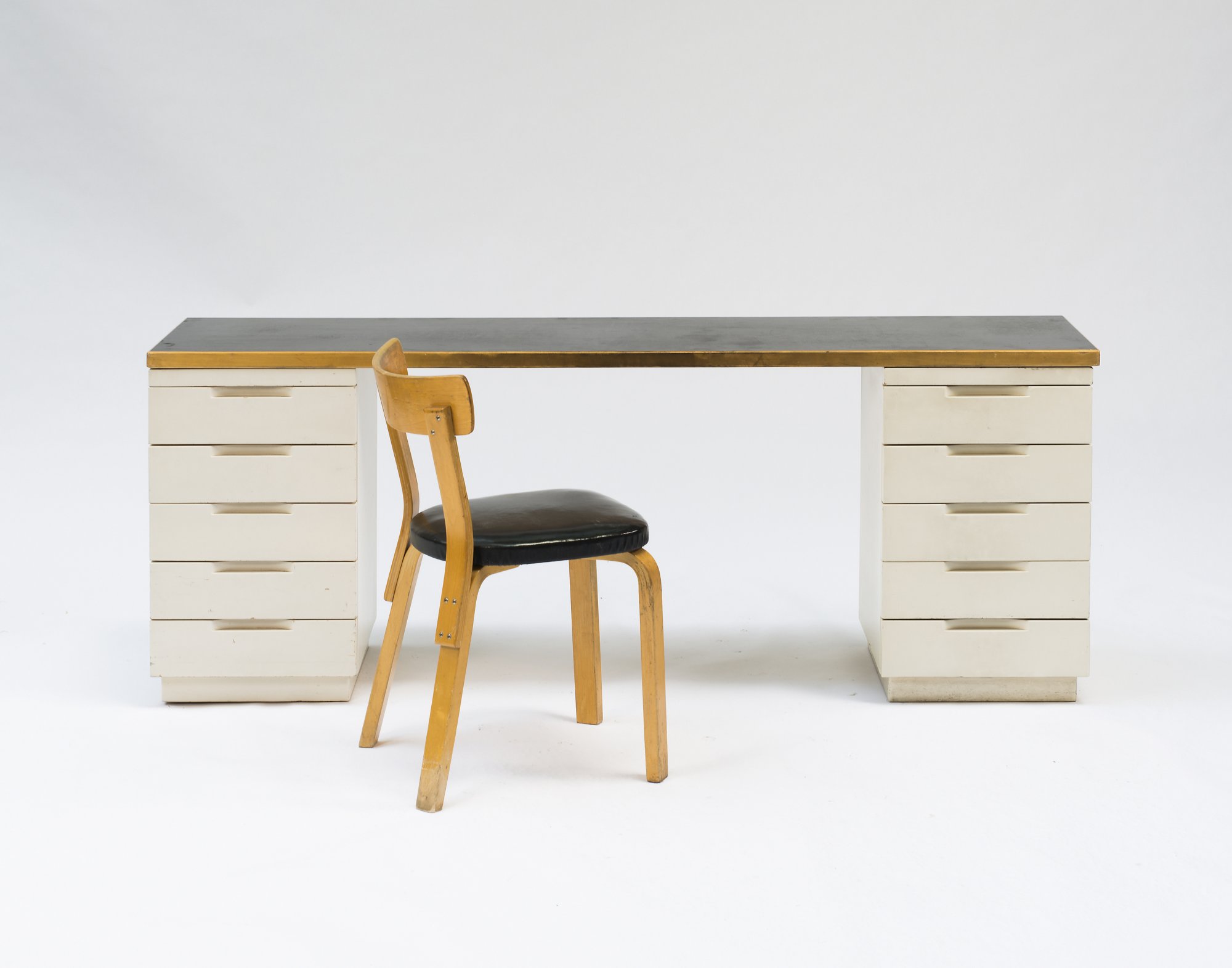 Alvar Aalto; Aino Aalto. Writing desk with two containers and '69' chair, c1938/c1934. H. 69 x 175 x 45 cm; H. 74 x 43 x 48 cm. Made by Artek, Helsinki. Wooden construction, painted white, birch, birch plywood, black leather, black formica. One container marked: Artek.