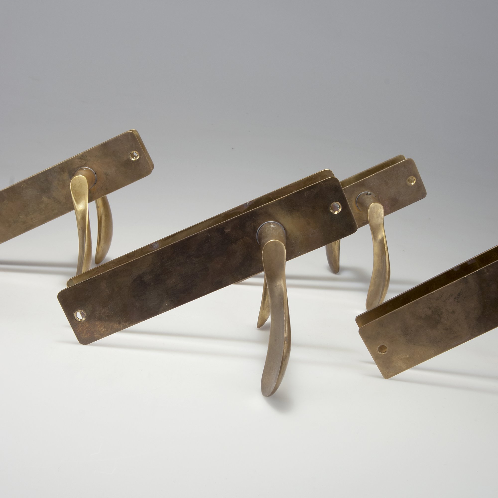 Arne Jacobsen. Five pairs of 'AJ' door handles, 1956. L. 12.5 cm; panels: 22 x 4.2 cm. Made by Carl F. Petersen, Copenhagen. Cast brass, sheet brass, rectangular metal.