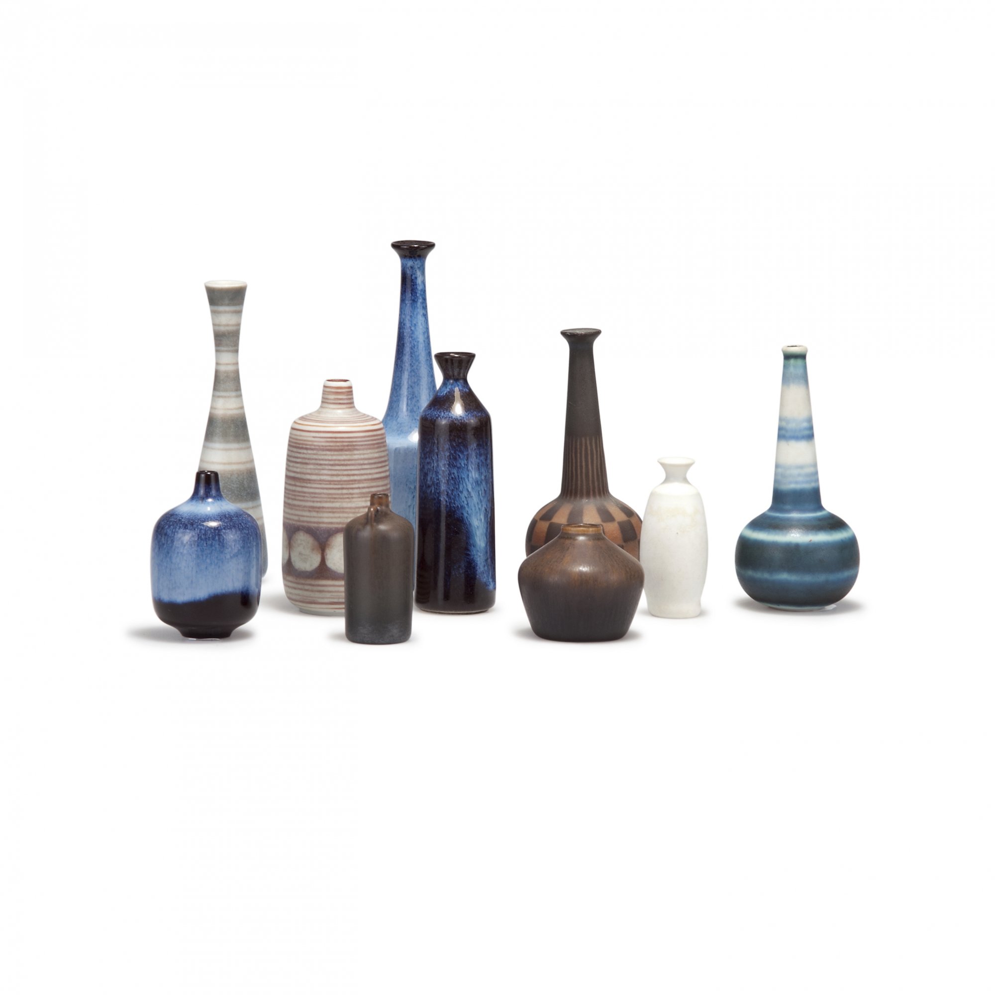 Gunnar Nylund. Ten miniature vases, 1950s. H. 4.2-14.2 cm. Made by Rörstrands Porslinsfabriker AB, Lidköping. Porcelain and stoneware, polychromatic glaze. Marked: Maker's mark, designer's initials, model nos. (part).