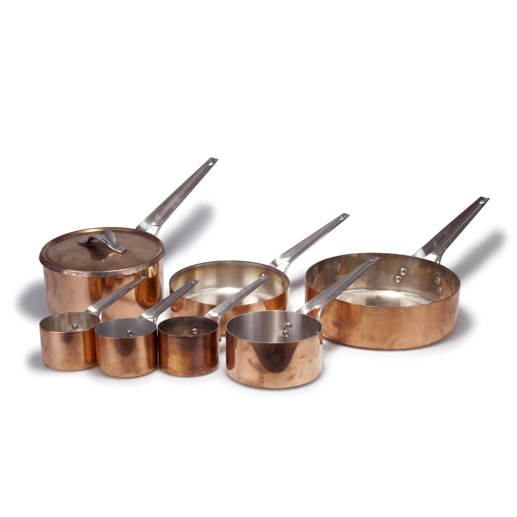 Henning Koppel. 'Taverna' frying pans, c1960. Three butter pans: H. 6.5 cm; D. 9 cm; four pots with handle: H. 5.5-9.5 cm; D. 14-25 cm; lid. Made by Georg Jensen, Copenhagen. Copper, part chromed. Marked: Maker's mark.