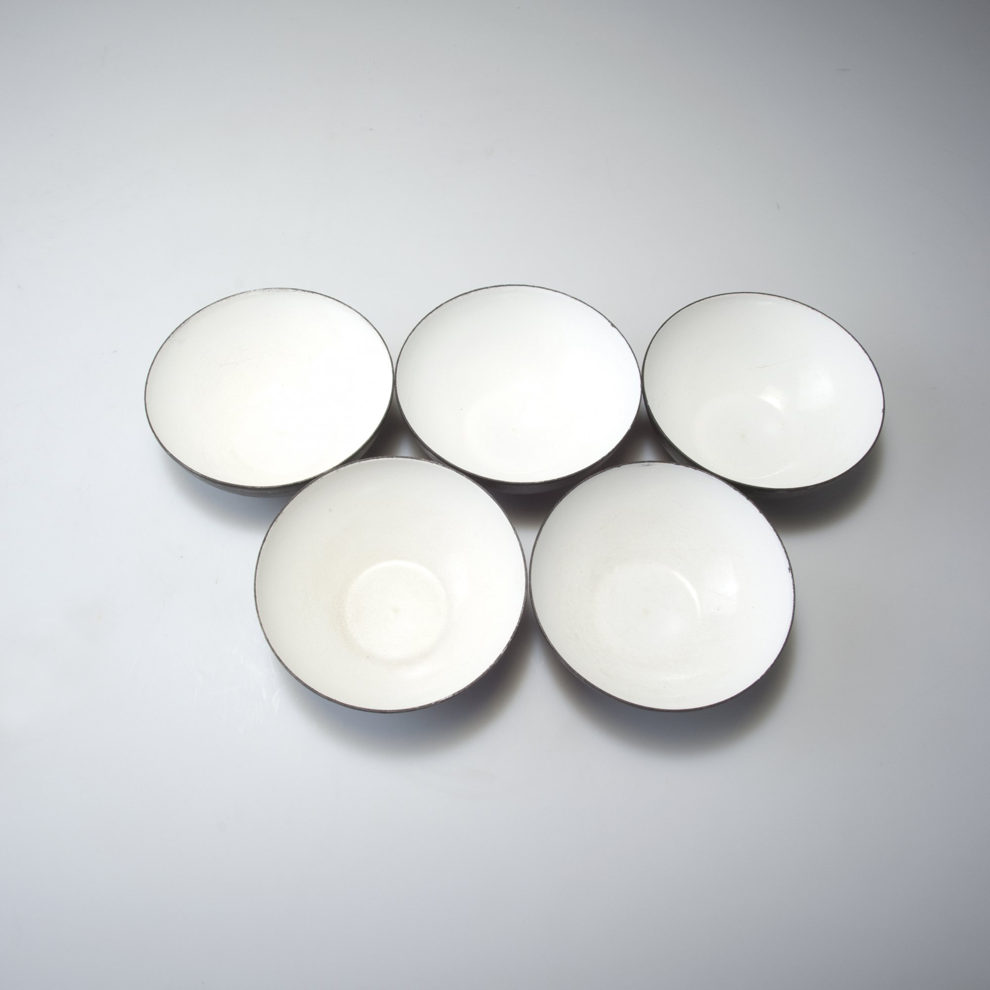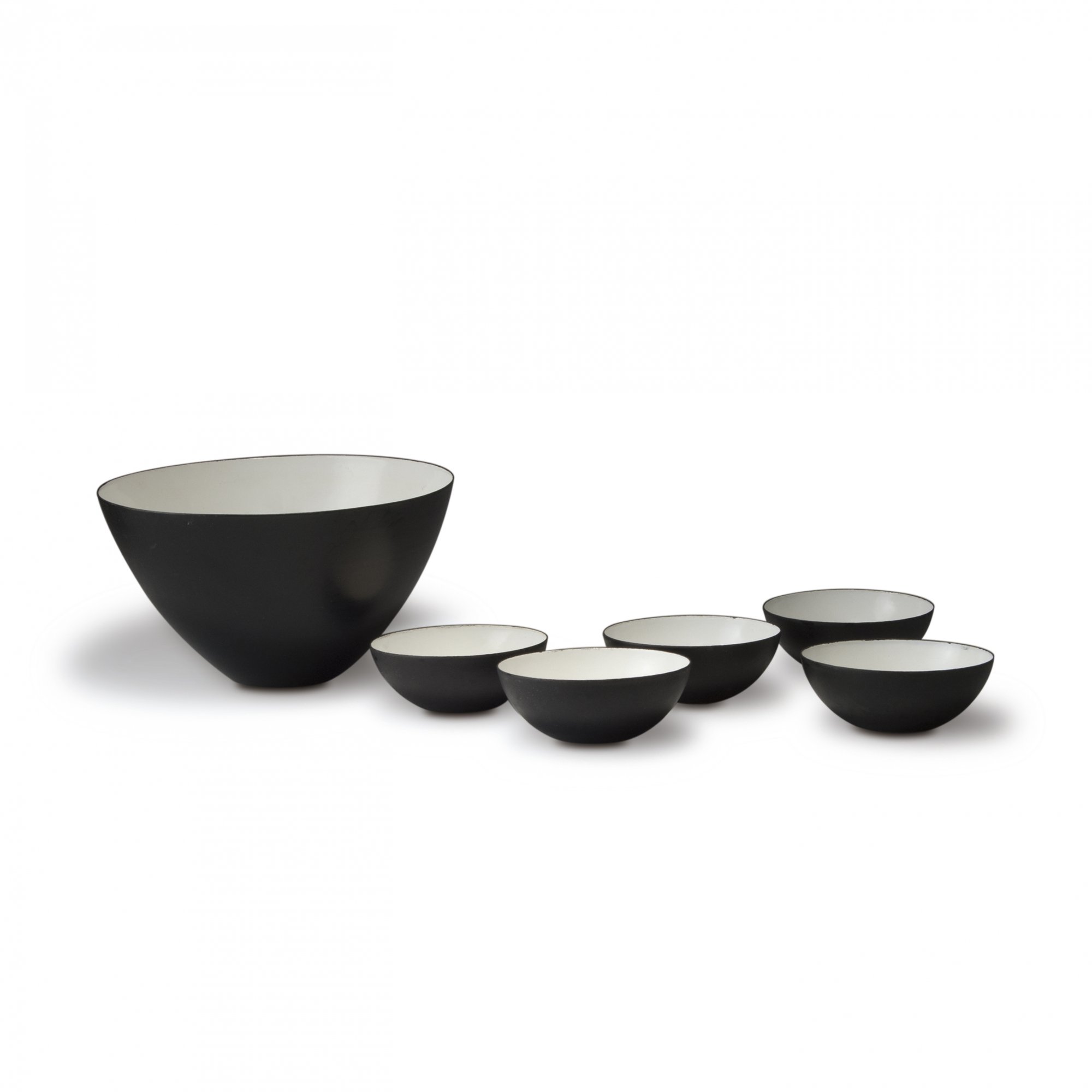 Herbert Krenchel. Six 'Krenit' bowls, c1953. H. 4.7 cm; D. 12 cm; H. 14.2 cm; D. 25,3 cm. Made by Torben Örskov & Co., Copenhagen. Sheet steel, outside matt black, enamelled white inside.