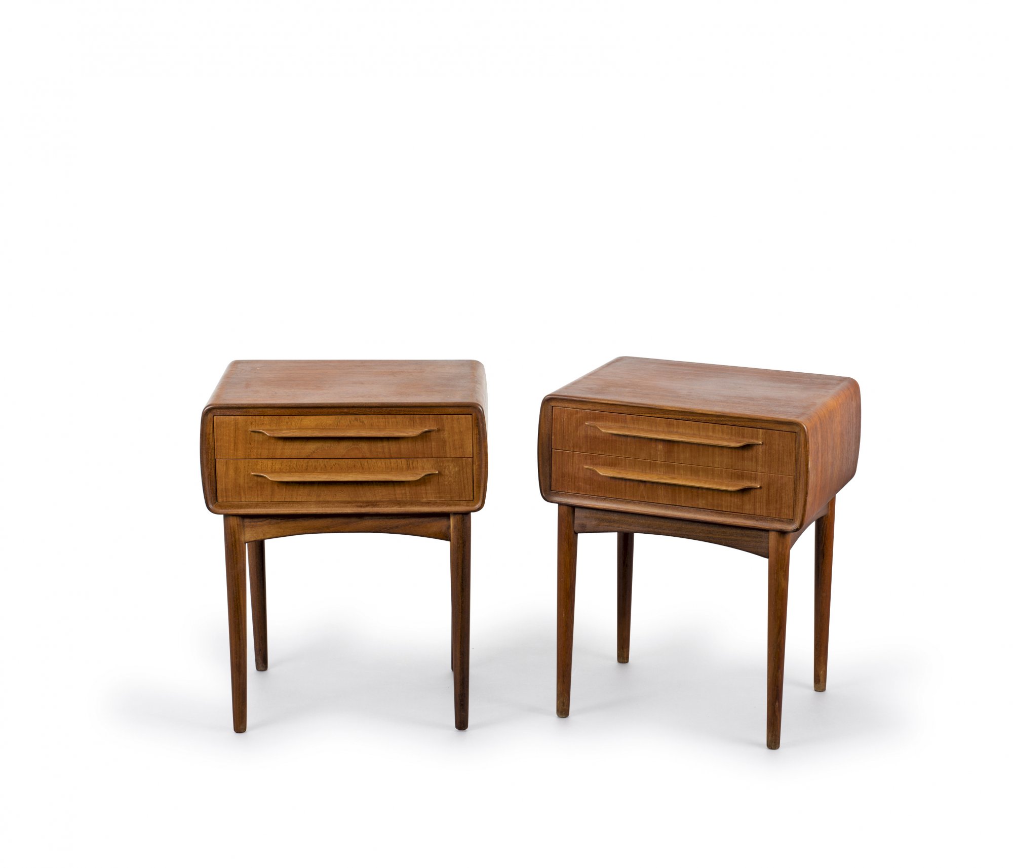 Johannes Andersen. Pair of bedside tables, 1950s. H. 34.6 x 34 x 30 cm. Made by C.F. Christiansen Möbler, Silkeborg. Teak and teak veneer.