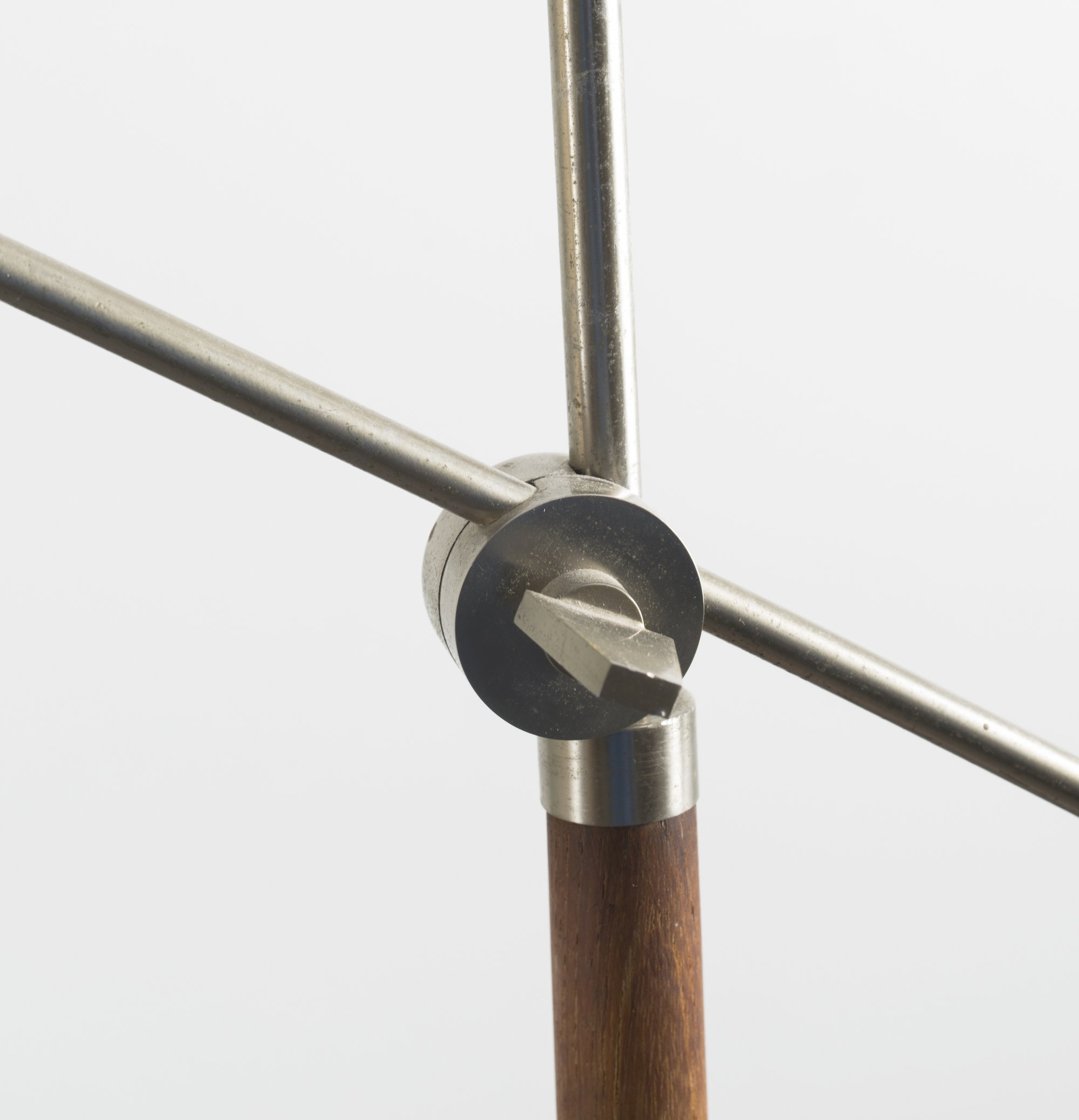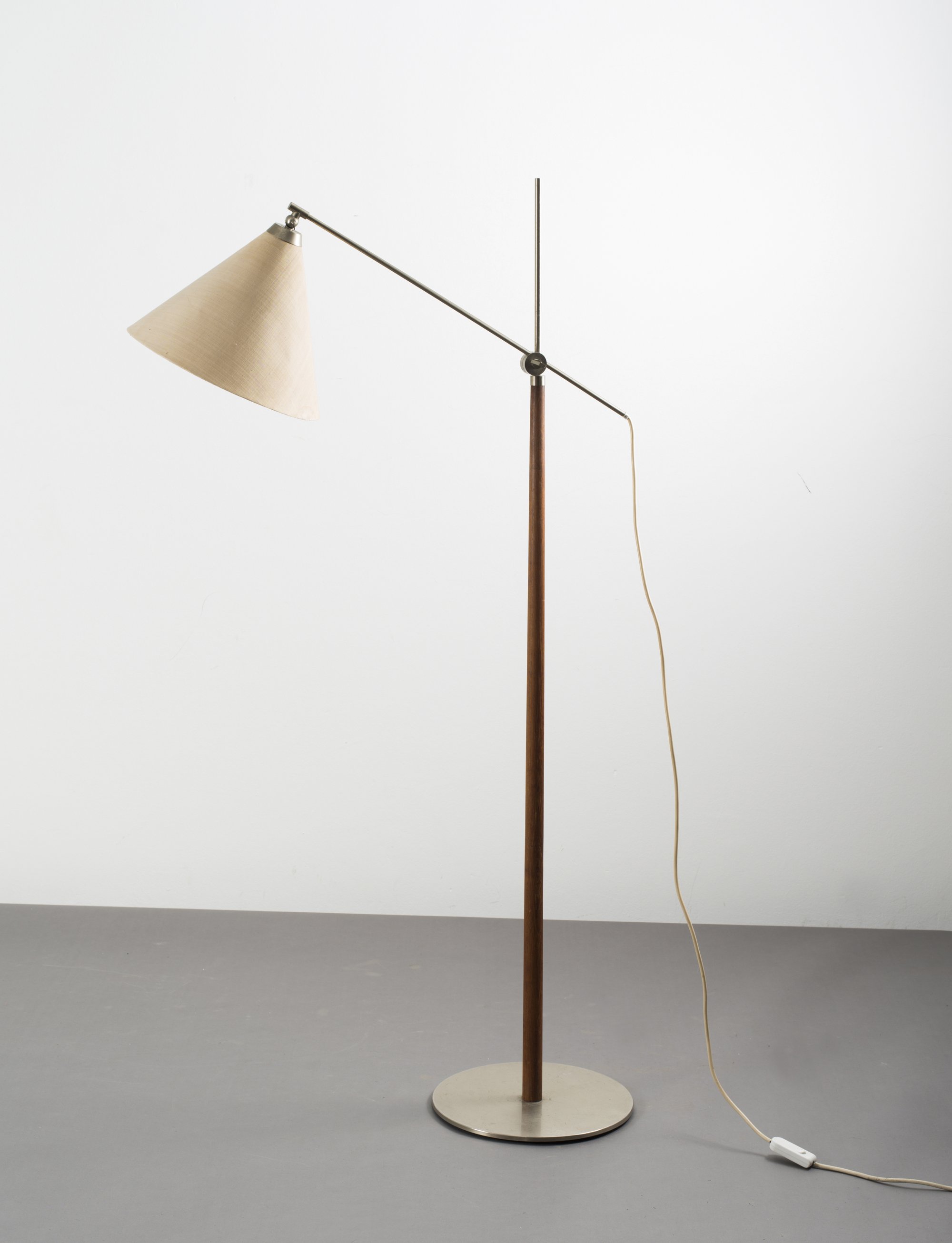 Sweden. Floor light, c1965. H. 150 cm. Tubular steel, chrome-plated sheet steel, teak, fabric shade.