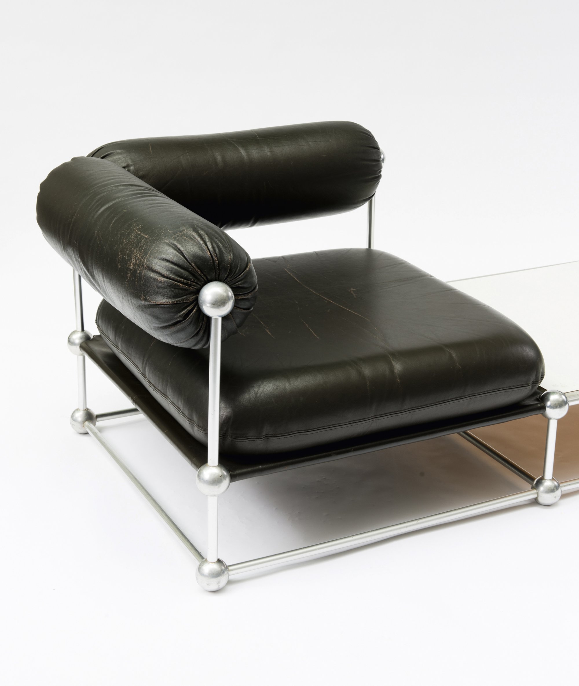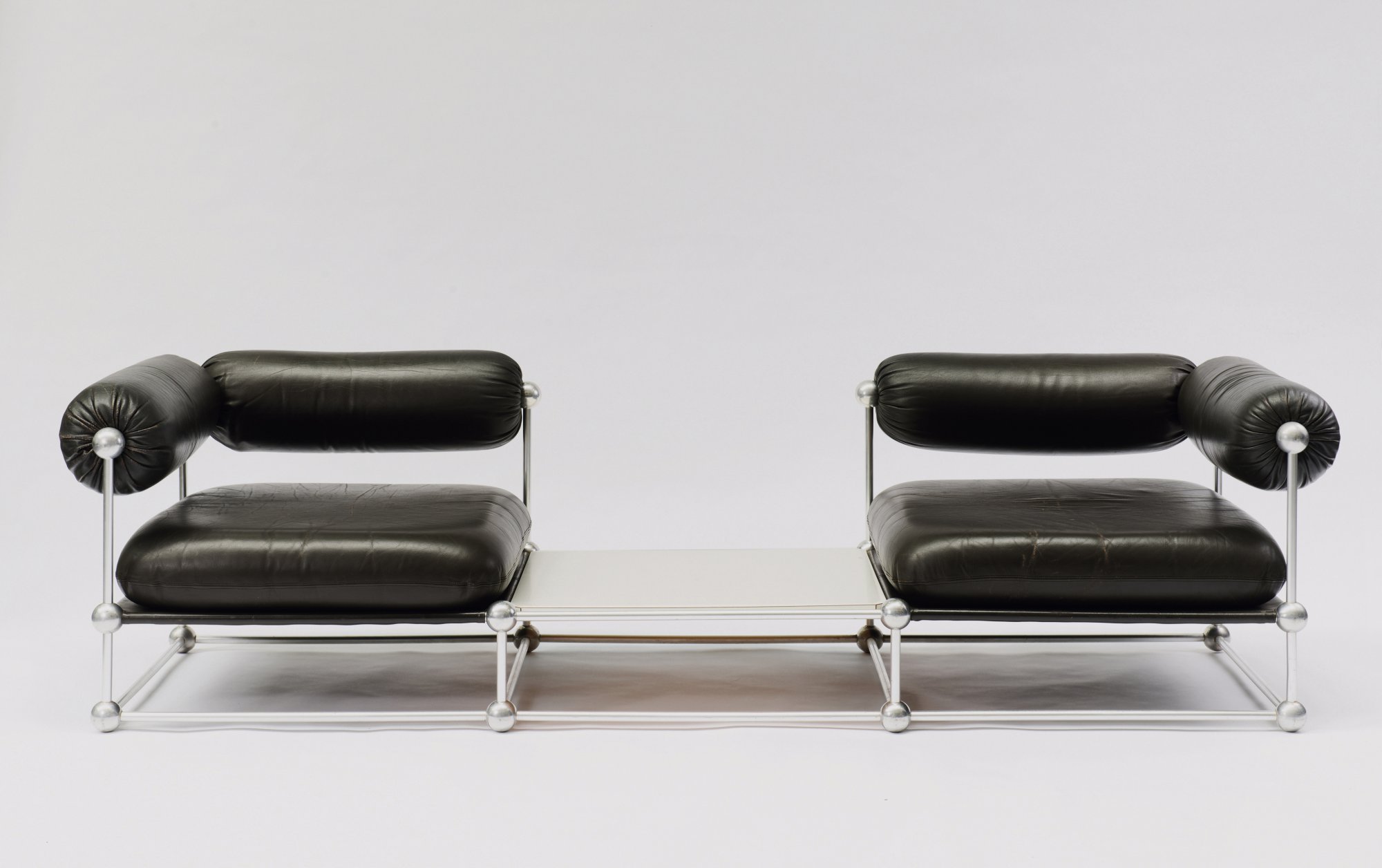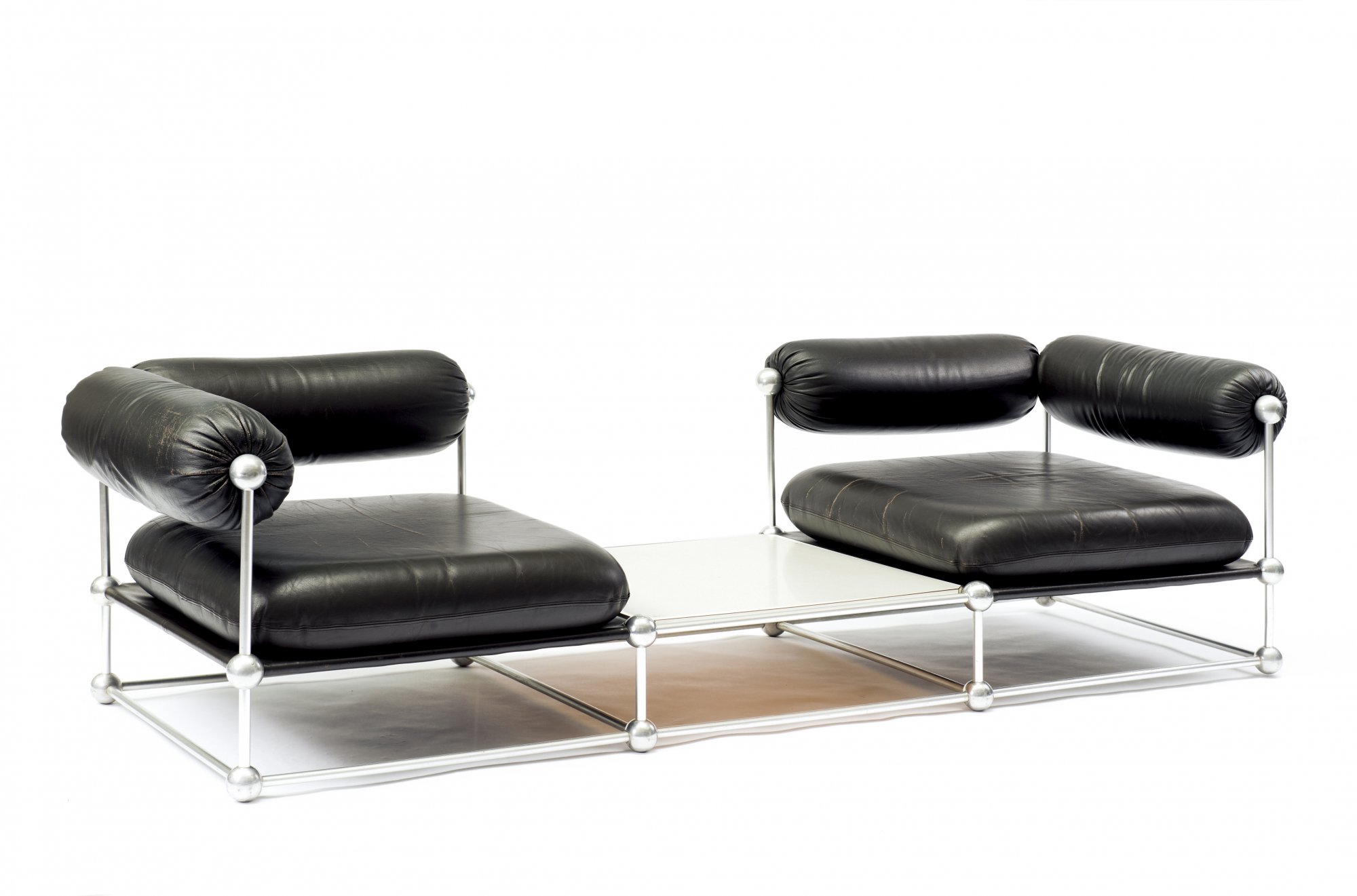 Verner Panton. 'S420 C' couch with table and two 'S420 H' easy chairs, 1963. Couch: H. 60 x 215 x 82 cm; chairs: H. 63 x 88 x 82 cm. Made by Thonet, Frankenberg. Tubular aluminium, dark brown leather, wooden board with white formica cover.