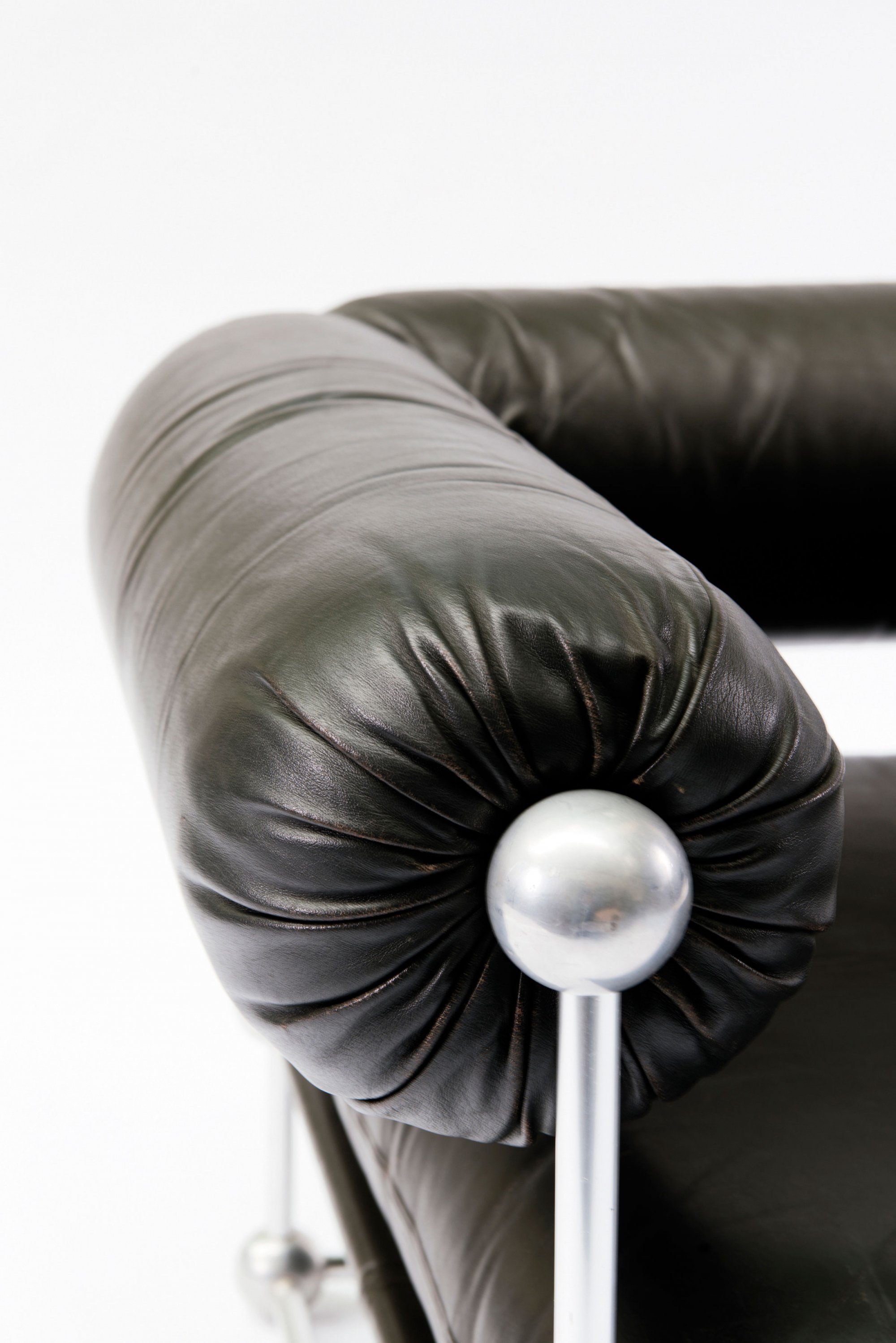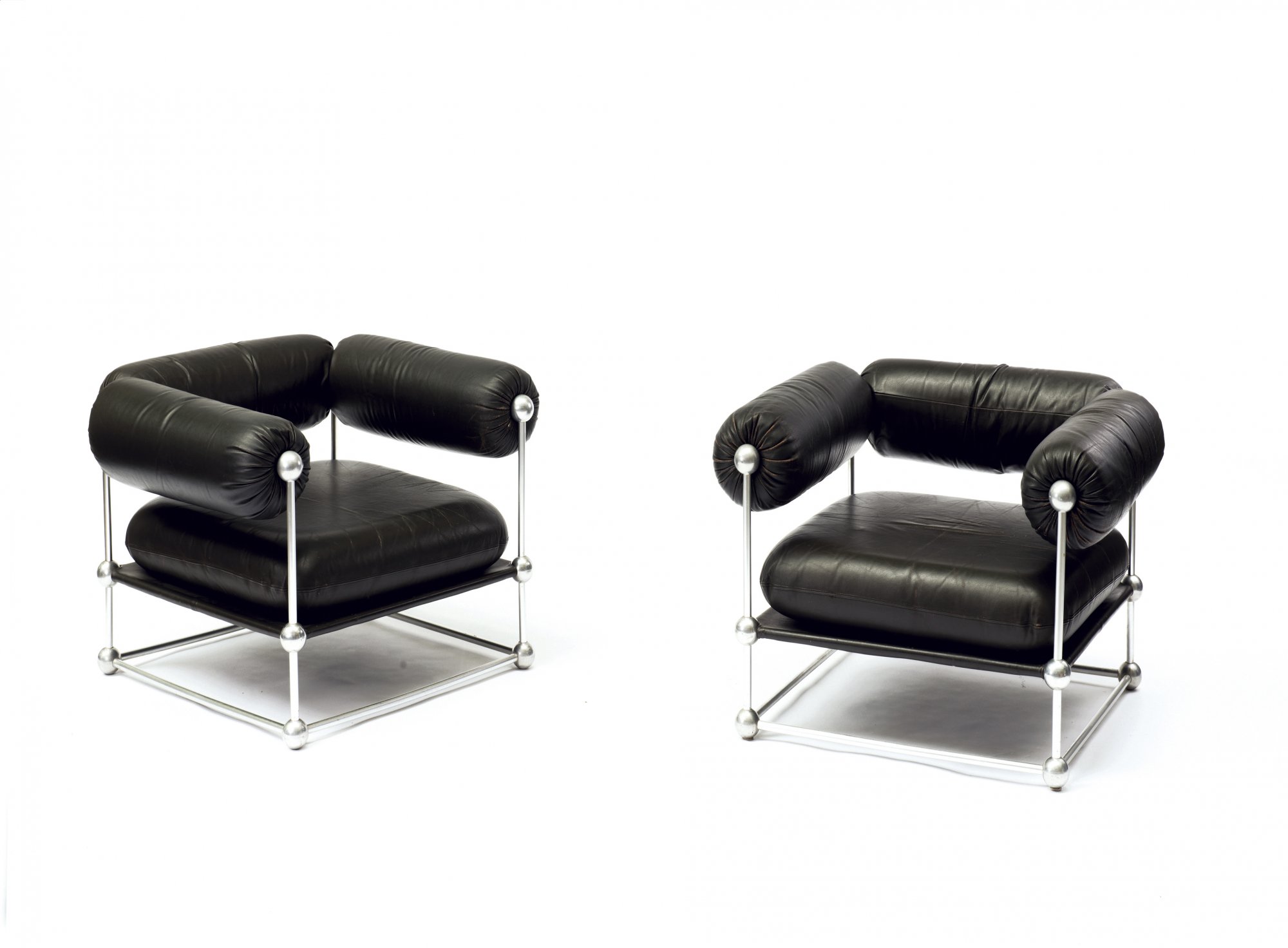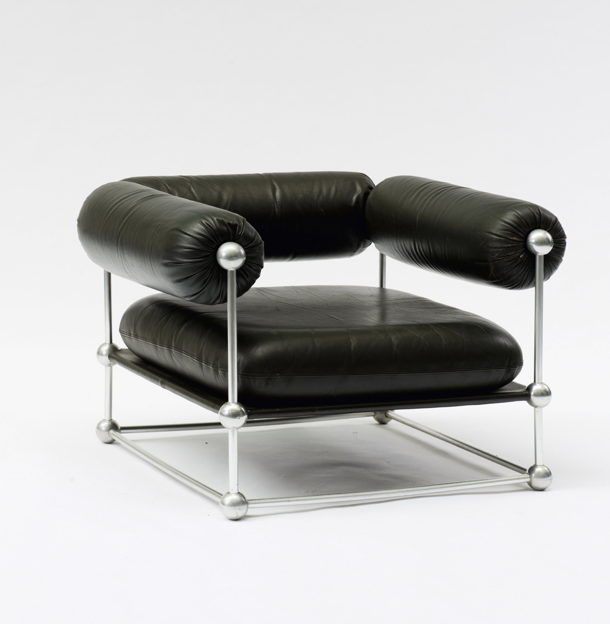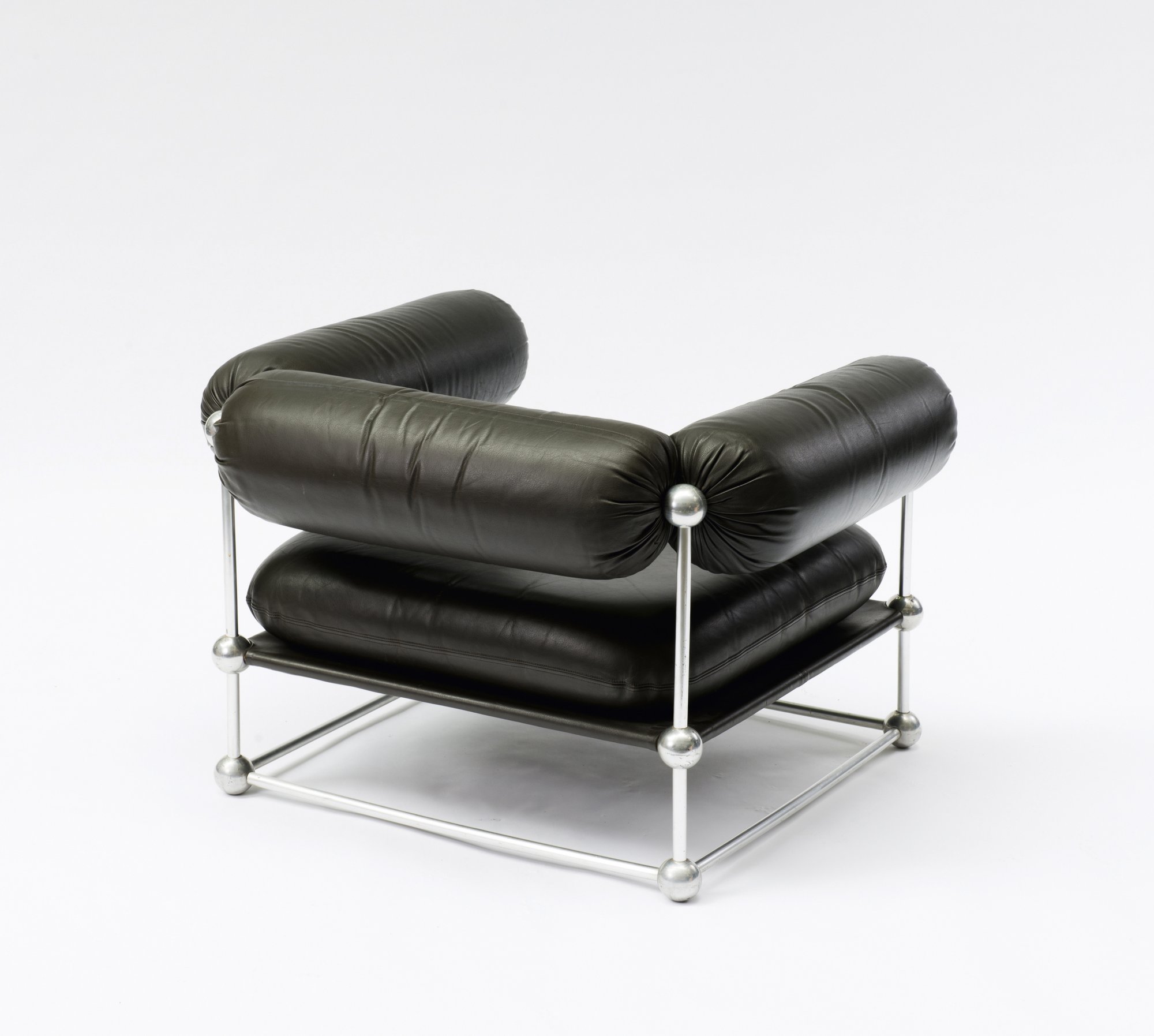 Verner Panton. 'S420 C' couch with table and two 'S420 H' easy chairs, 1963. Couch: H. 60 x 215 x 82 cm; chairs: H. 63 x 88 x 82 cm. Made by Thonet, Frankenberg. Tubular aluminium, dark brown leather, wooden board with white formica cover.