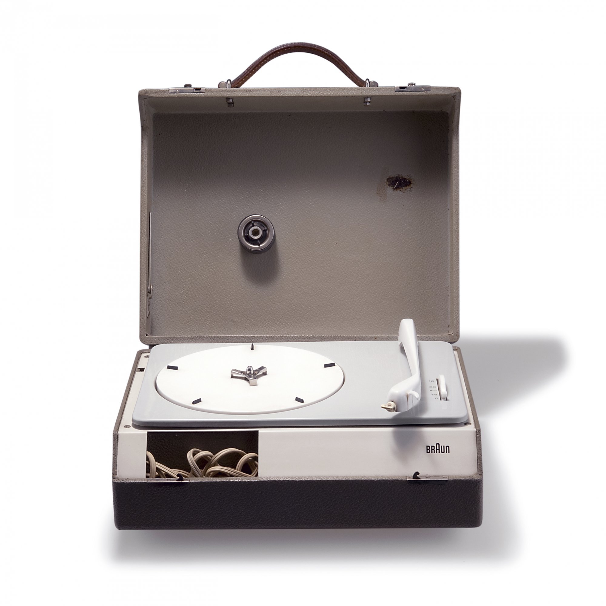 Dieter Rams; Wilhelm Wagenfeld. Portable 'PC 3 SV' record player, 1958. H. 13.5 x 33 x 27 cm. Made by Braun AG, Frankfurt/Main. Sheet metal, plastic, white and pale grey, grey leatherette. Marked: Braun, maker's label.
