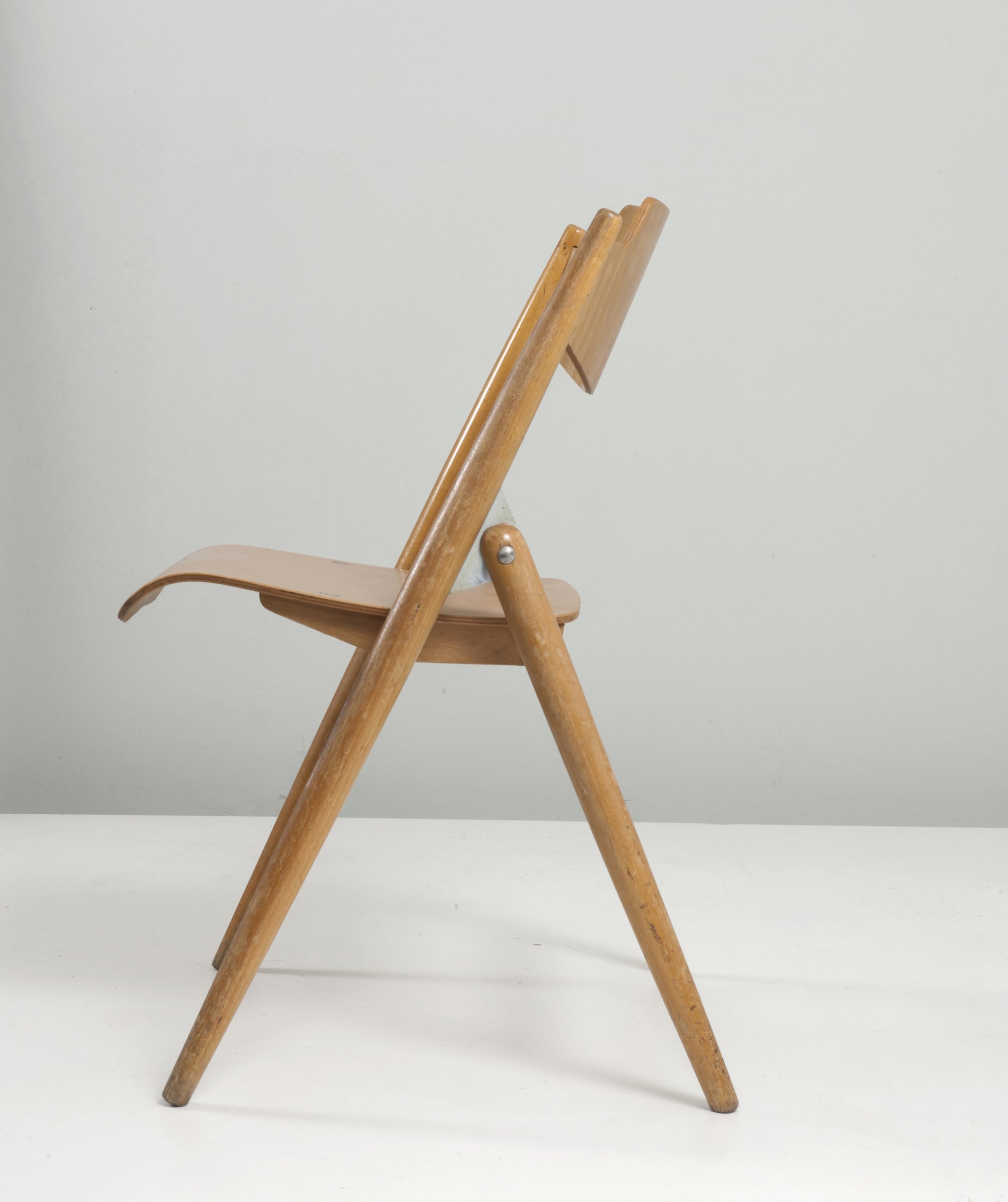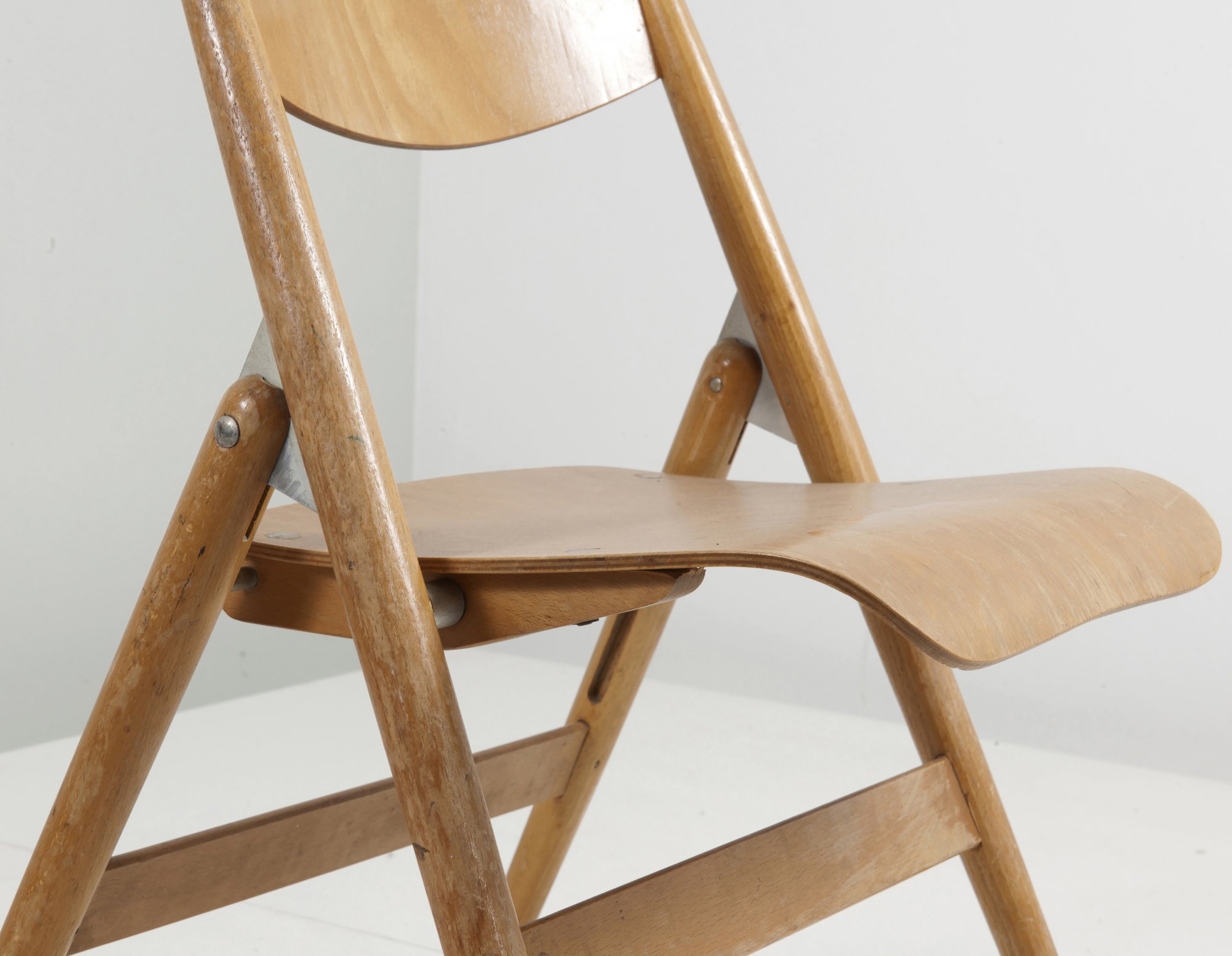 Egon Eiermann. Two 'SE 76' child's folding chairs, 1953. H. 63.5 x 41 x 39 cm. Made by Wilde & Spieth, Esslingen. Beech and beech plywood, zinc-plated metal.