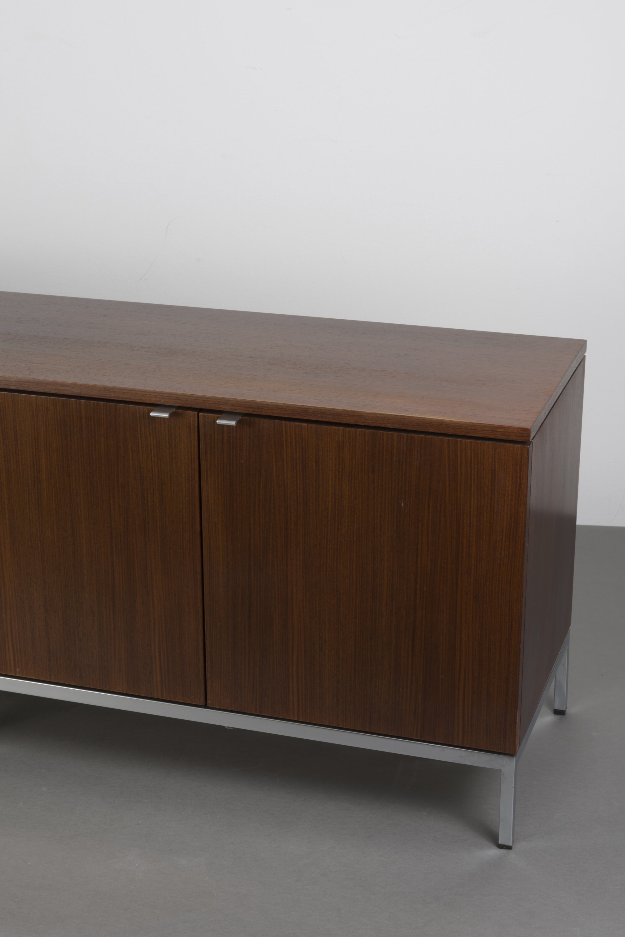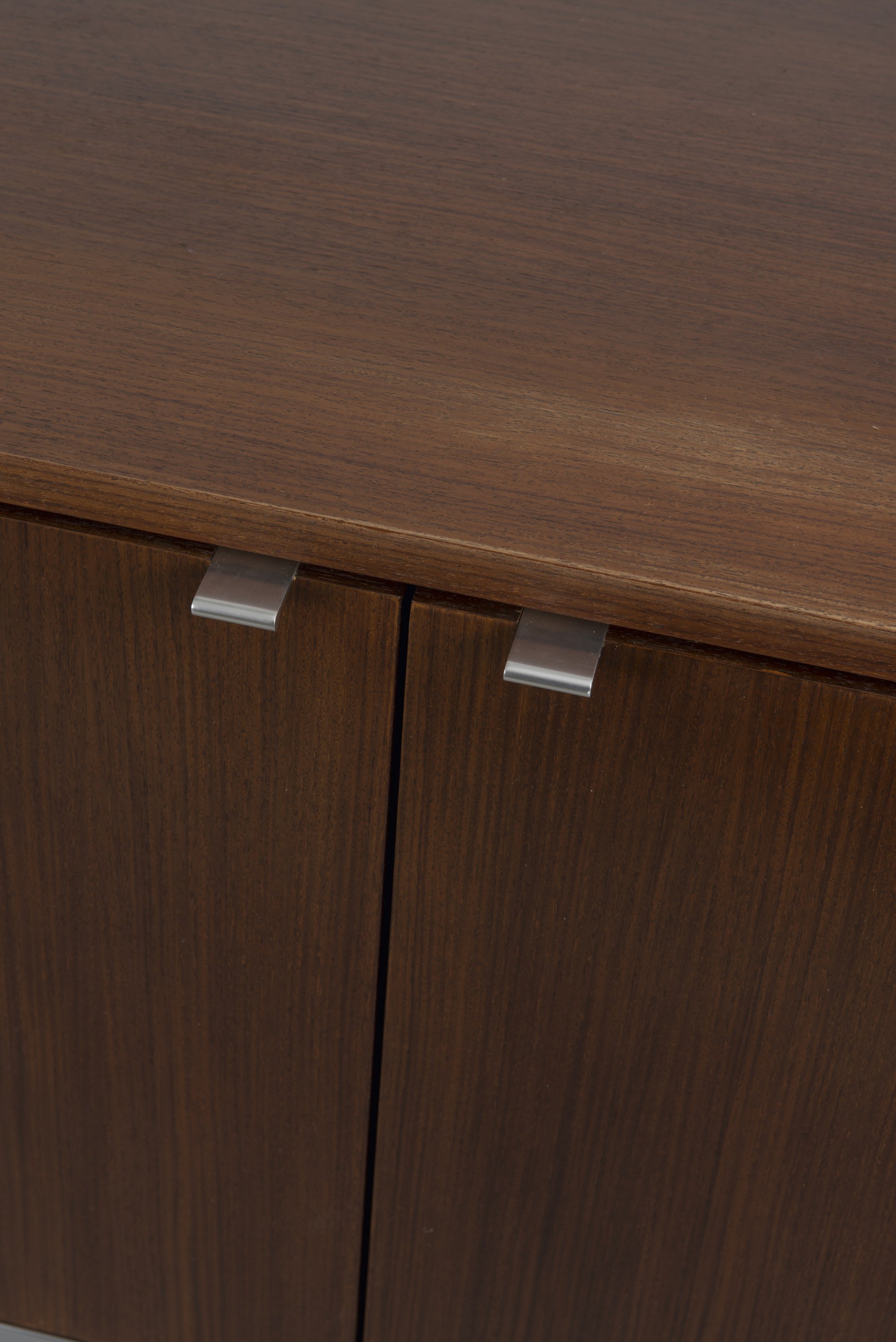 Florence Knoll. '2544' sideboard, c1965. H. 65 x 190 x 45 cm. Made by Knoll International, Stuttgart. Teak veneer, rectangular steel, chrome-plated, brushed stainless steel. Marked: Maker's label.
