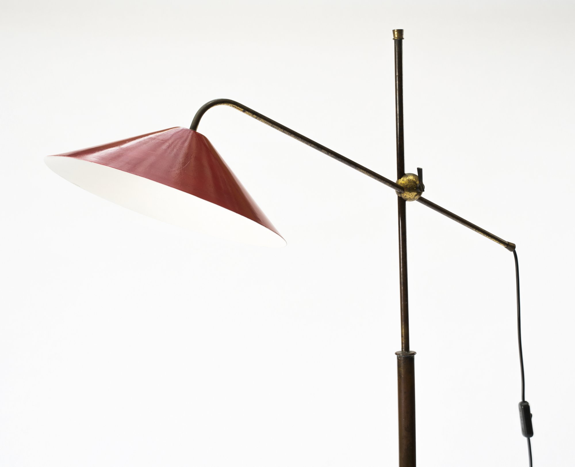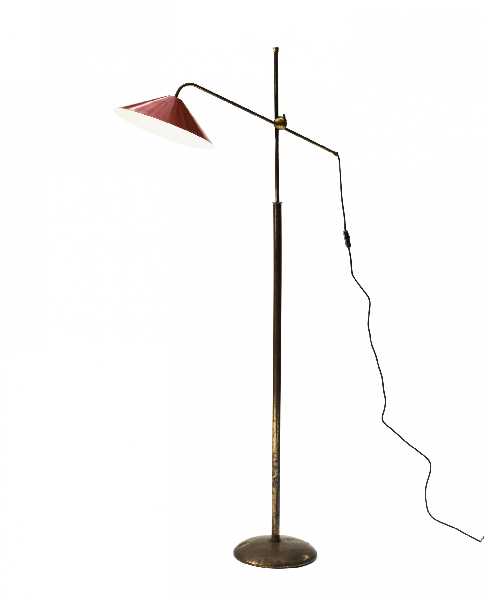 Italy. Floor light, 1950s. H. 168 cm; D. 34 cm. Tubular brass, sheet brass, sheet aluminium, painted red and white.