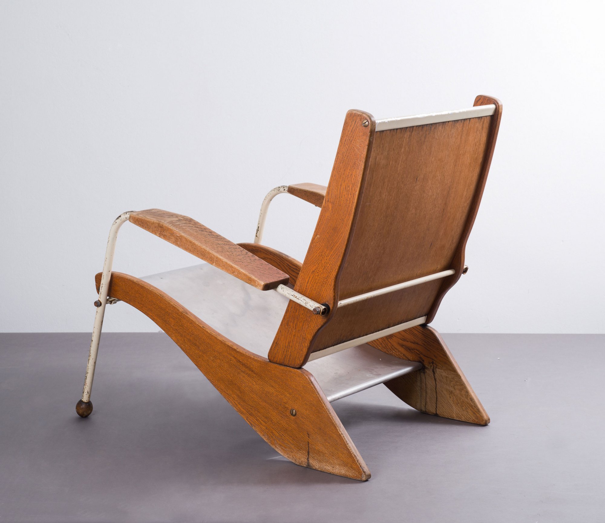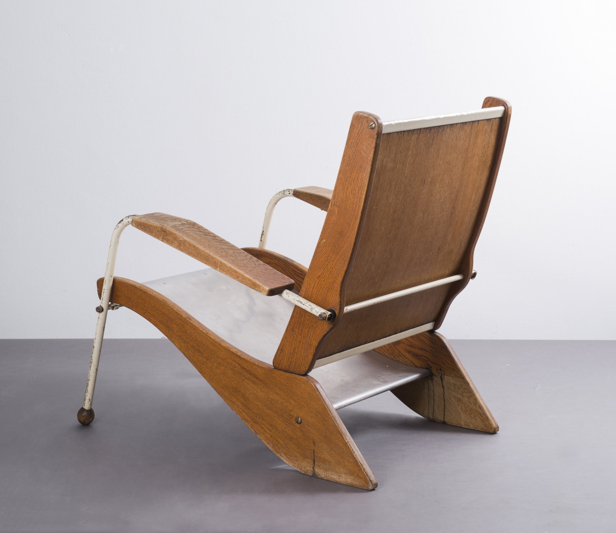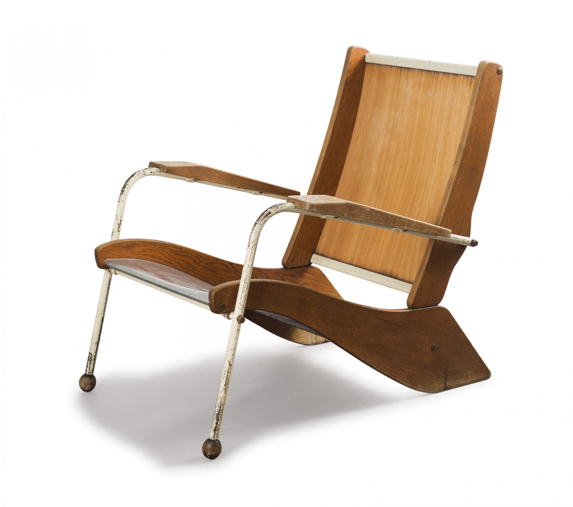 Jean Prouvé. 'Visiteur kangaroo FV 22' lounge chair, 1948. H. 82,5 x 71 x 91 cm. Made by Ateliers Jean Prouvé, Nancy. Tubular steel, painted white, sheet aluminium, part white, oak, plywood.