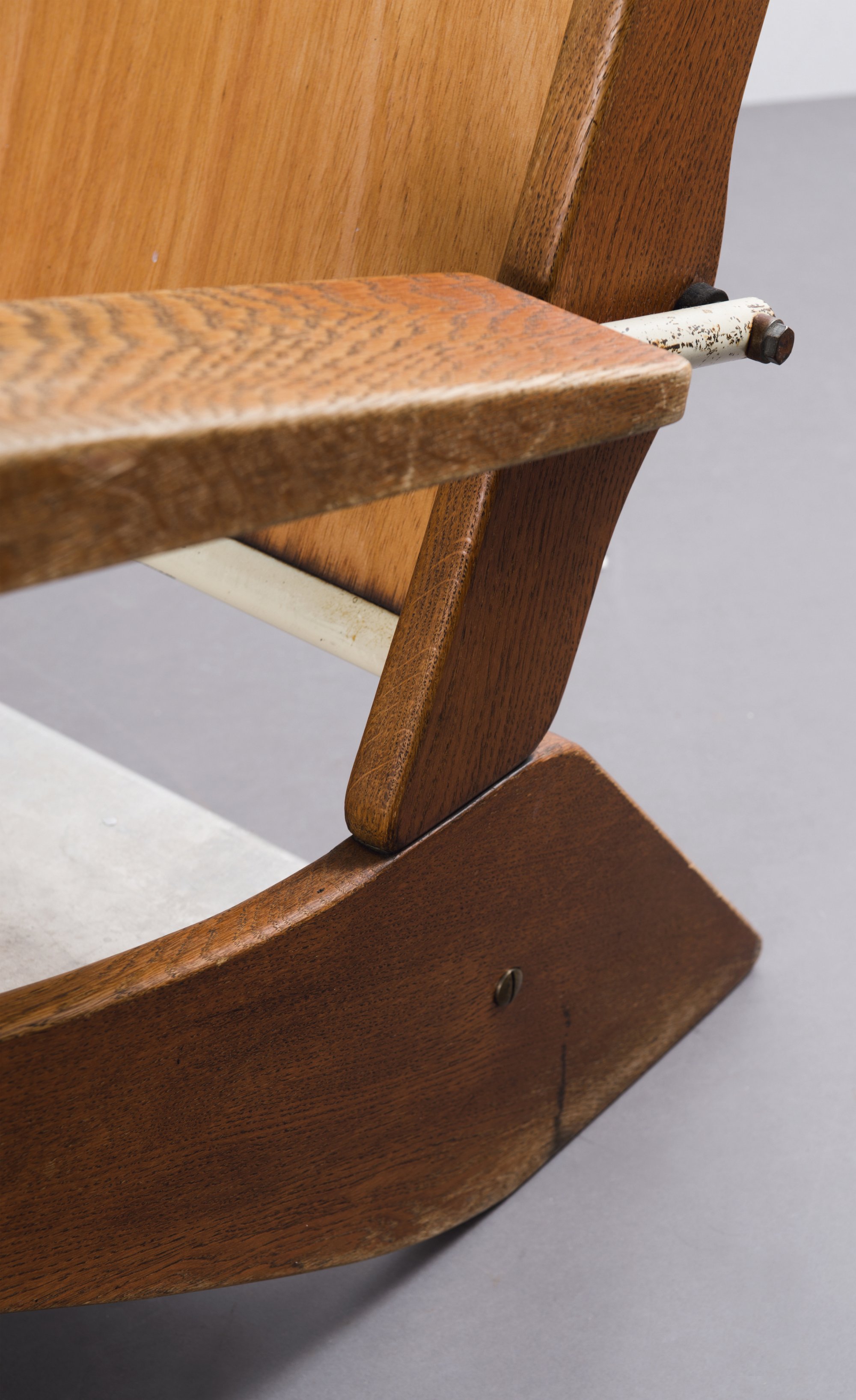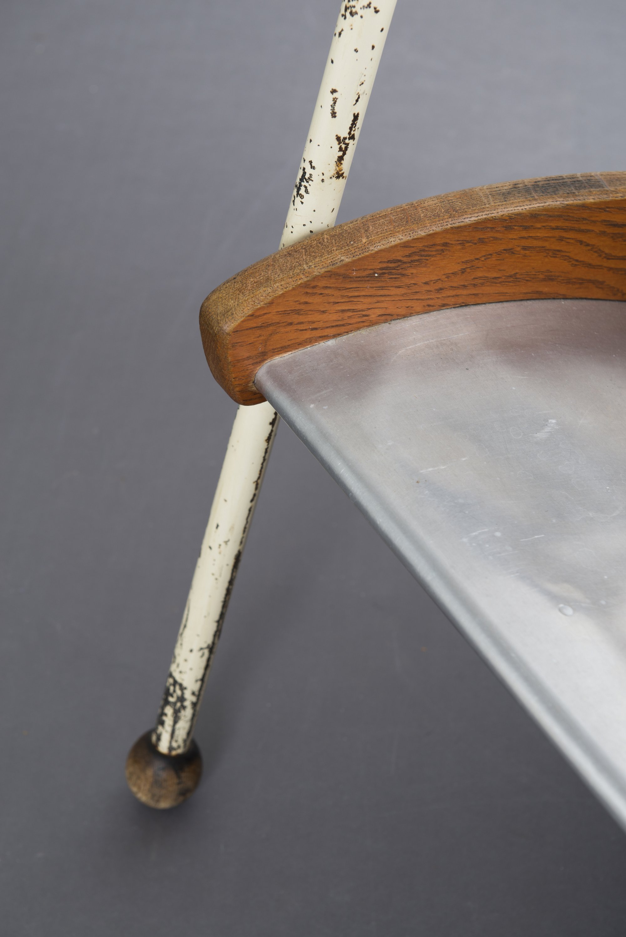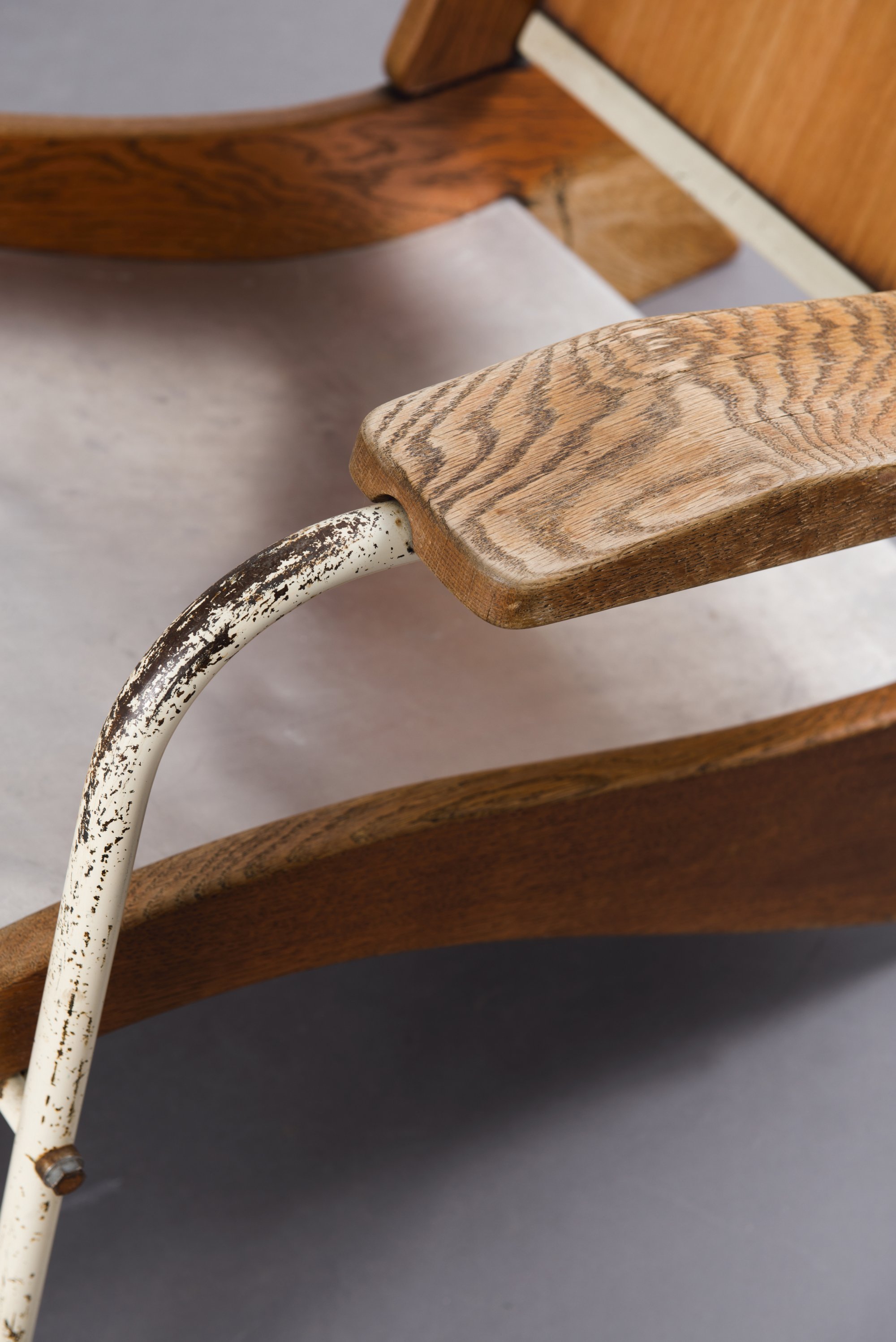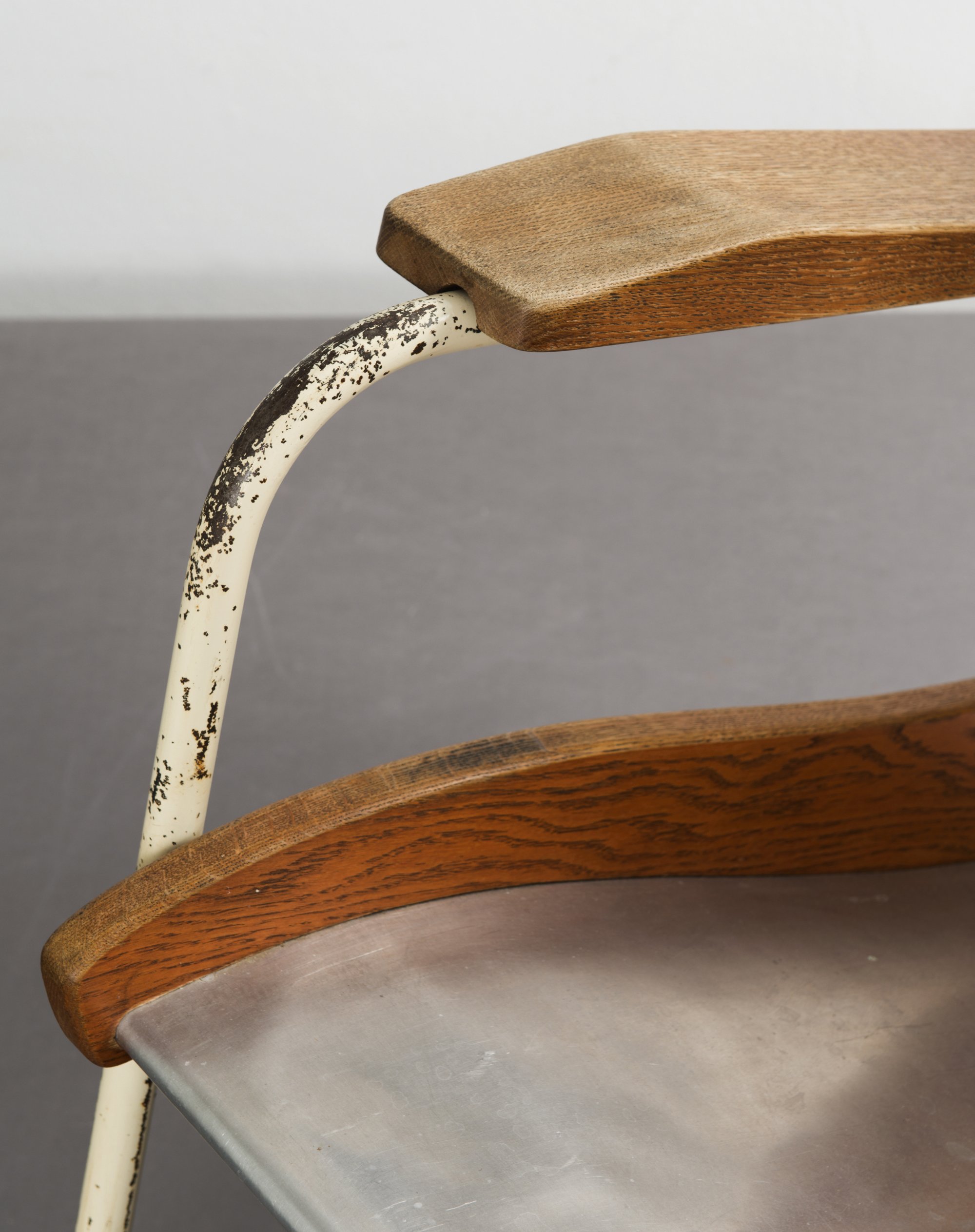 Jean Prouvé. 'Visiteur kangaroo FV 22' lounge chair, 1948. H. 82,5 x 71 x 91 cm. Made by Ateliers Jean Prouvé, Nancy. Tubular steel, painted white, sheet aluminium, part white, oak, plywood.