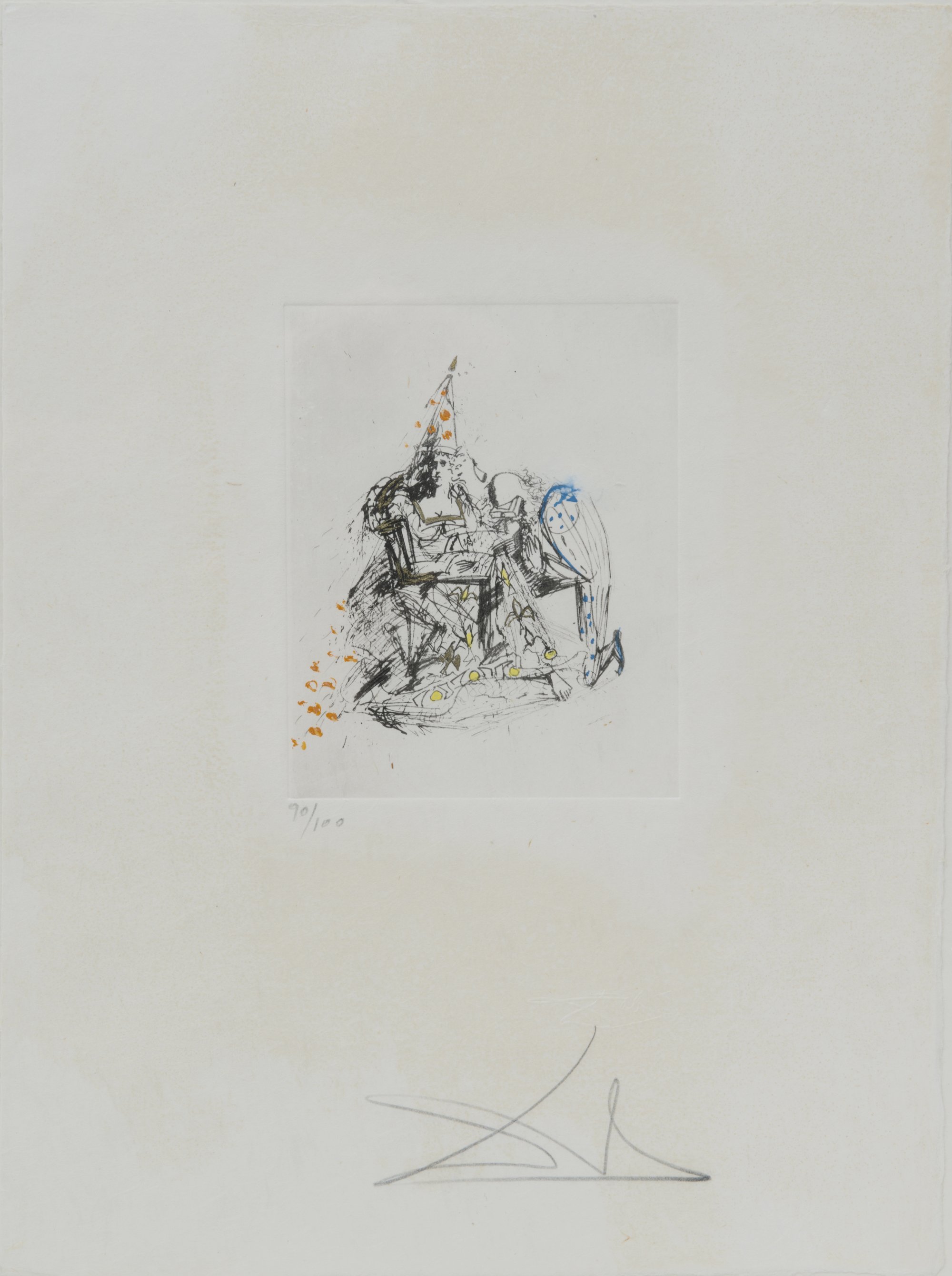 Salvador Dalí. Vignette from 'Vénus aux fourrures', 1969. 15.0 x 12.0 cm (depiction), 38.0 x 28.5 cm (paper). Drypoint and roulette, hand-coloured on Japan paper. Signed: Dalí, numbered, Dalí embossing. No. 90 from an edition of 100. Verso: Gallery stamp Christine Weiden, Amberg. Glass frame.