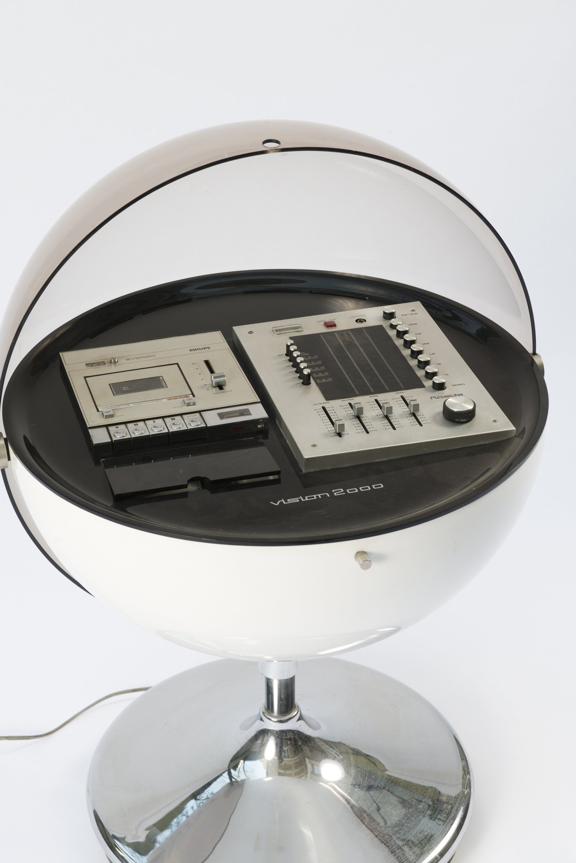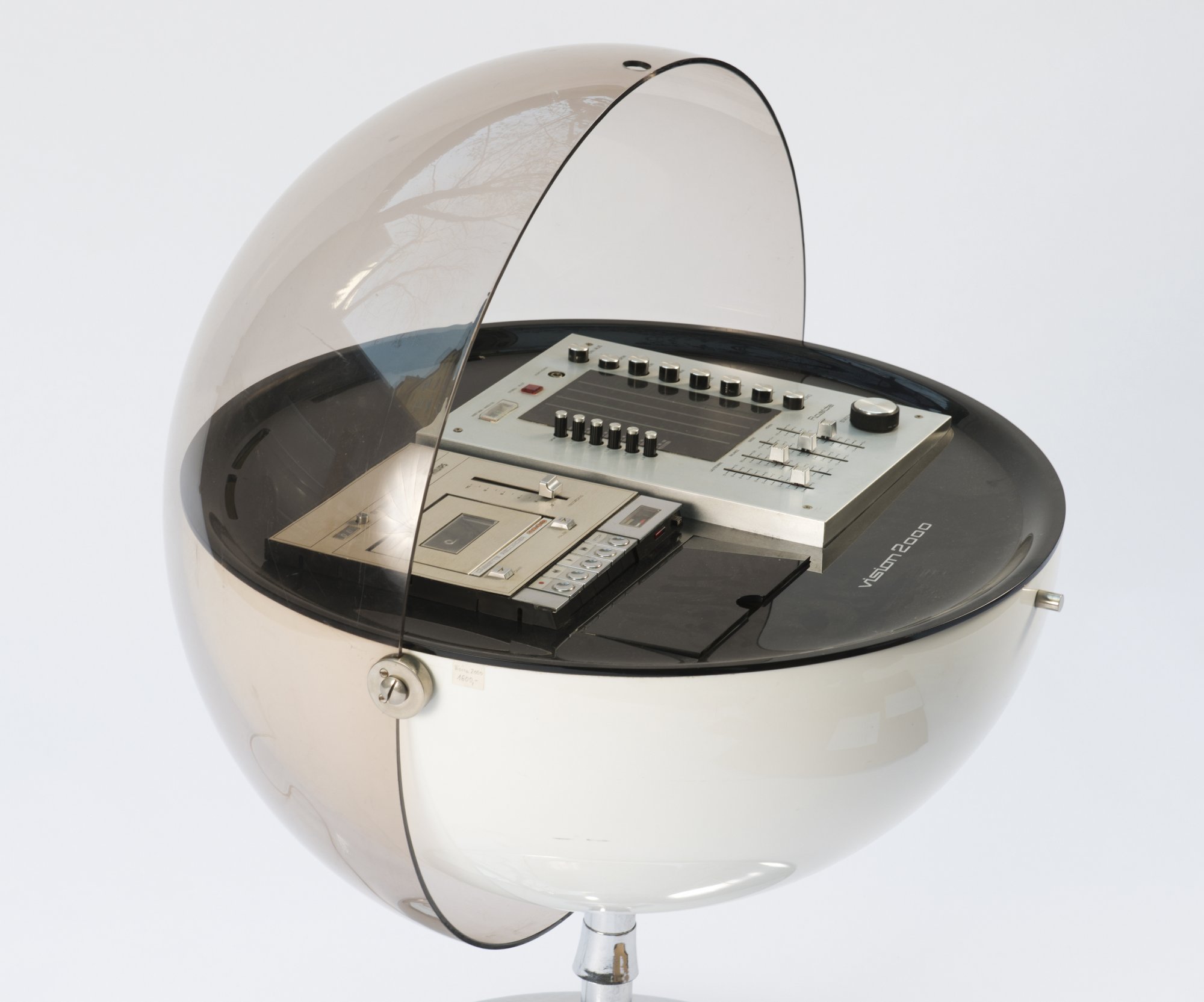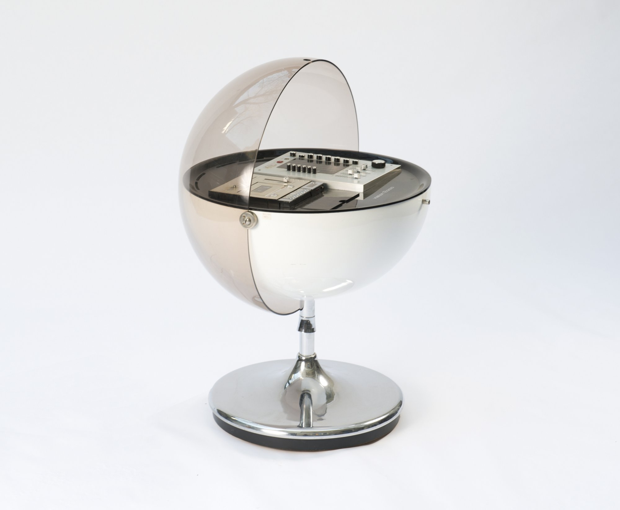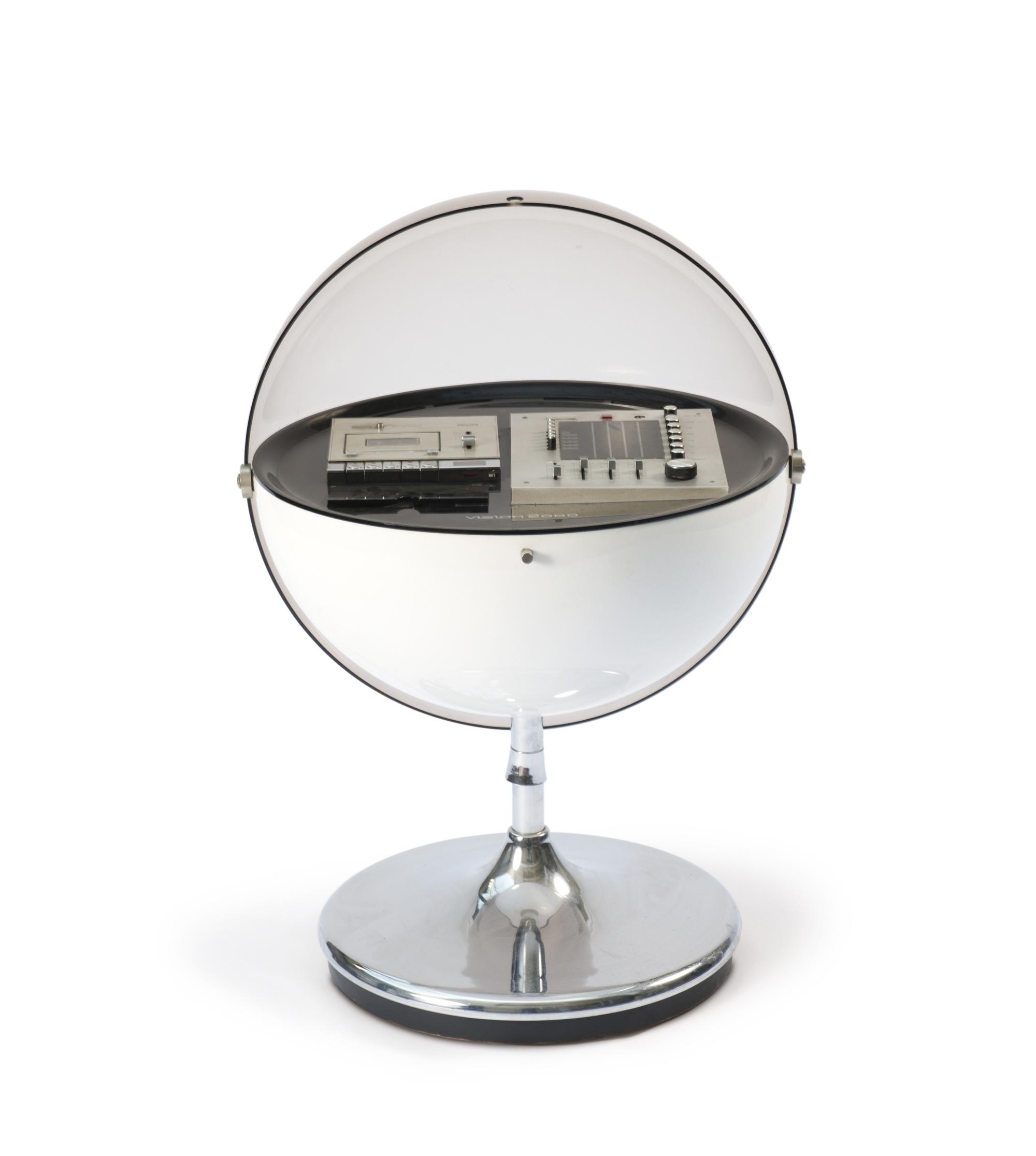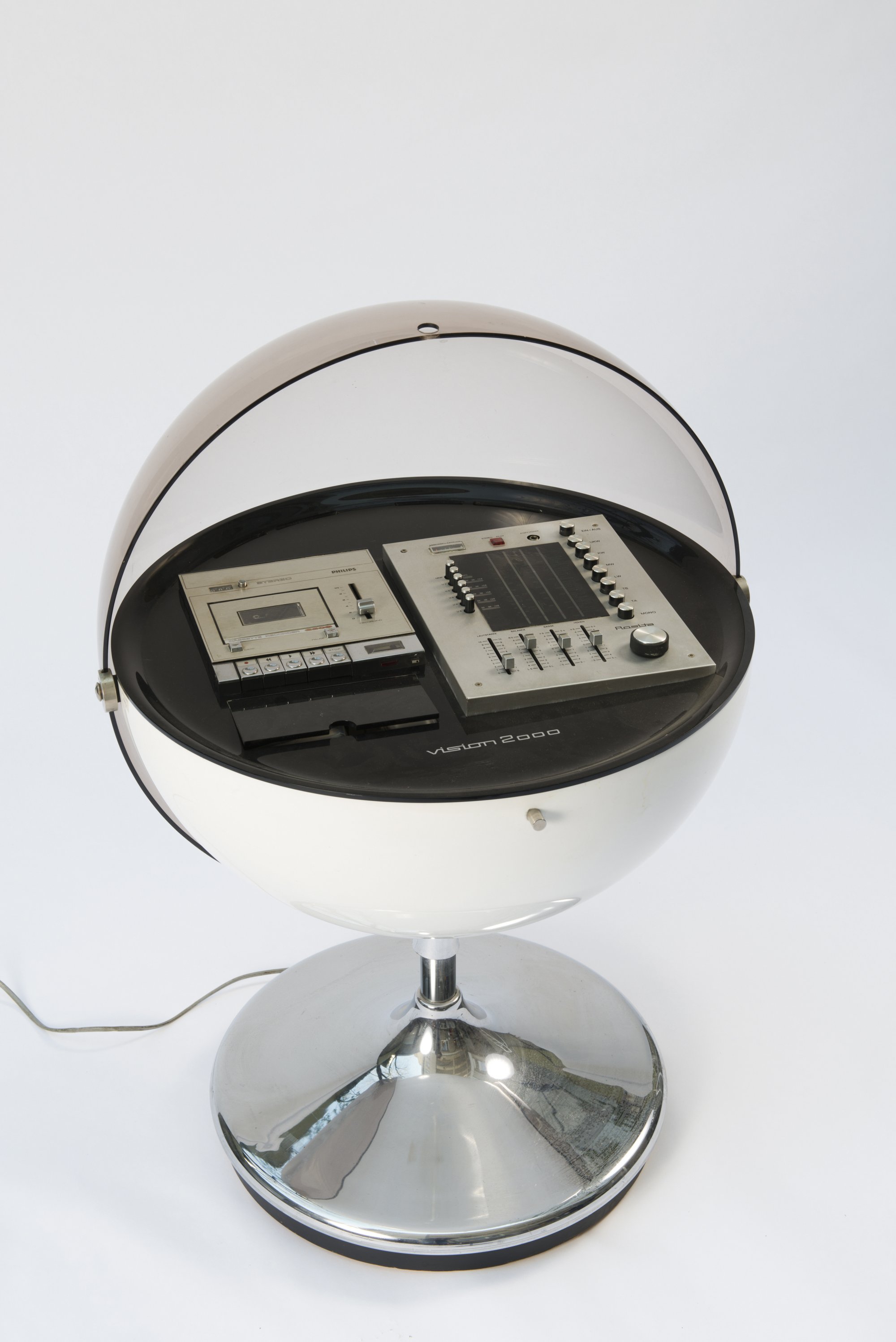Thilo Oerke. 'Vision 2000' stereo system, c1971. H. 91 cm; D. 64 cm. Made by Rosita Tonmöbel, Germany, in the early 1970s. Chrome-plated plastic, part white, black plastic inside. Perspex lid. Radio and tape player. Marked: VISION 2000.