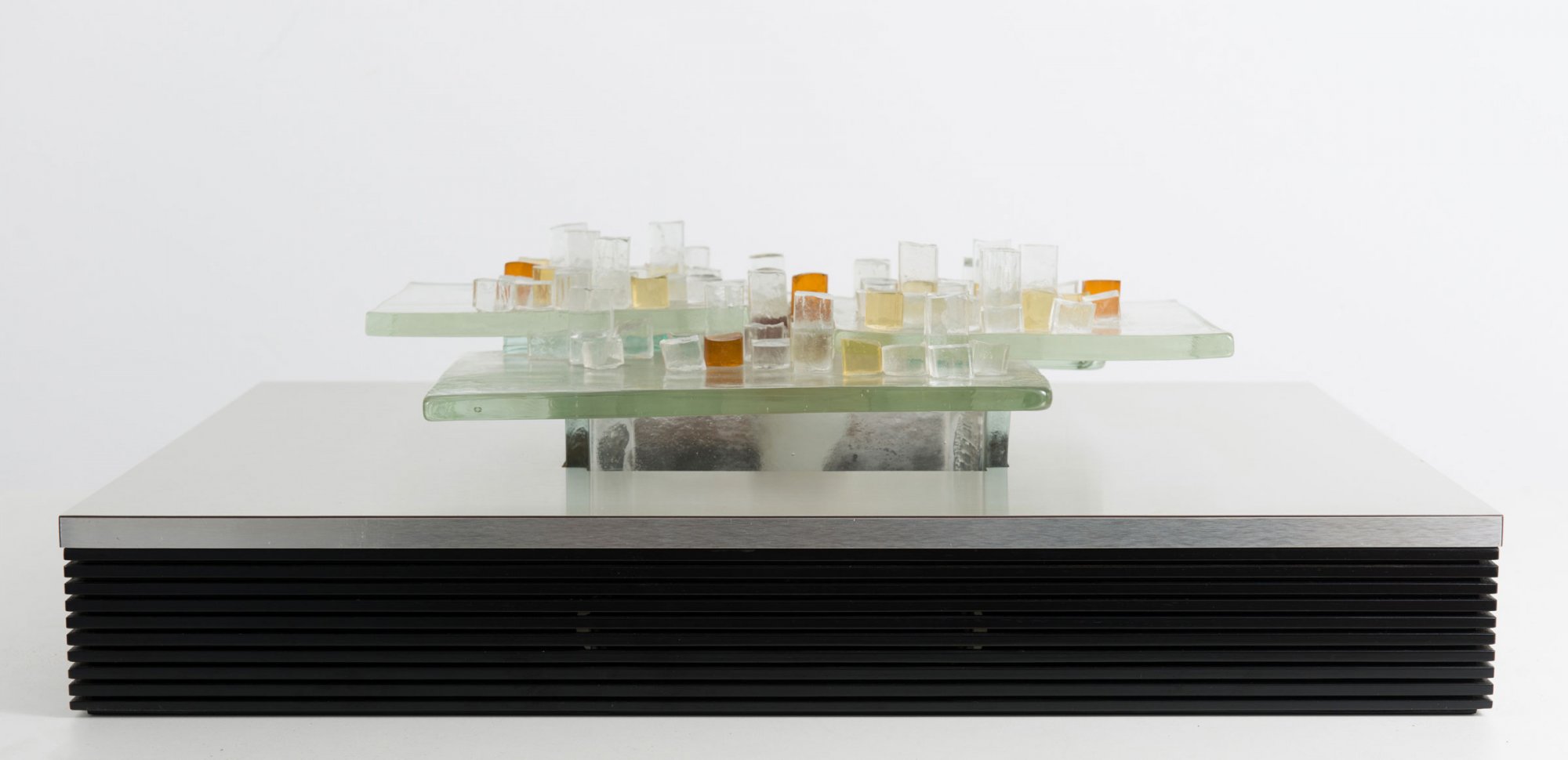 Aki Kaze (in the style of). Two wall sconces with integrated loudspeakers, c1970. H. 51 x 66 x 9 cm. Made by Poliarte, Vicenza. Chipboard, sheet aluminium, glass, clear, yellow and amber.