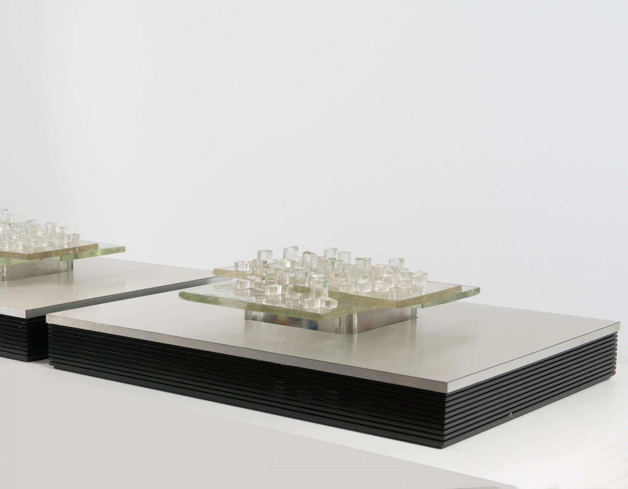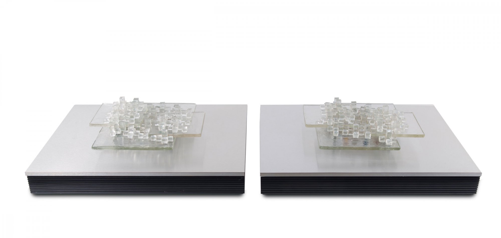 Aki Kaze (in the style of). Two wall sconces with integrated loudspeakers, c1970. H. 59.5 x 78 x 22 cm. Made by Poliarte, Vicenza. Chipboard, sheet aluminium, glass, clear.