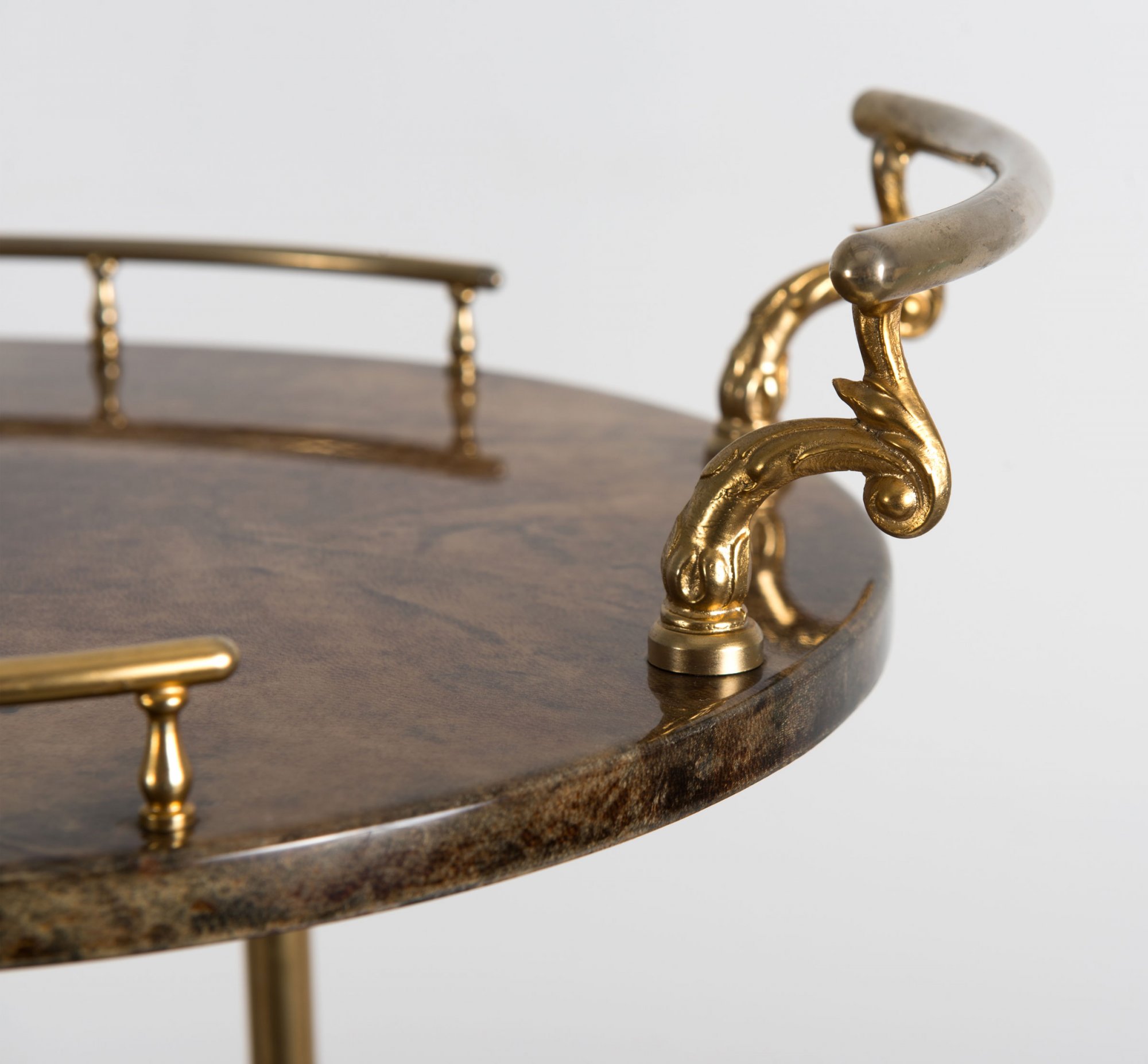 Aldo Tura. Serving cart, 1950s. H. 74.5 x 85 x 40 cm. Made by Tura, Milan. Tubular brass, wood, covered with brown kid leather, clear lacquer, wheels.