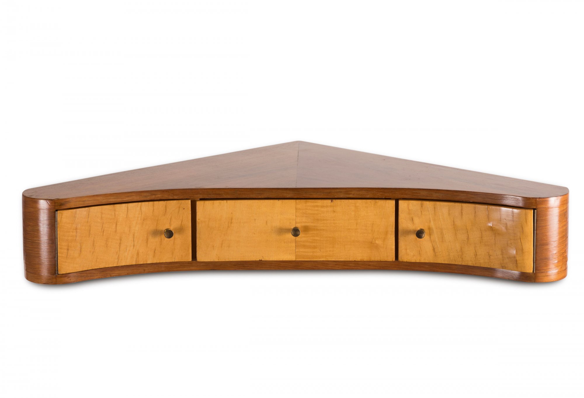 Italy. Corner console, 1930/40s. H. 16 x 98.5 x 51 cm. Wooden construction, nut and maple veneers, brass fittings.