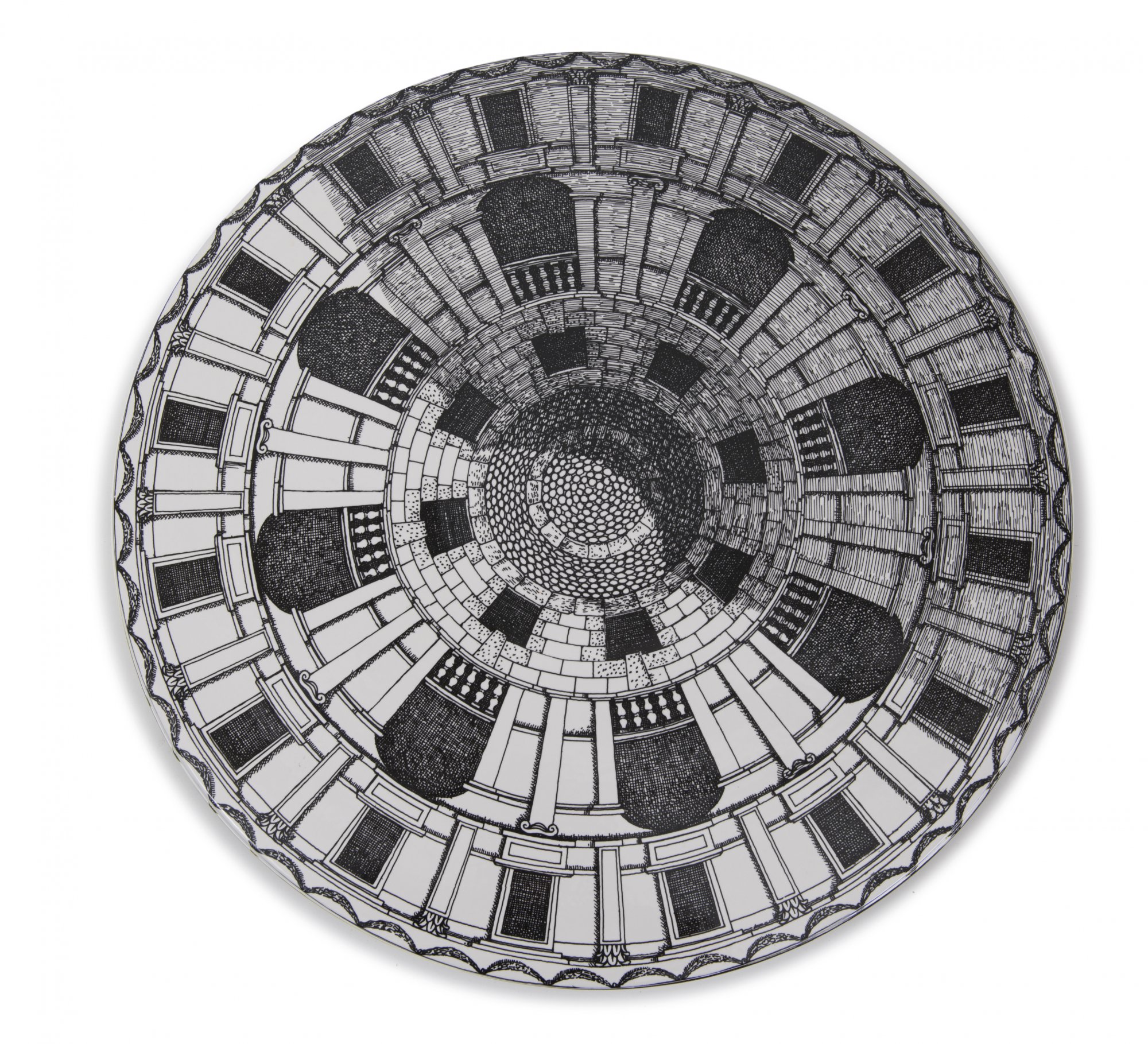Piero Fornasetti. 'Architettonico' table top, 2010. D. 62 cm. Made by Bitossi, Montelupo. Earthenware, glazed white, black print. Marked: Maker's mark.
